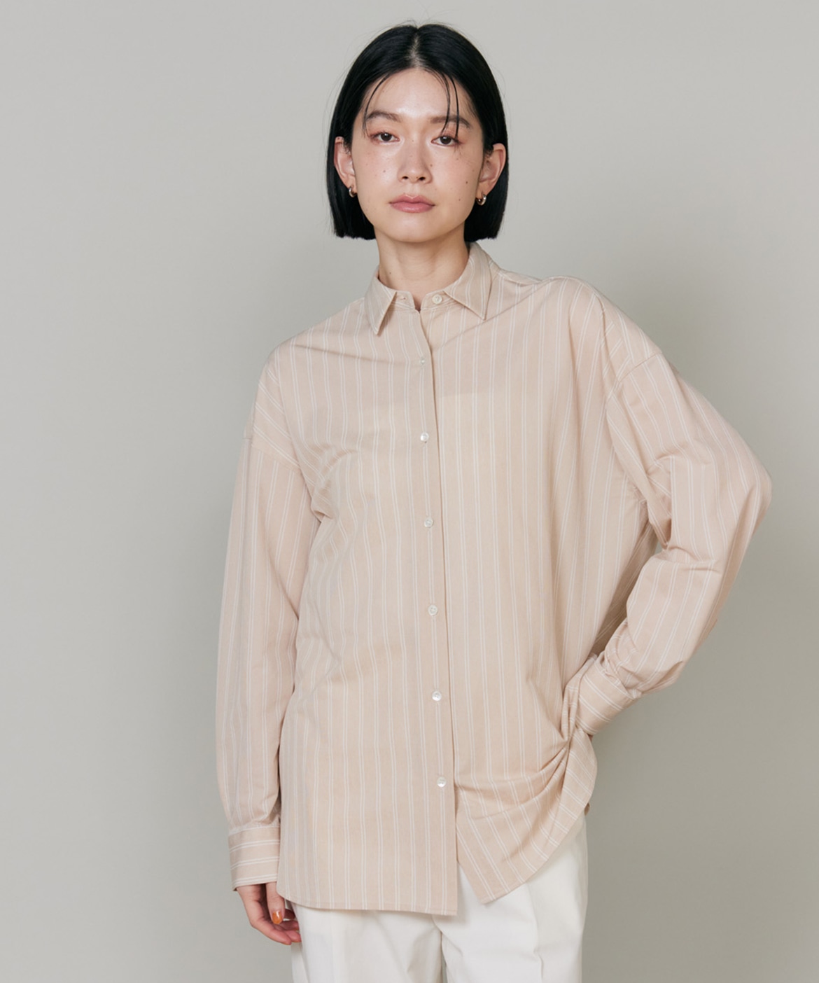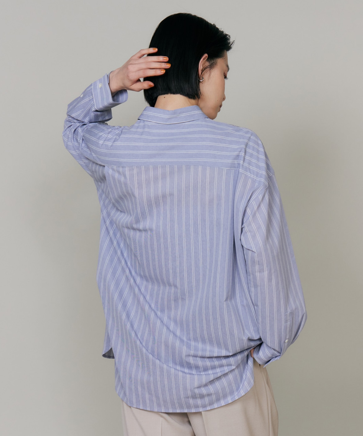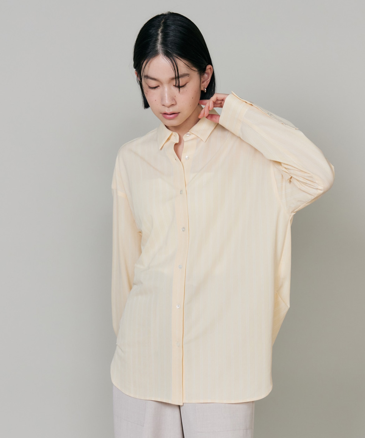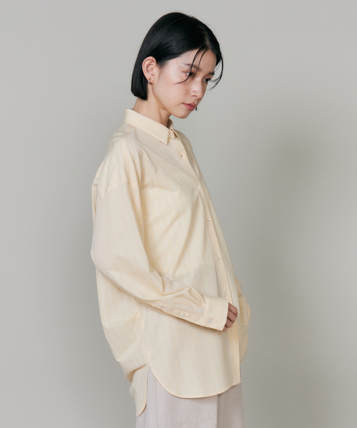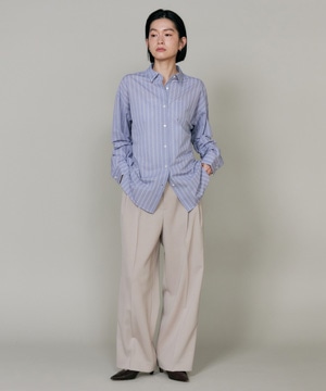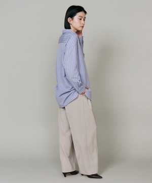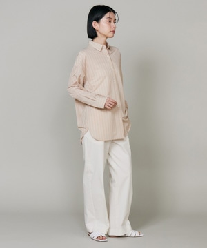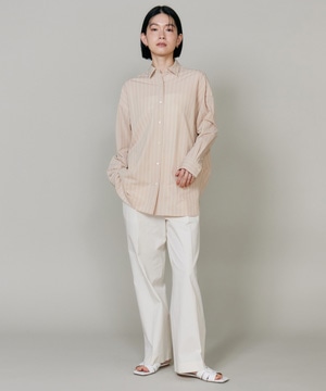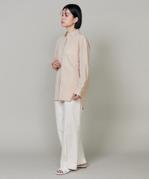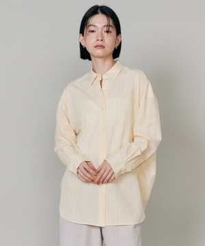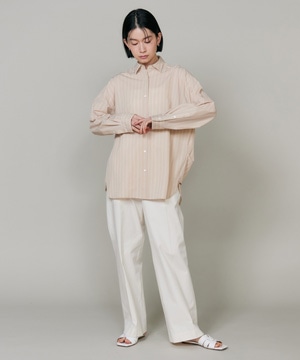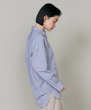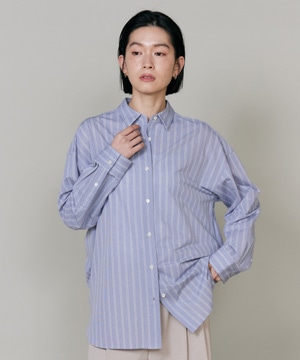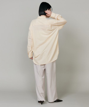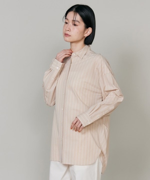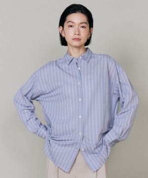 ハイゲージジャージを使用したオーバーサイズシャツ。ストレッチ性のある肌あたりの優しさとドライなタッチが特徴です。強調しすぎないストライプ柄がコーディネートにさり気ないアクセントを与えてくれます。一枚着としてはもちろん、夏の羽織りアイテムとしても汎用性のある一枚です。