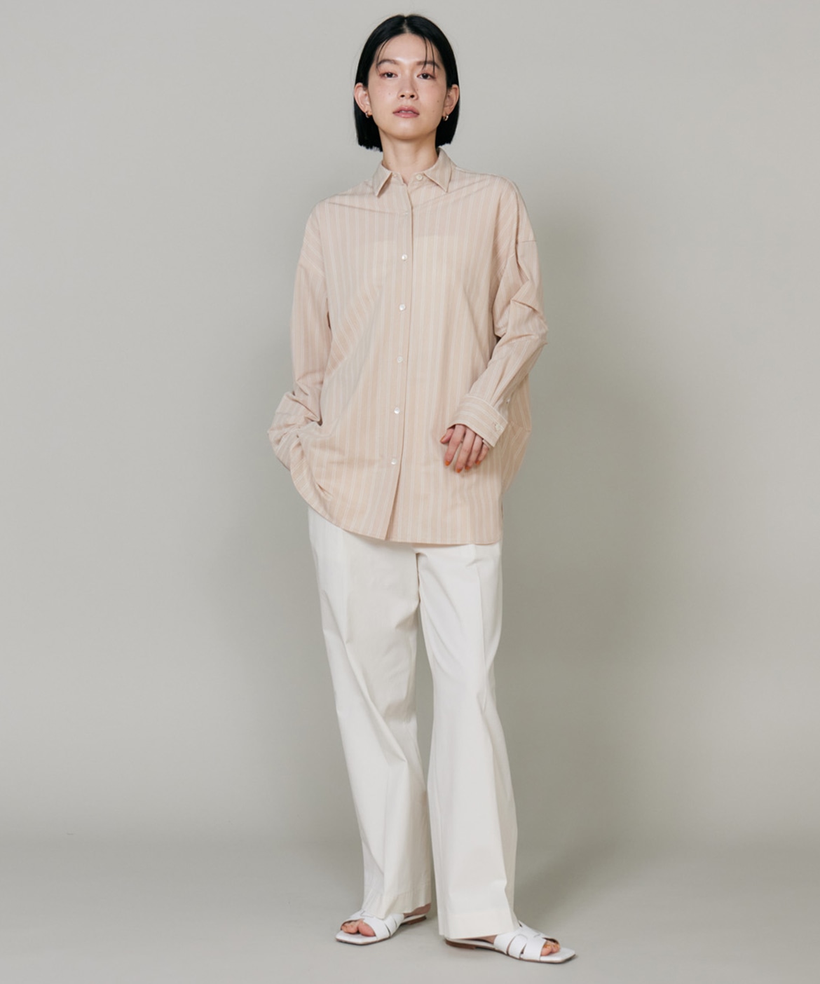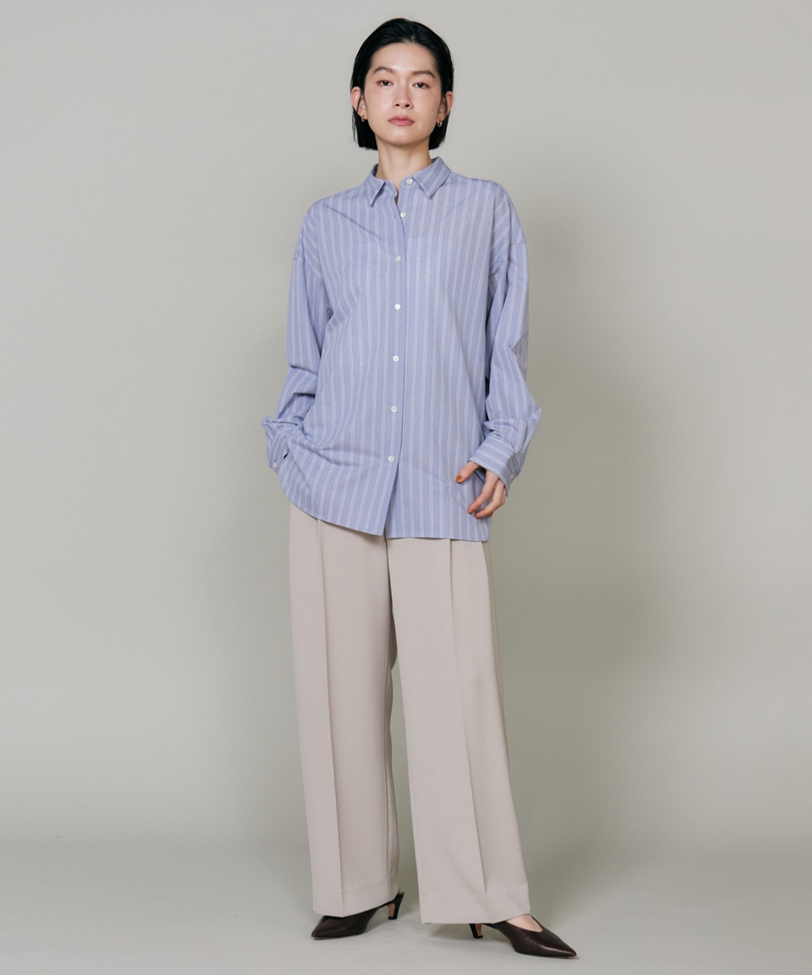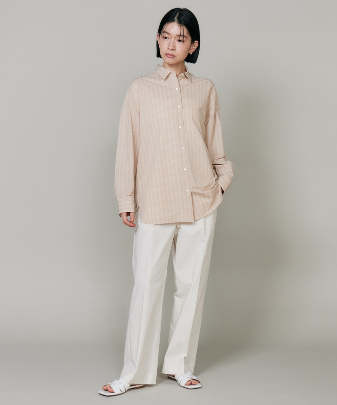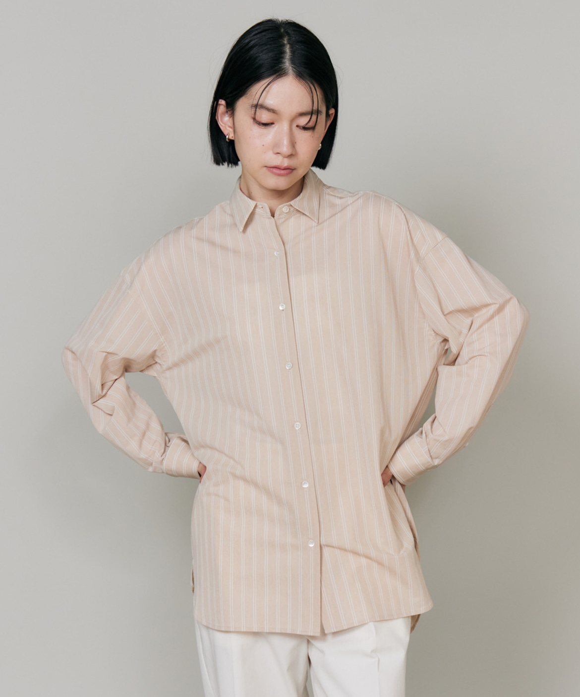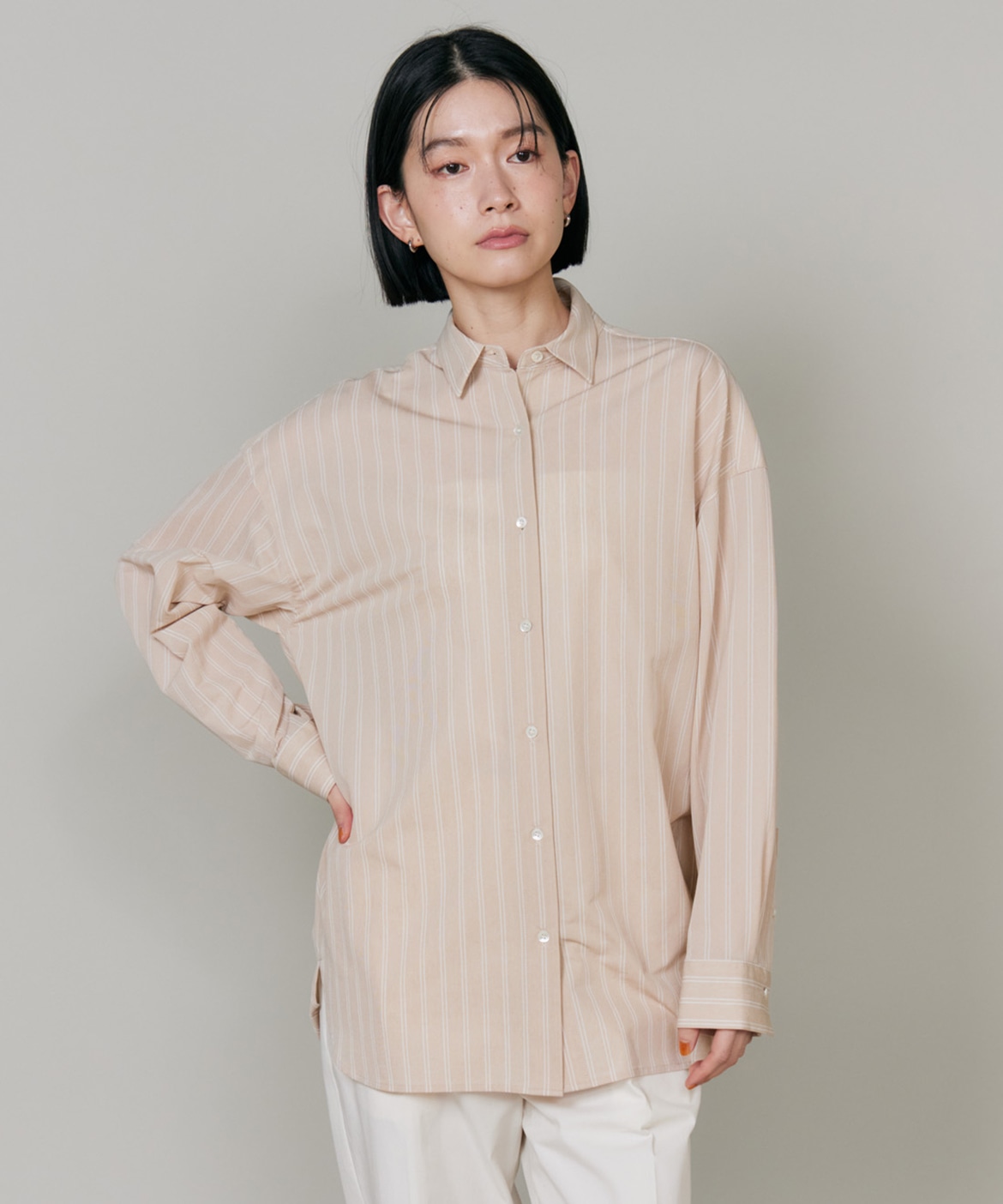 ハイゲージジャージを使用したオーバーサイズシャツ。ストレッチ性のある肌あたりの優しさとドライなタッチが特徴です。強調しすぎないストライプ柄がコーディネートにさり気ないアクセントを与えてくれます。一枚着としてはもちろん、夏の羽織りアイテムとしても汎用性のある一枚です。