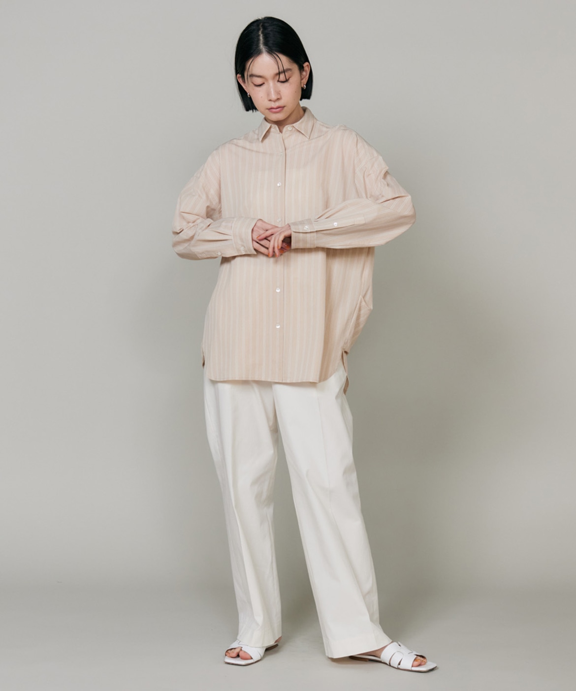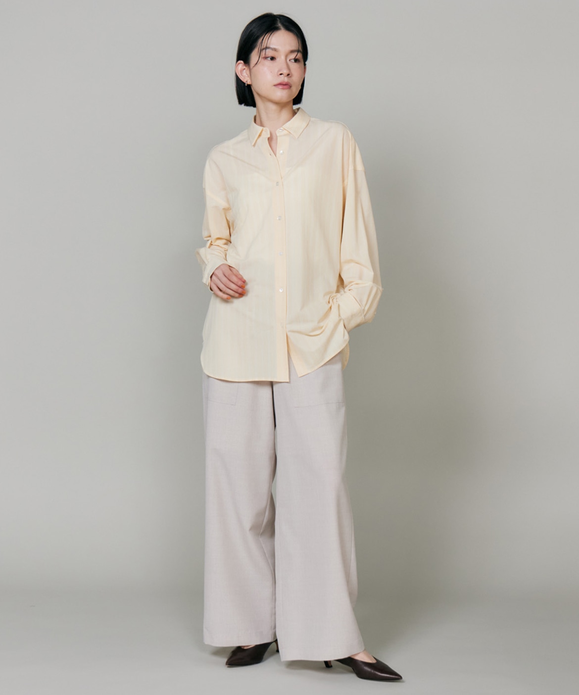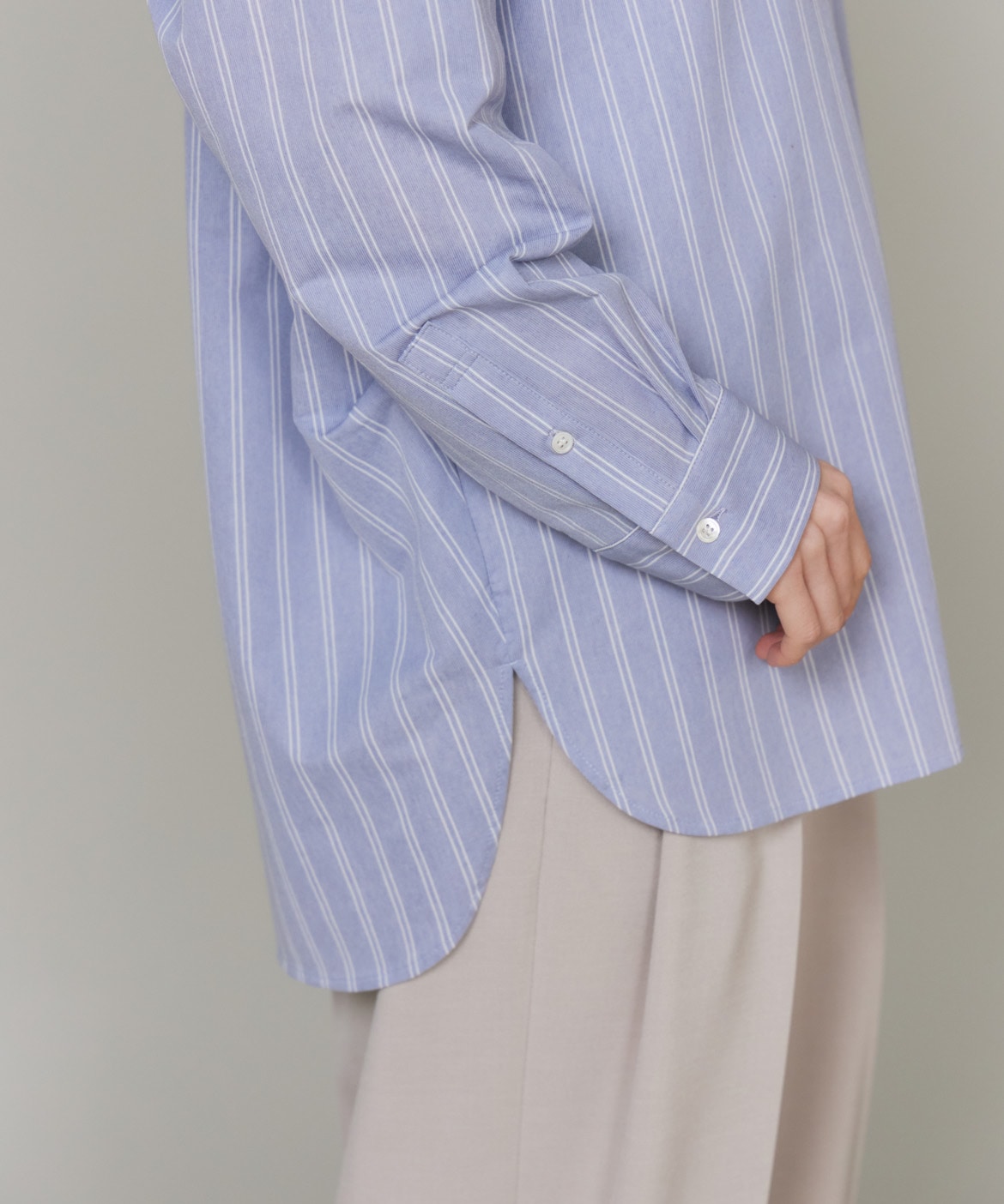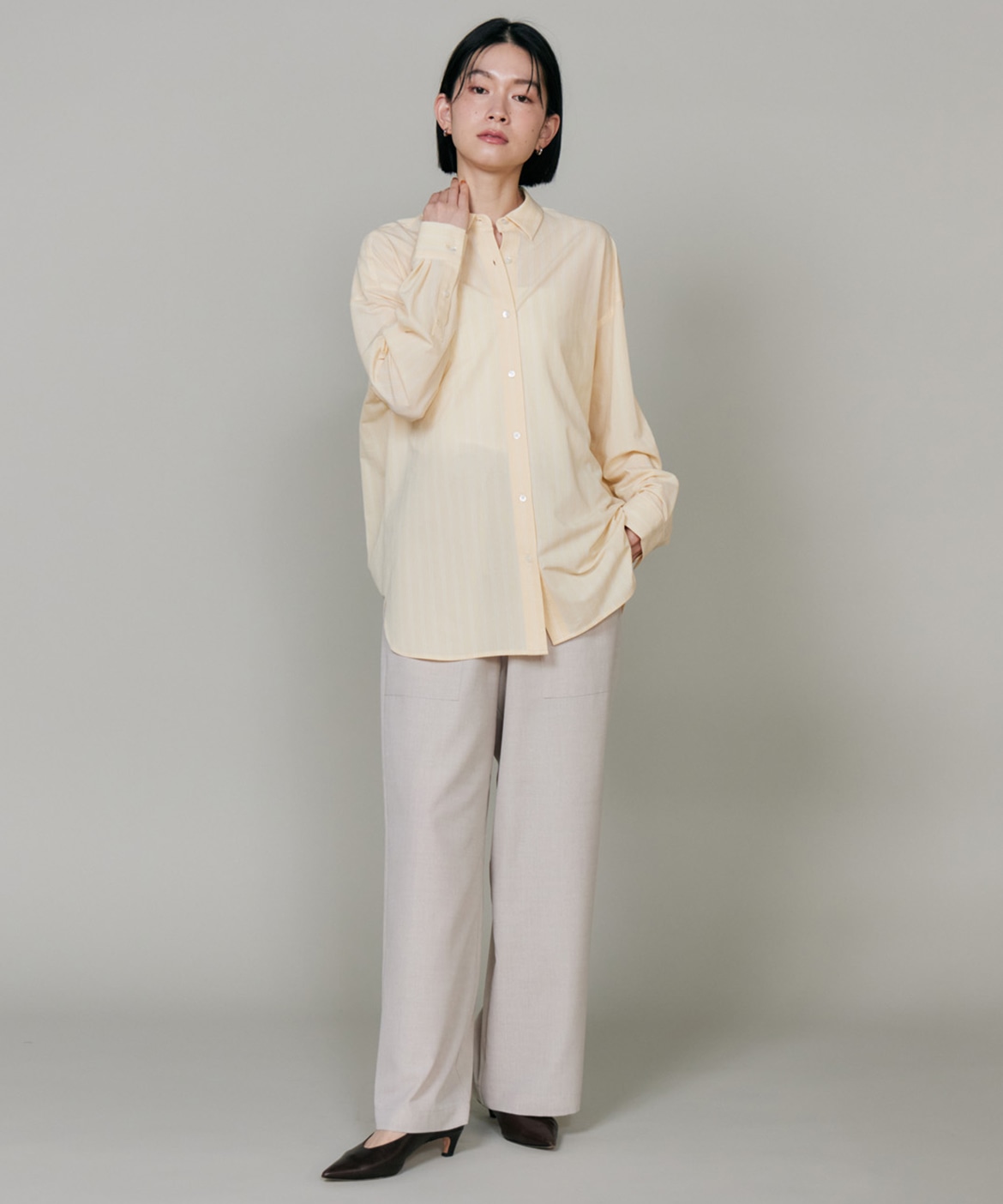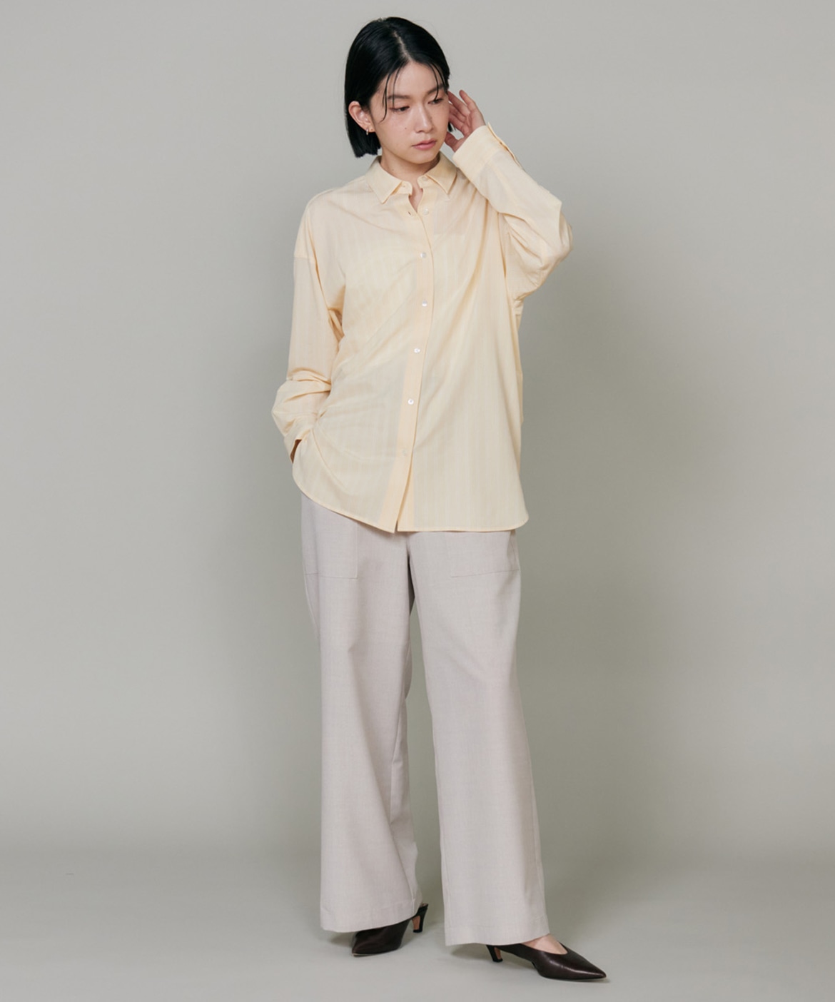 ハイゲージジャージを使用したオーバーサイズシャツ。ストレッチ性のある肌あたりの優しさとドライなタッチが特徴です。強調しすぎないストライプ柄がコーディネートにさり気ないアクセントを与えてくれます。一枚着としてはもちろん、夏の羽織りアイテムとしても汎用性のある一枚です。