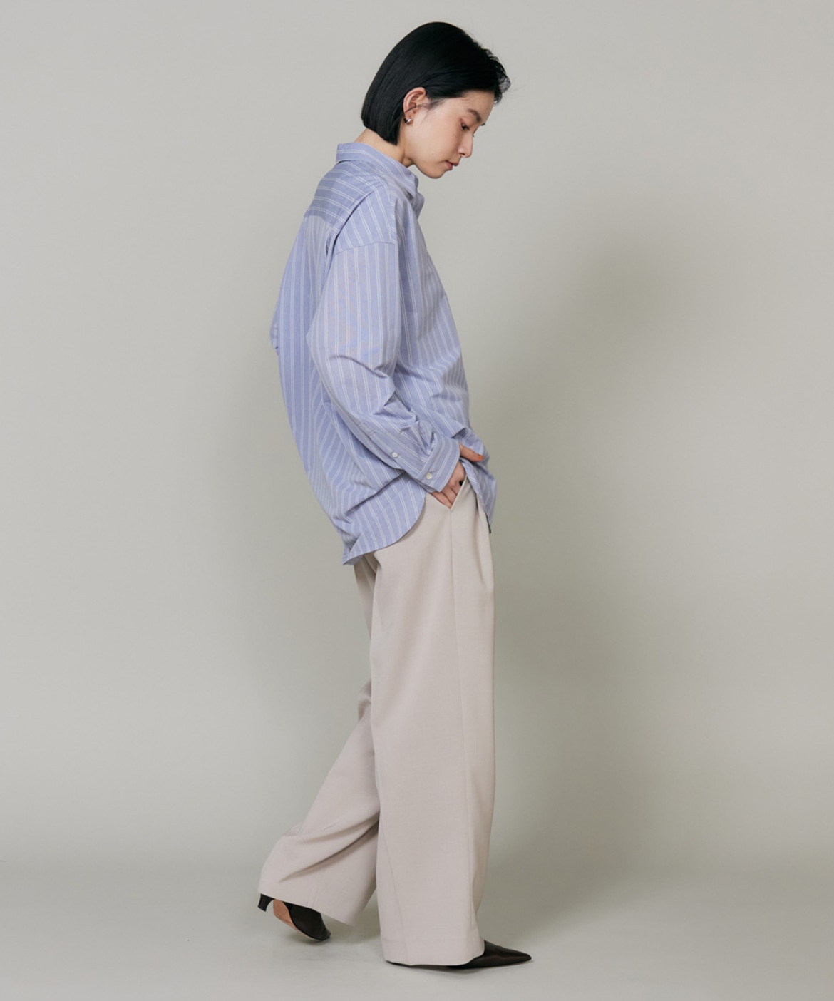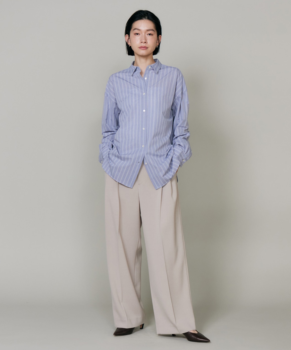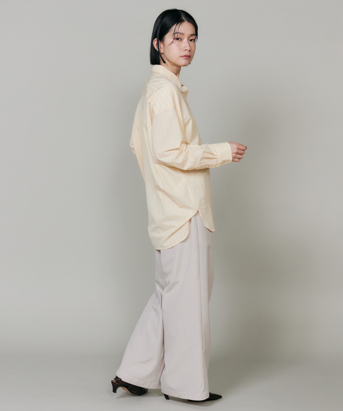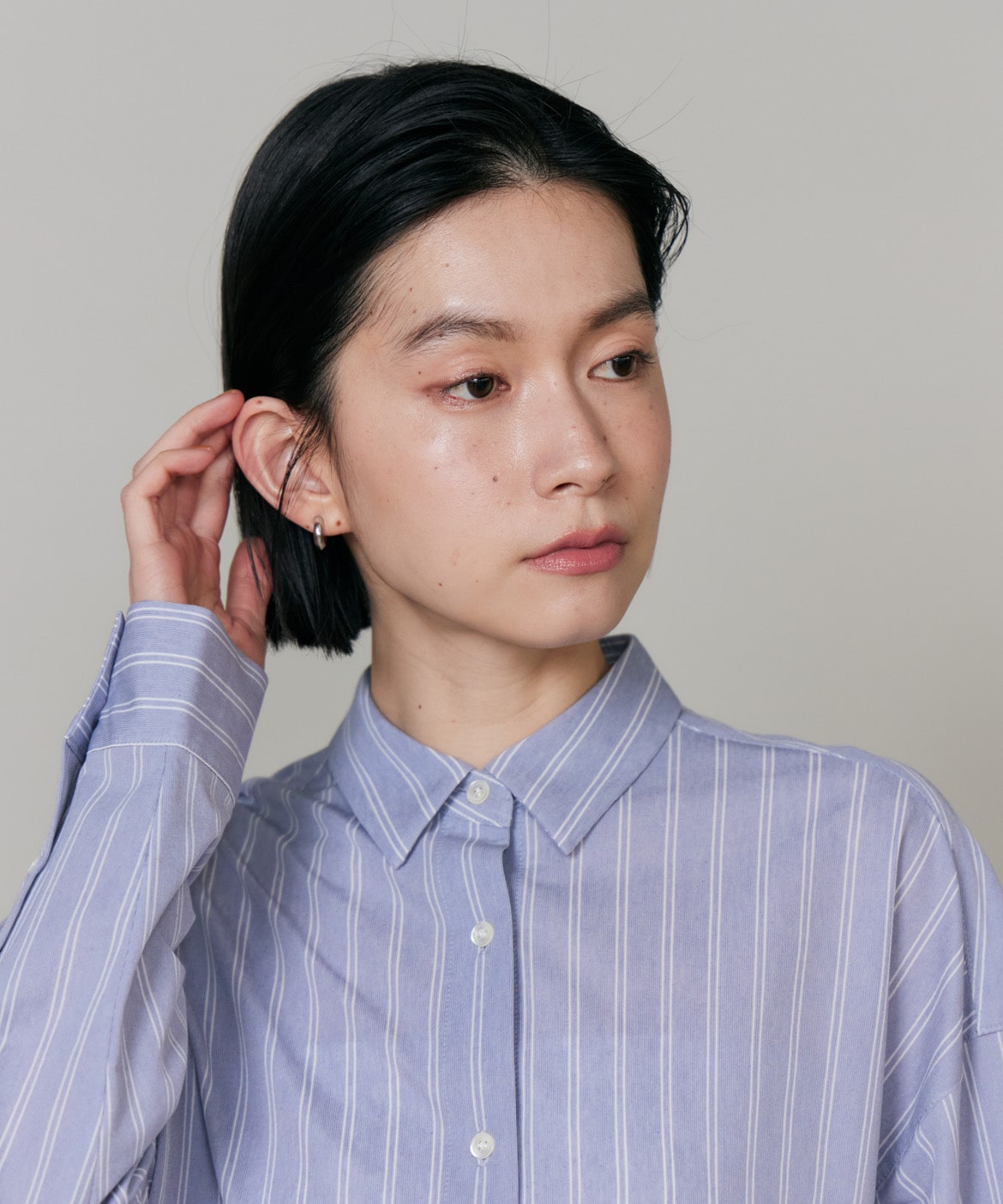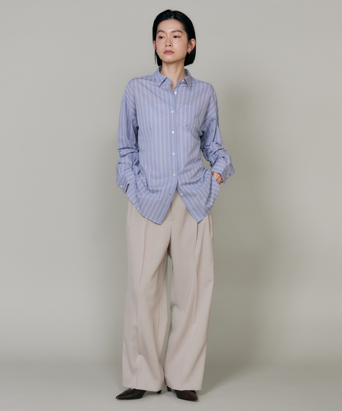 ハイゲージジャージを使用したオーバーサイズシャツ。ストレッチ性のある肌あたりの優しさとドライなタッチが特徴です。強調しすぎないストライプ柄がコーディネートにさり気ないアクセントを与えてくれます。一枚着としてはもちろん、夏の羽織りアイテムとしても汎用性のある一枚です。