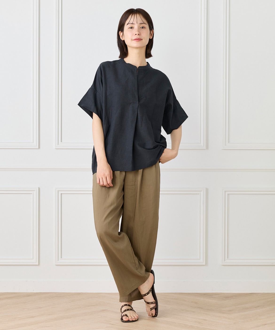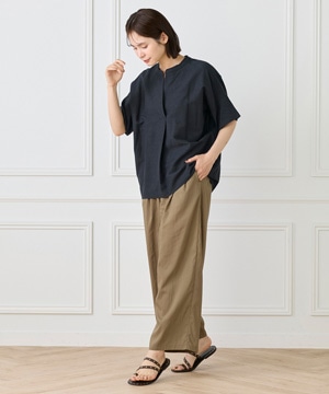 タテ糸にレーヨン、ヨコ糸に綿とリネンを組み合わせることにより、ハリ感の中に優しいドレープ感を感じる素材です。仕上げでは強めのワッシャータンブラーを施し、レーヨンのエレガントさと綿、麻のナチュラルな雰囲気を併せもった素材です。