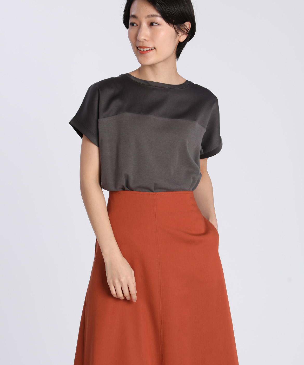 丸みのあるワイドシルエットで女性らしい印象を引き立てる、サテン切り替えのドルマンプルオーバーカットソー。二の腕、ボディラインが出にくいサイズ感に拘りました。サテン地の切り替えや、バックスタイルのタック、ニュアンスのあるヘムライン等のディテール使いにより、着心地の良さと、表情のあるデザイン性を併せ持ったデザインTシャツに仕上げました。