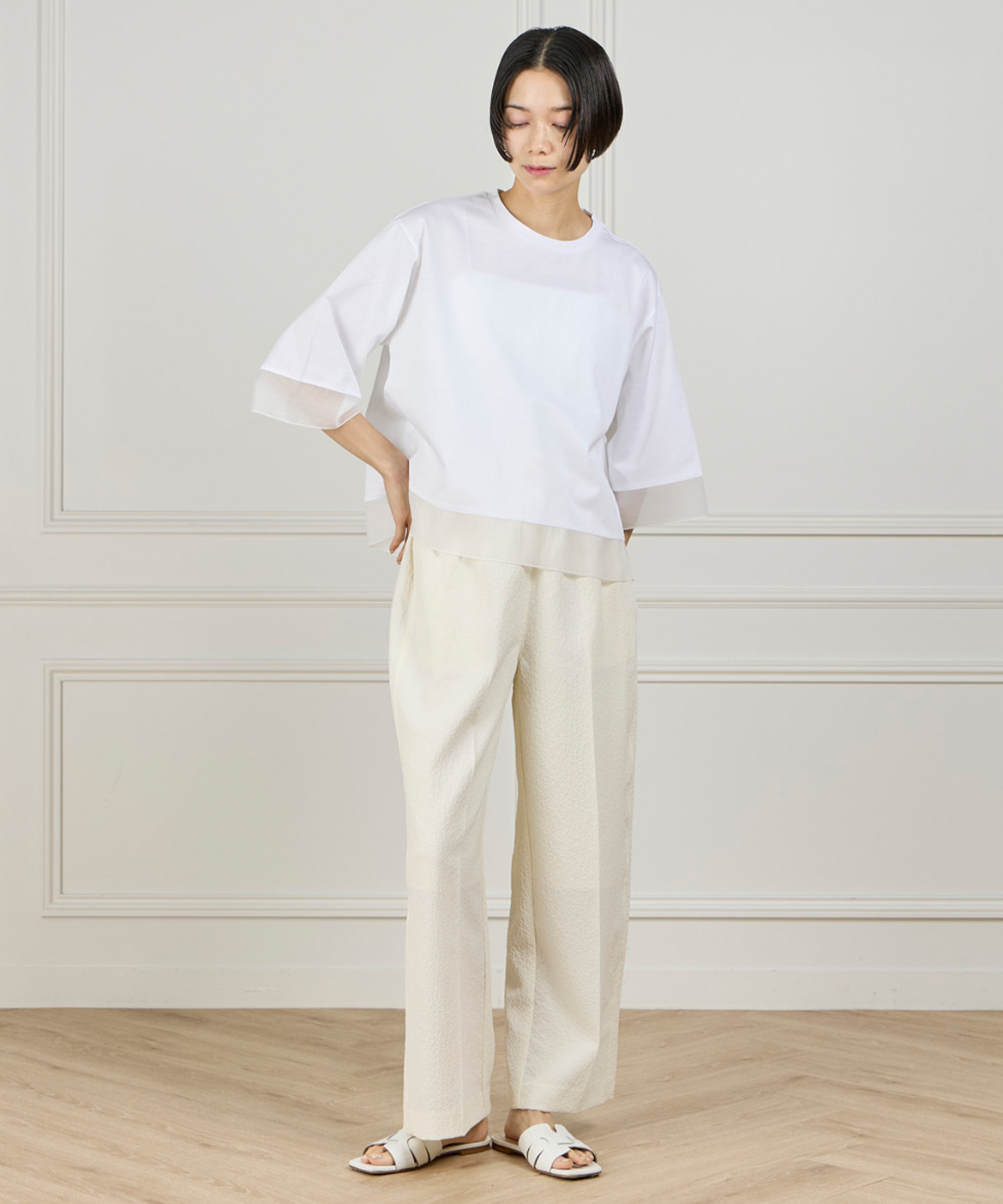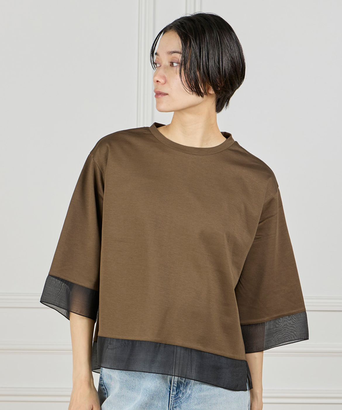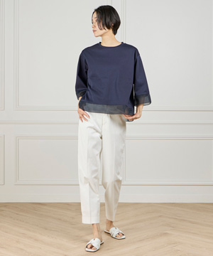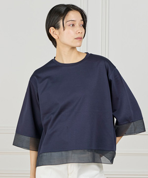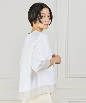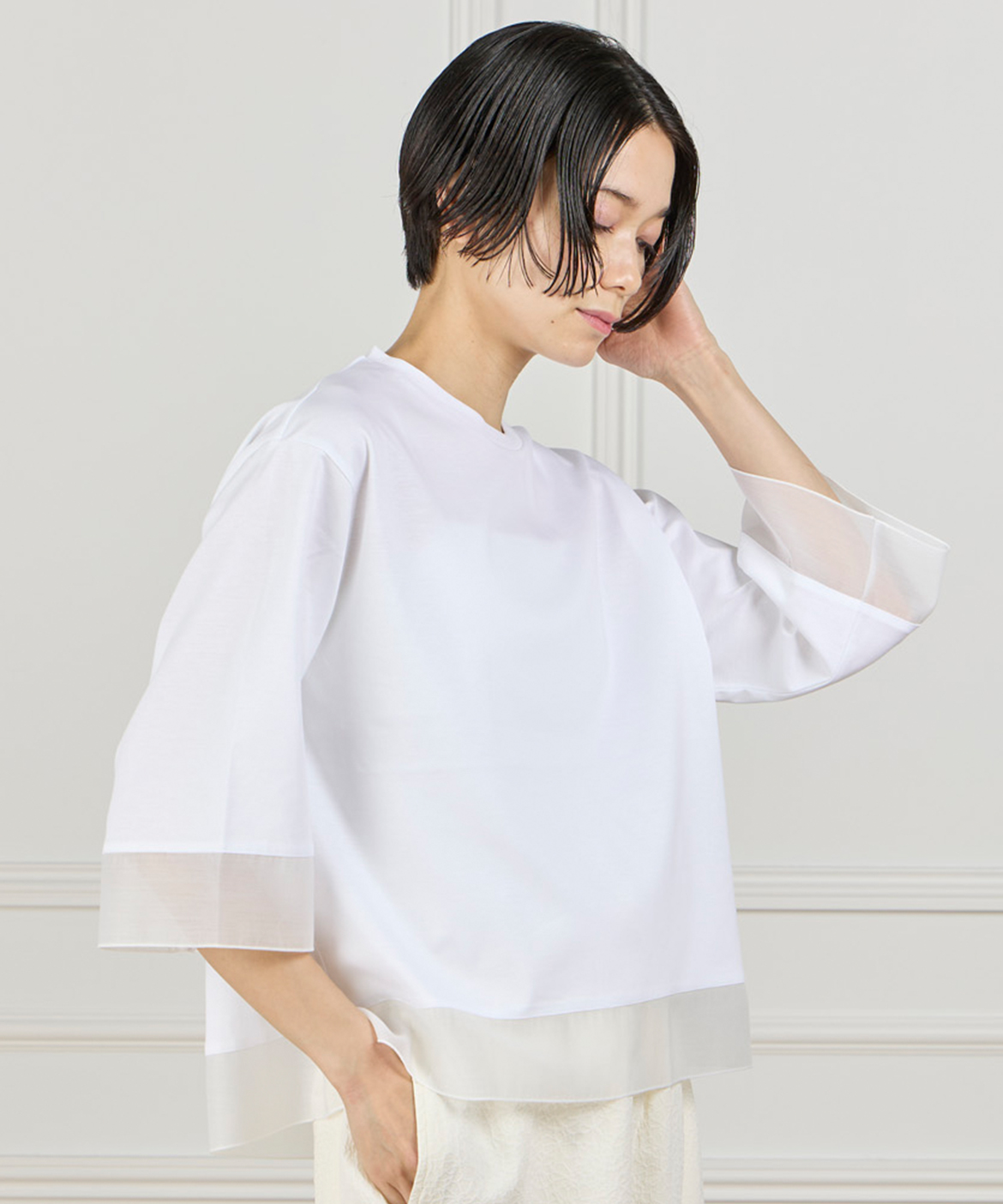 袖口と裾に施されたオーガンジーのシアー素材が軽やかで清涼感のある印象を演出。後ろ身頃に少しだけボリュームを出すパターンテクニックにより、サイド、バックからの見え方にも立体感を作り、シンプルなシルエットながらデザイン性のある、一枚で華やかさをプラスしてくれるアイテムです。