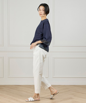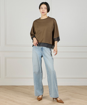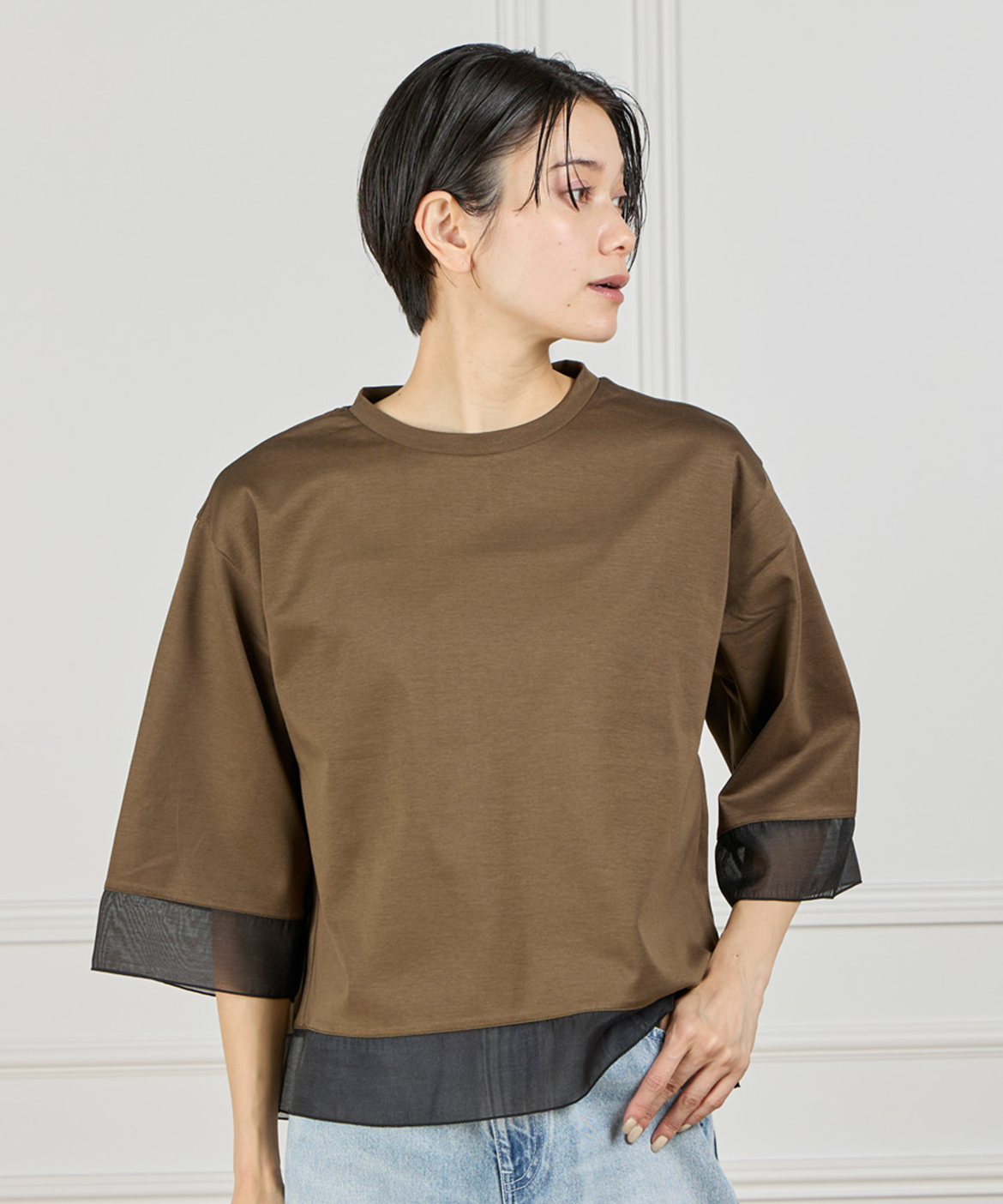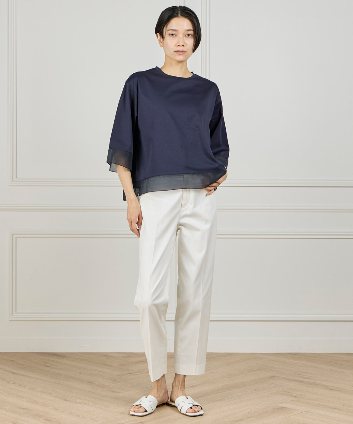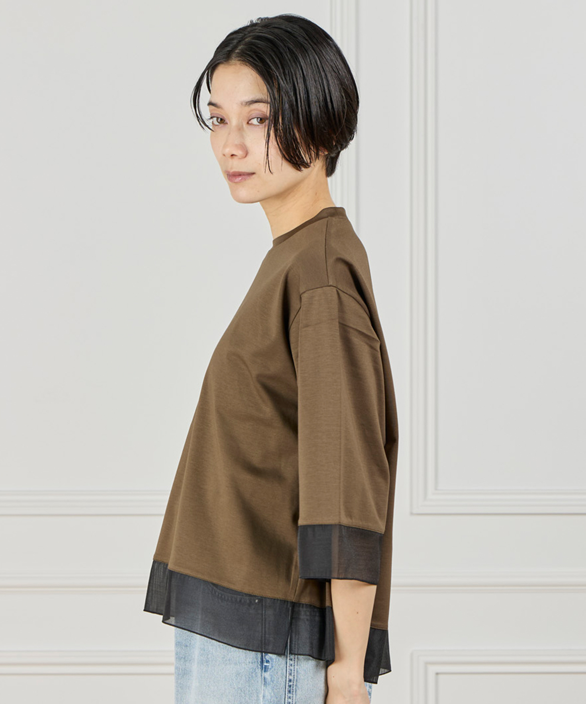 袖口と裾に施されたオーガンジーのシアー素材が軽やかで清涼感のある印象を演出。後ろ身頃に少しだけボリュームを出すパターンテクニックにより、サイド、バックからの見え方にも立体感を作り、シンプルなシルエットながらデザイン性のある、一枚で華やかさをプラスしてくれるアイテムです。