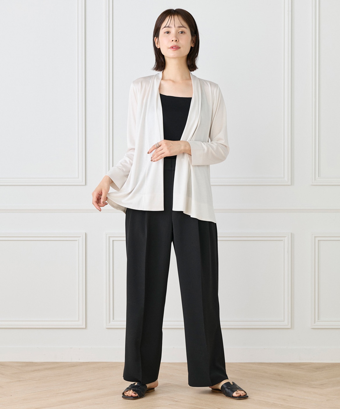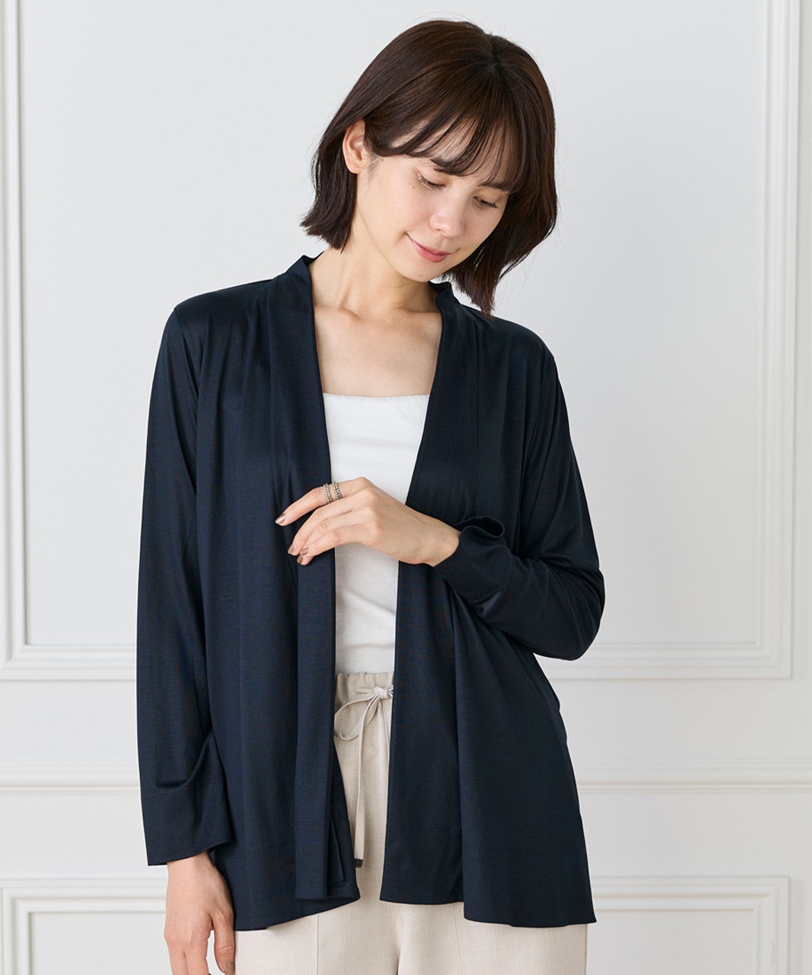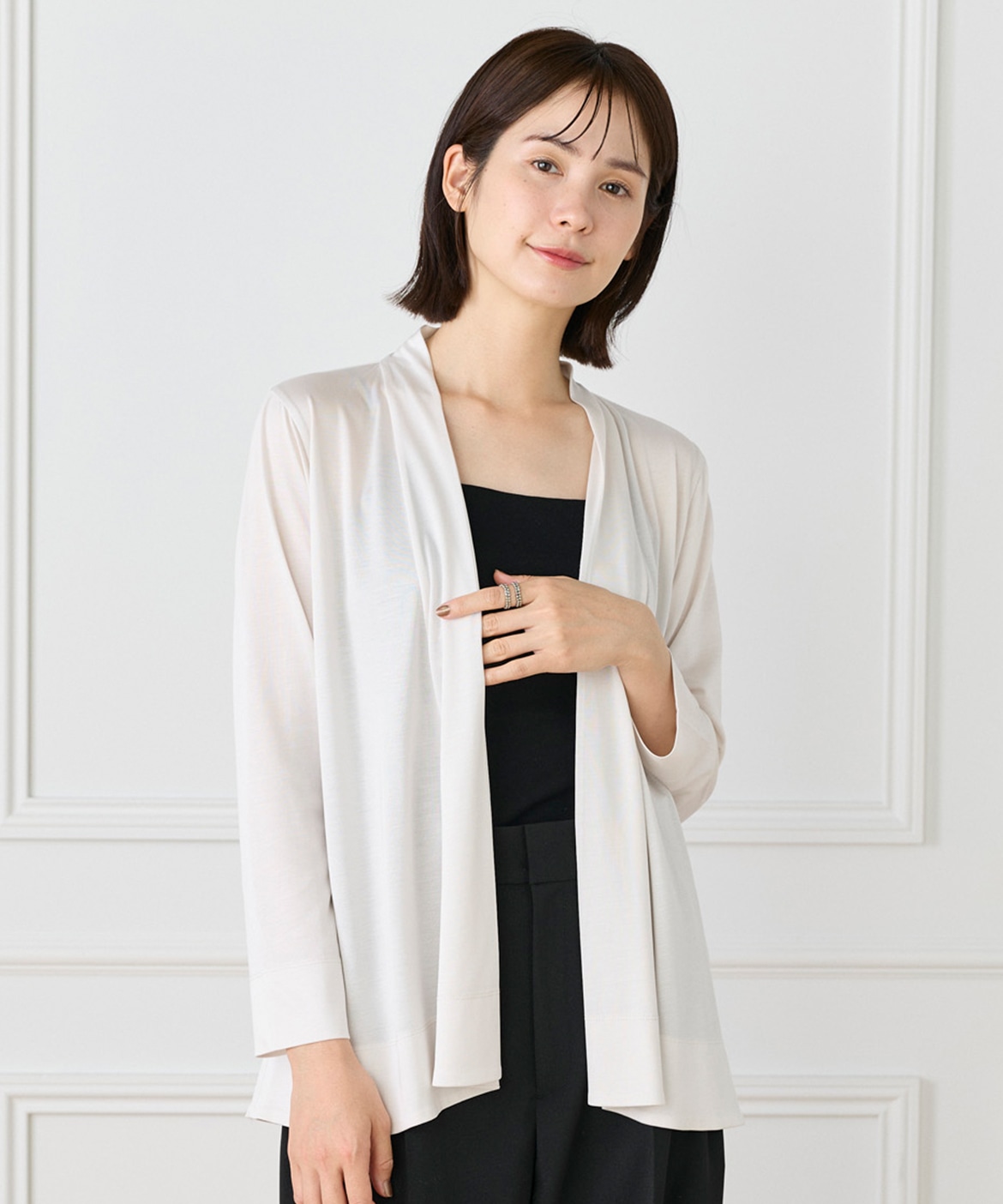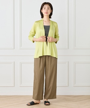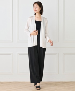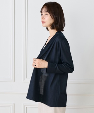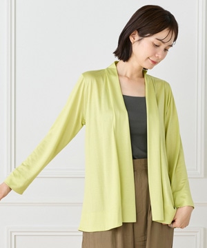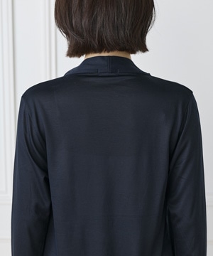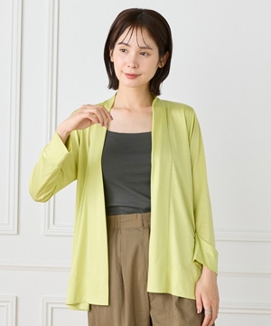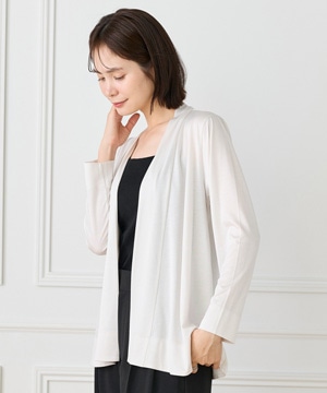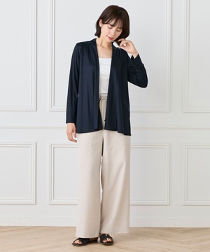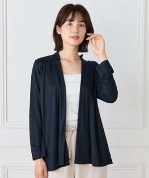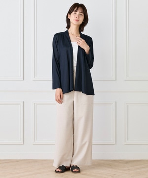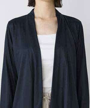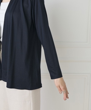 定番のニュアンスカーディガン。ボディラインをカバーする縦に流れる着流しシルエットがポイント。肩は程よいセットインできちんと感もあり、リッチな分量感と表情のある前端のデザインで上品に仕上げました。
