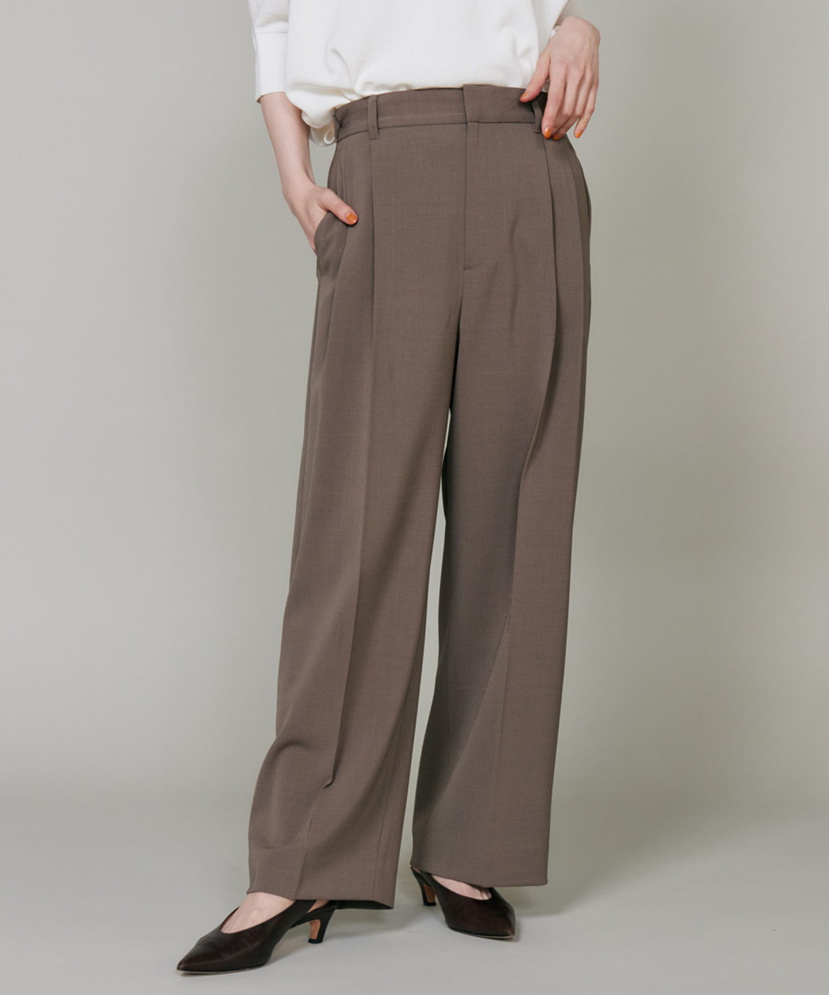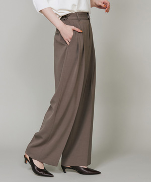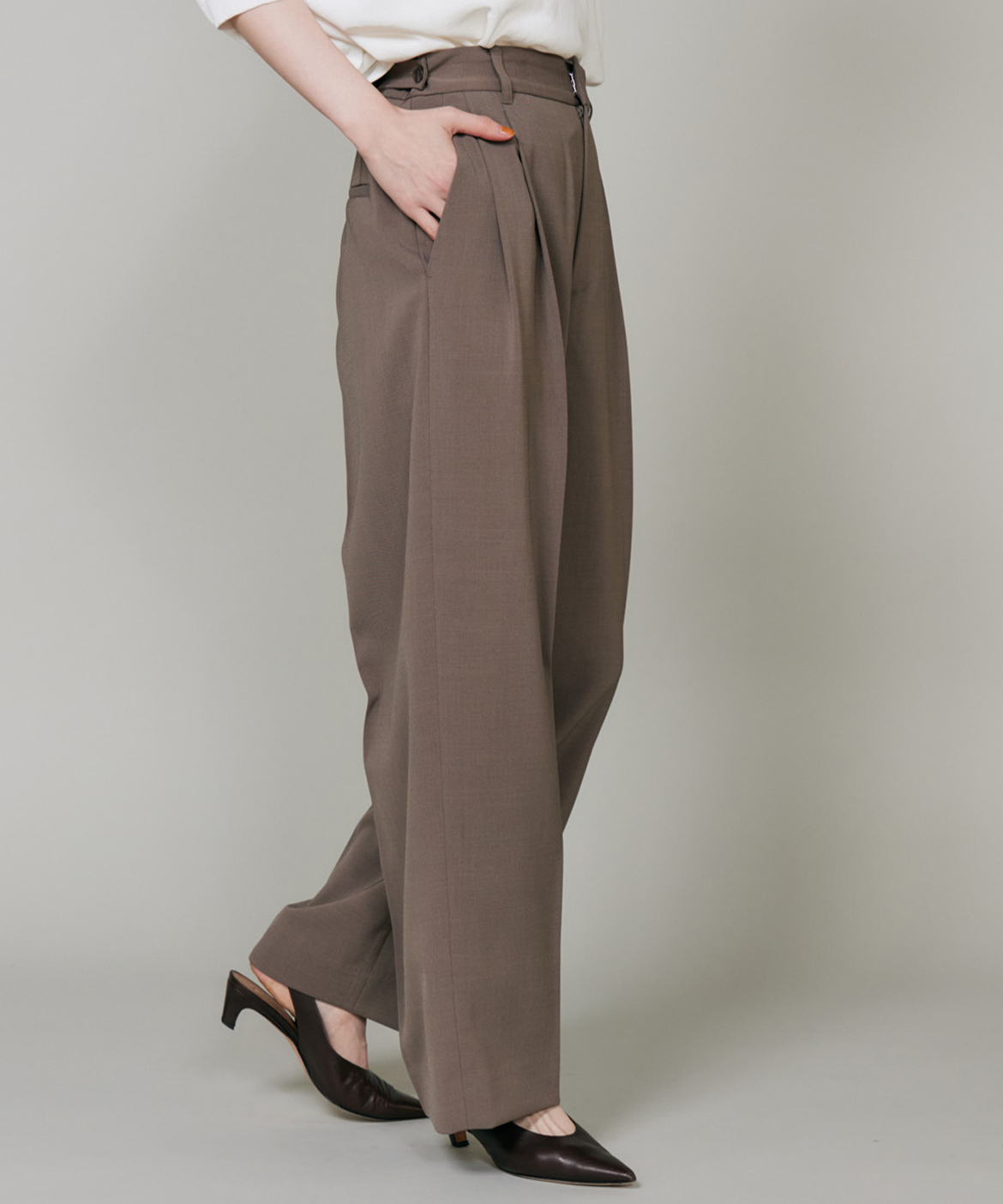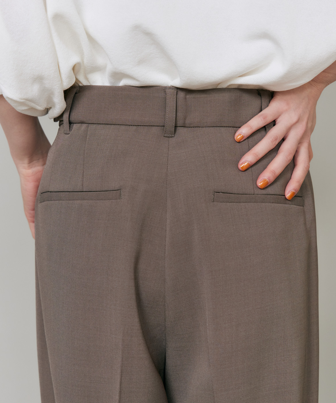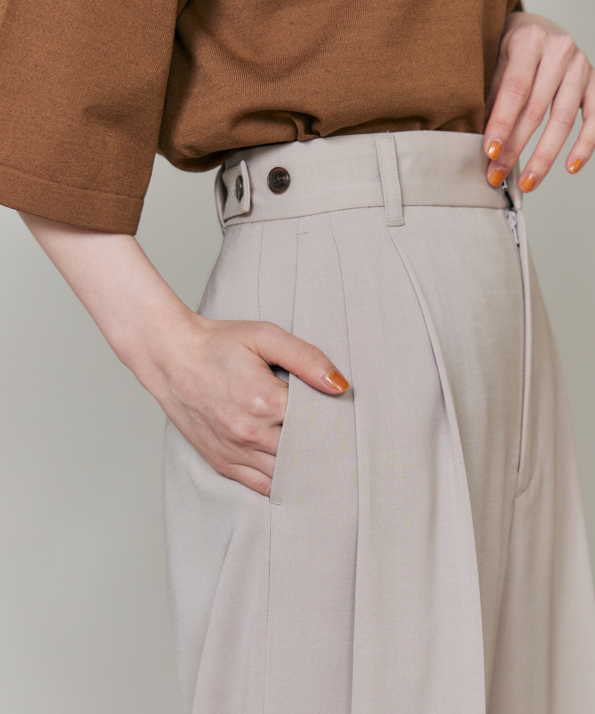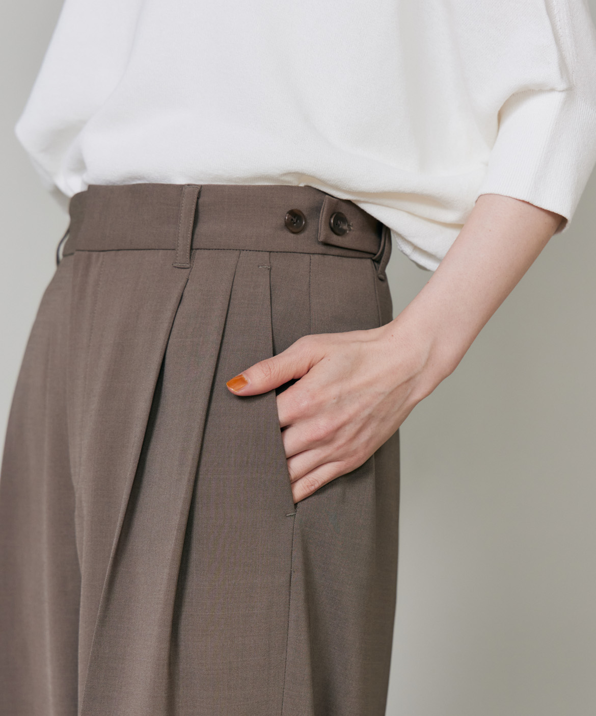 センタープレスを入れたタックワイドパンツ。ウエストはバックゴム&両サイドの釦ディティールでサイズ調節が可能です。広すぎないワイドシルエットと梳毛見えの素材感でマニッシュでキレイ見えの叶うワイドパンツです。