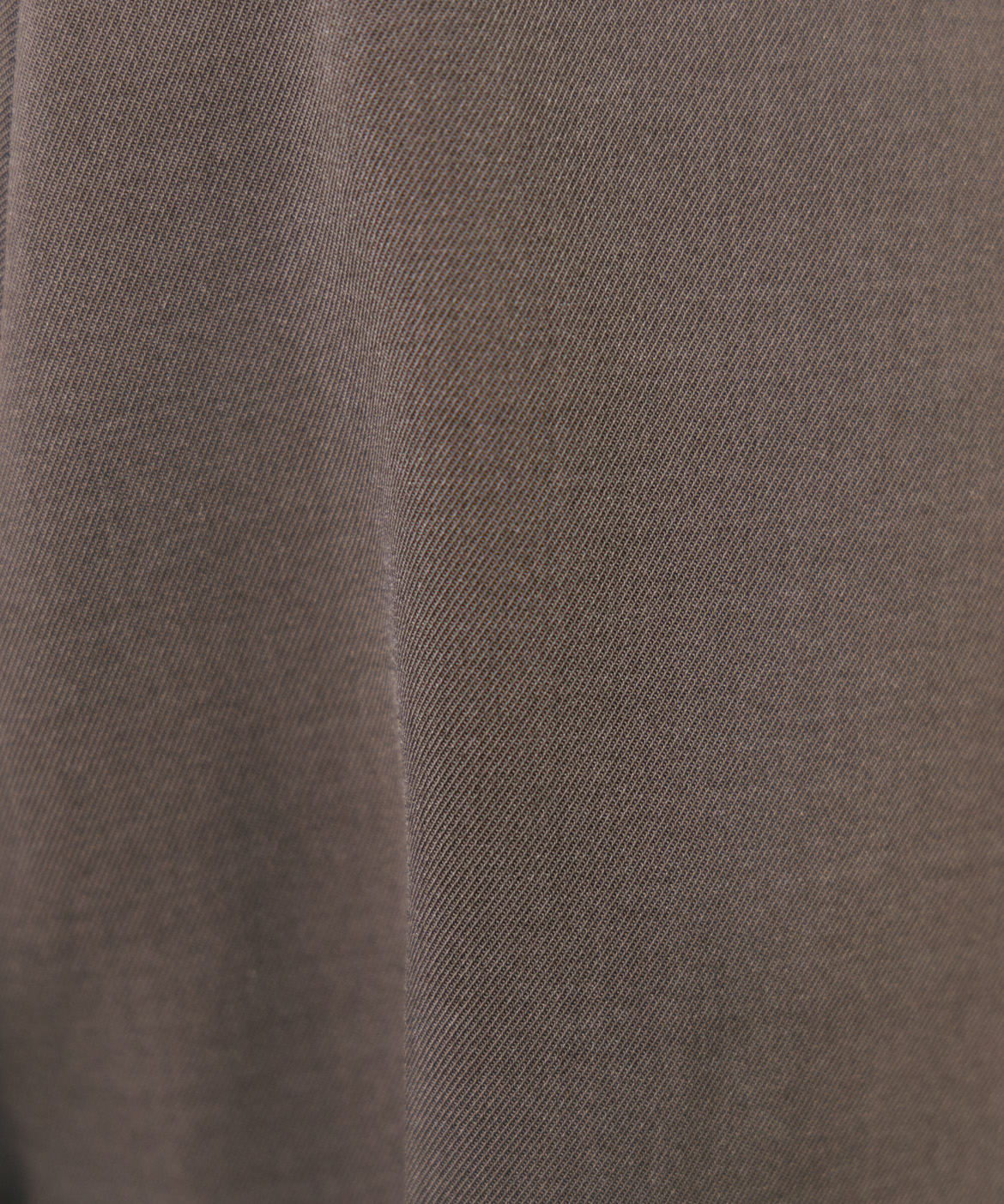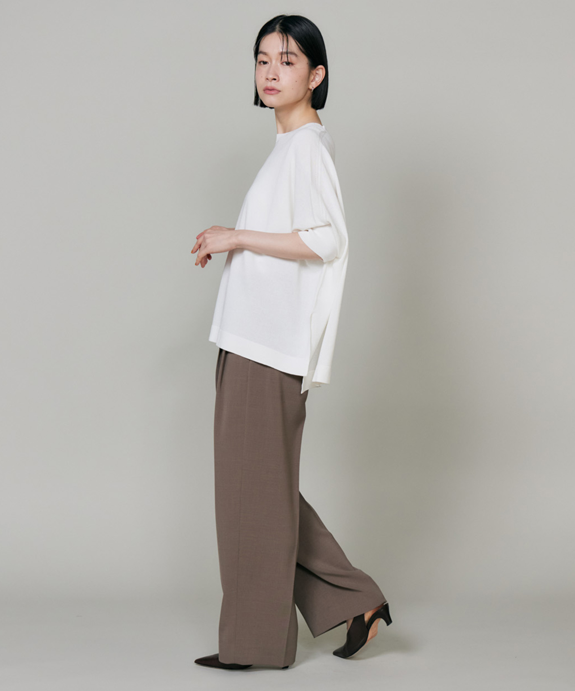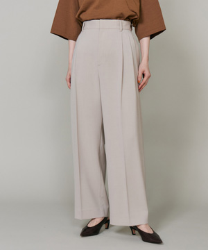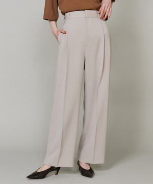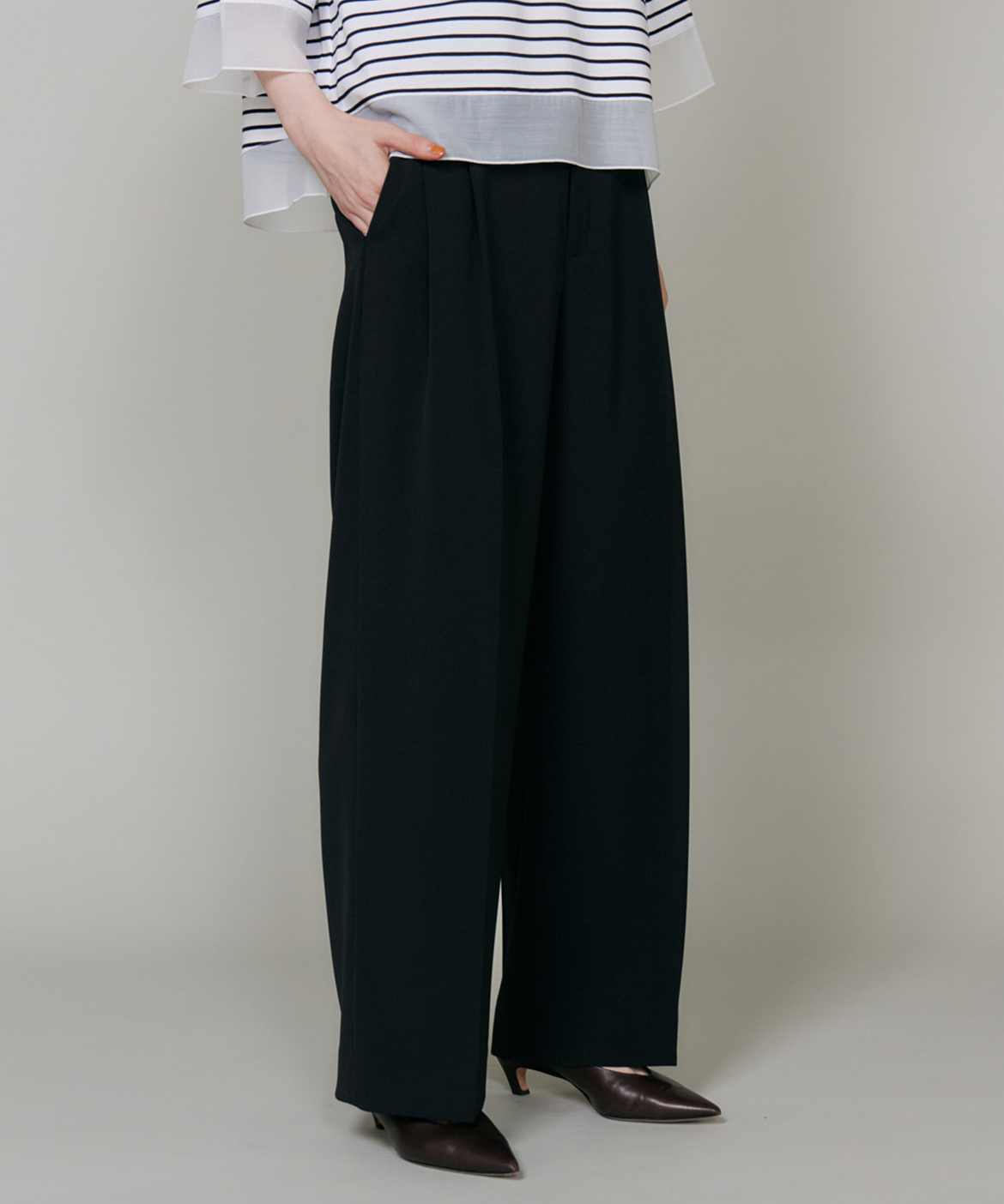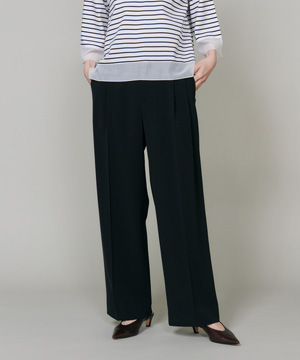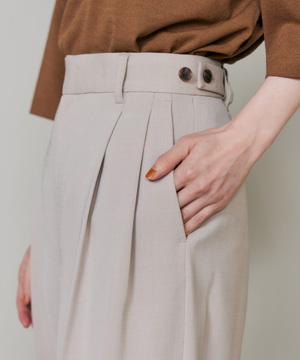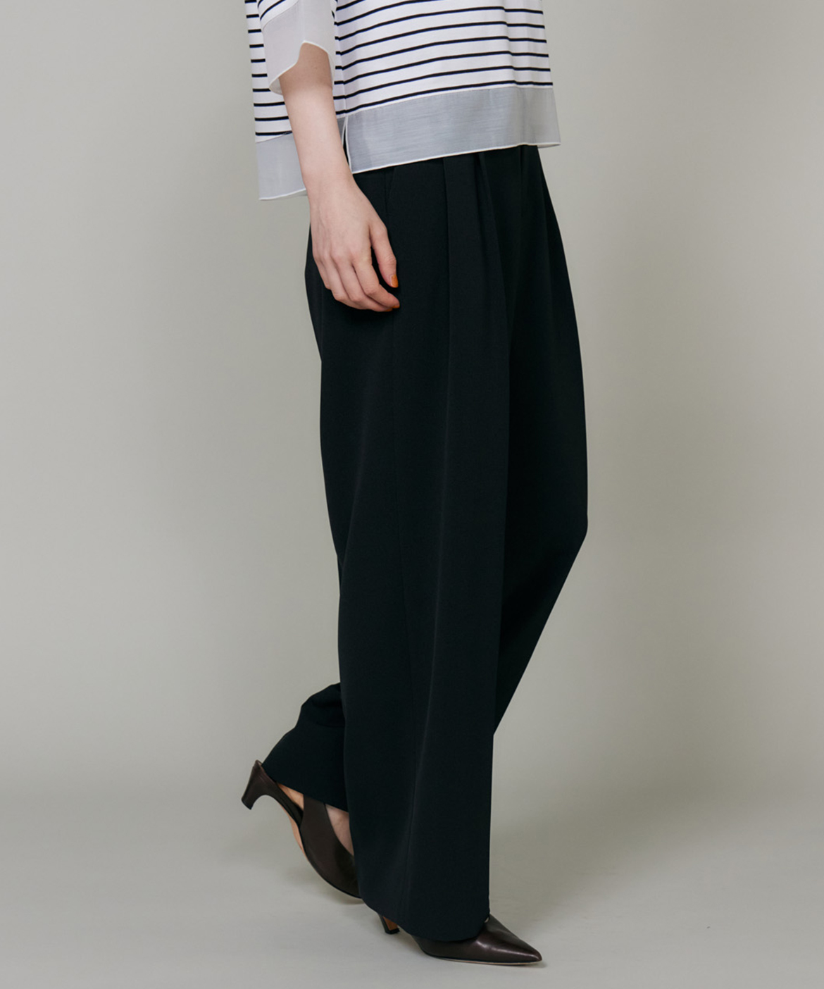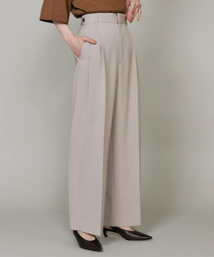 センタープレスを入れたタックワイドパンツ。ウエストはバックゴム&両サイドの釦ディティールでサイズ調節が可能です。広すぎないワイドシルエットと梳毛見えの素材感でマニッシュでキレイ見えの叶うワイドパンツです。