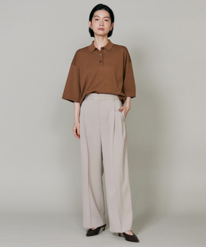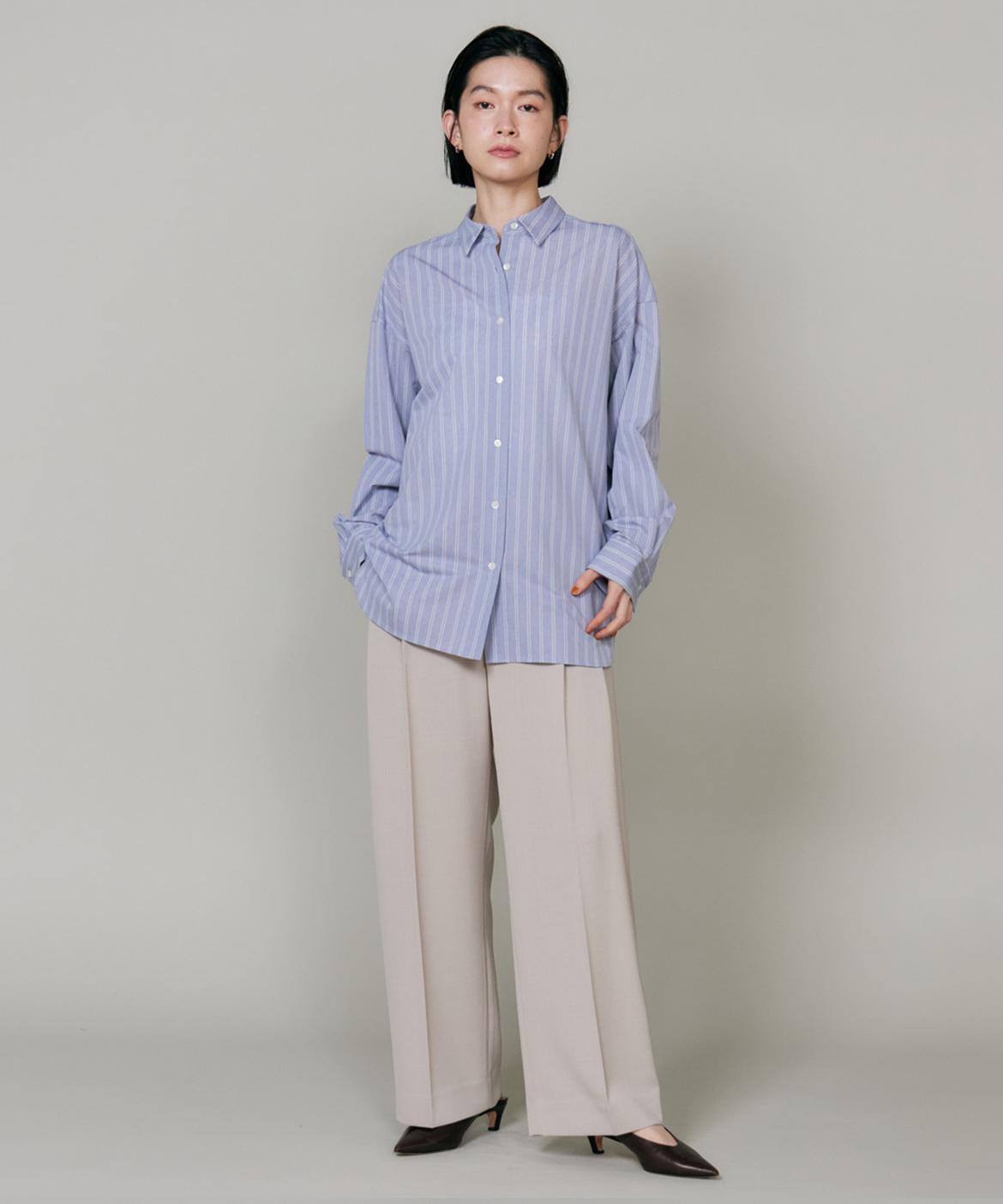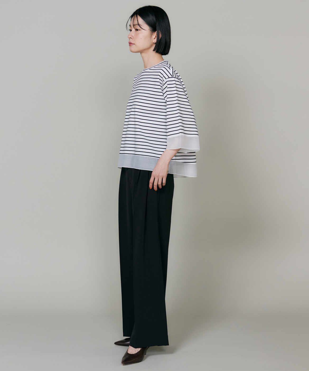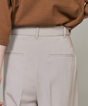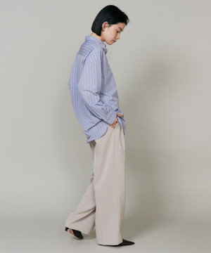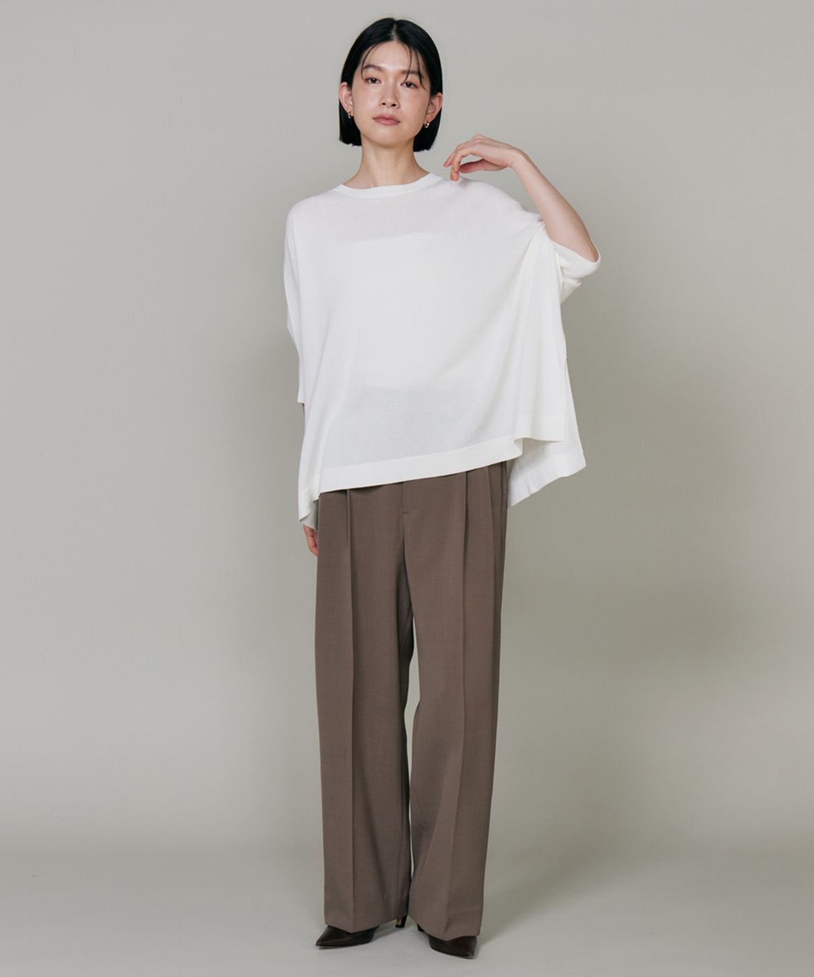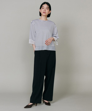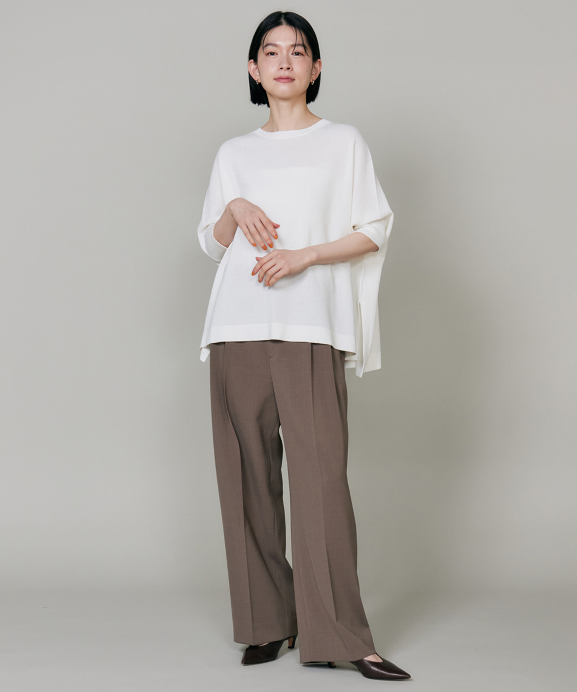 センタープレスを入れたタックワイドパンツ。ウエストはバックゴム&両サイドの釦ディティールでサイズ調節が可能です。広すぎないワイドシルエットと梳毛見えの素材感でマニッシュでキレイ見えの叶うワイドパンツです。