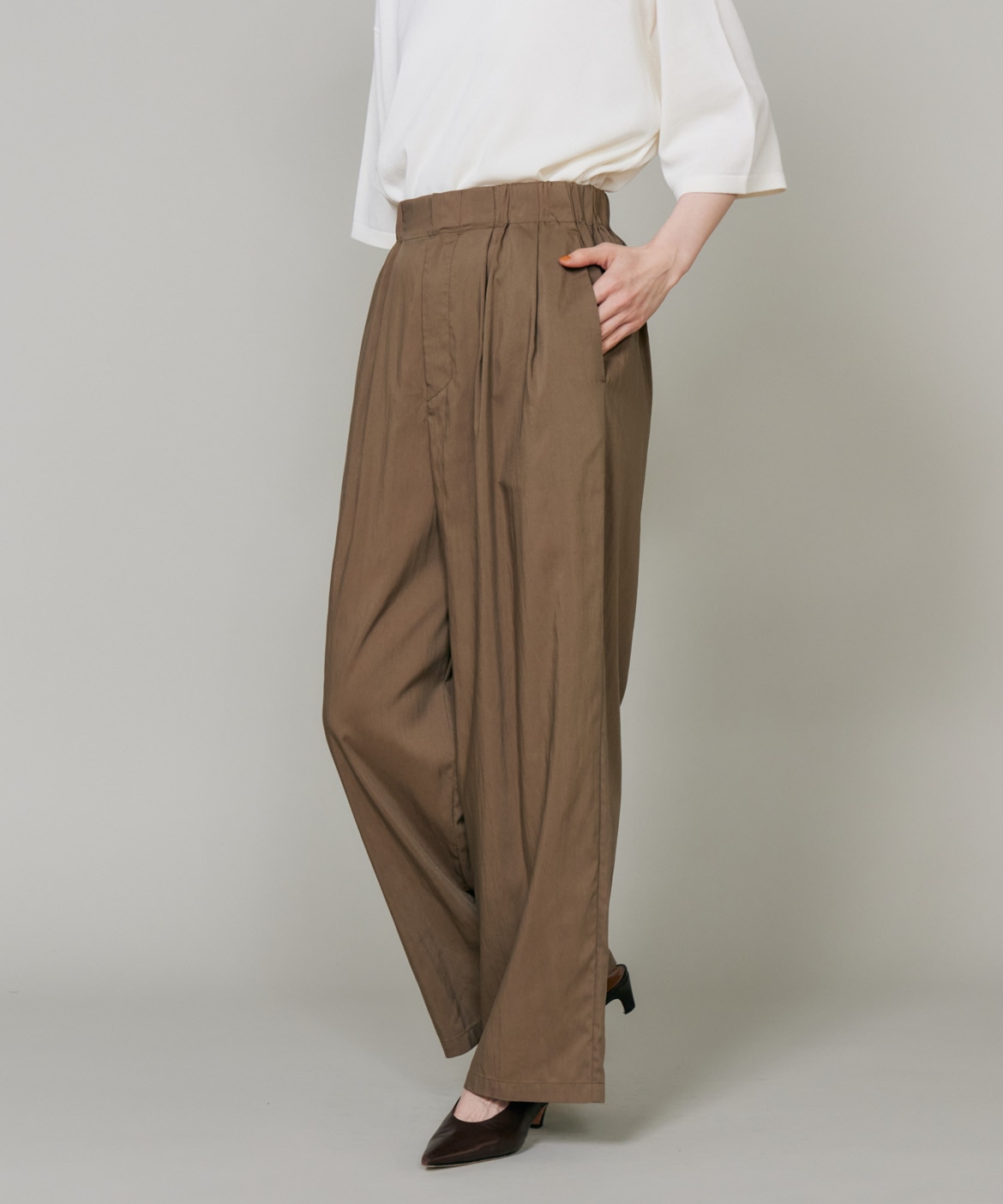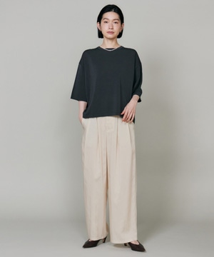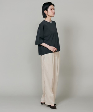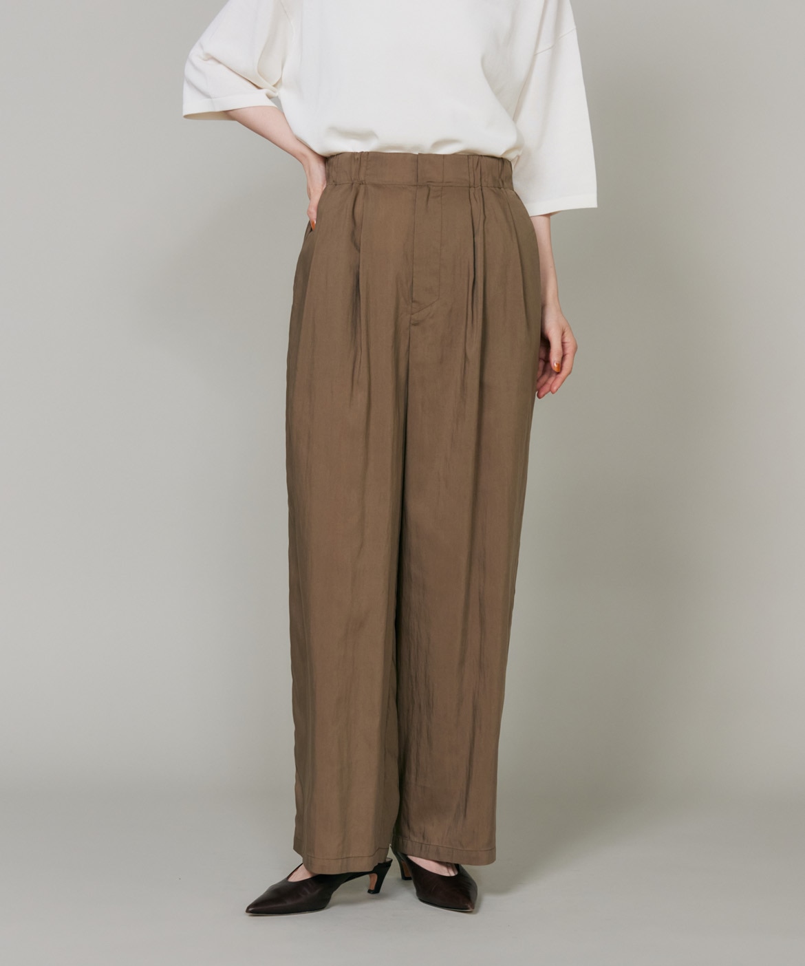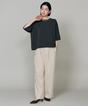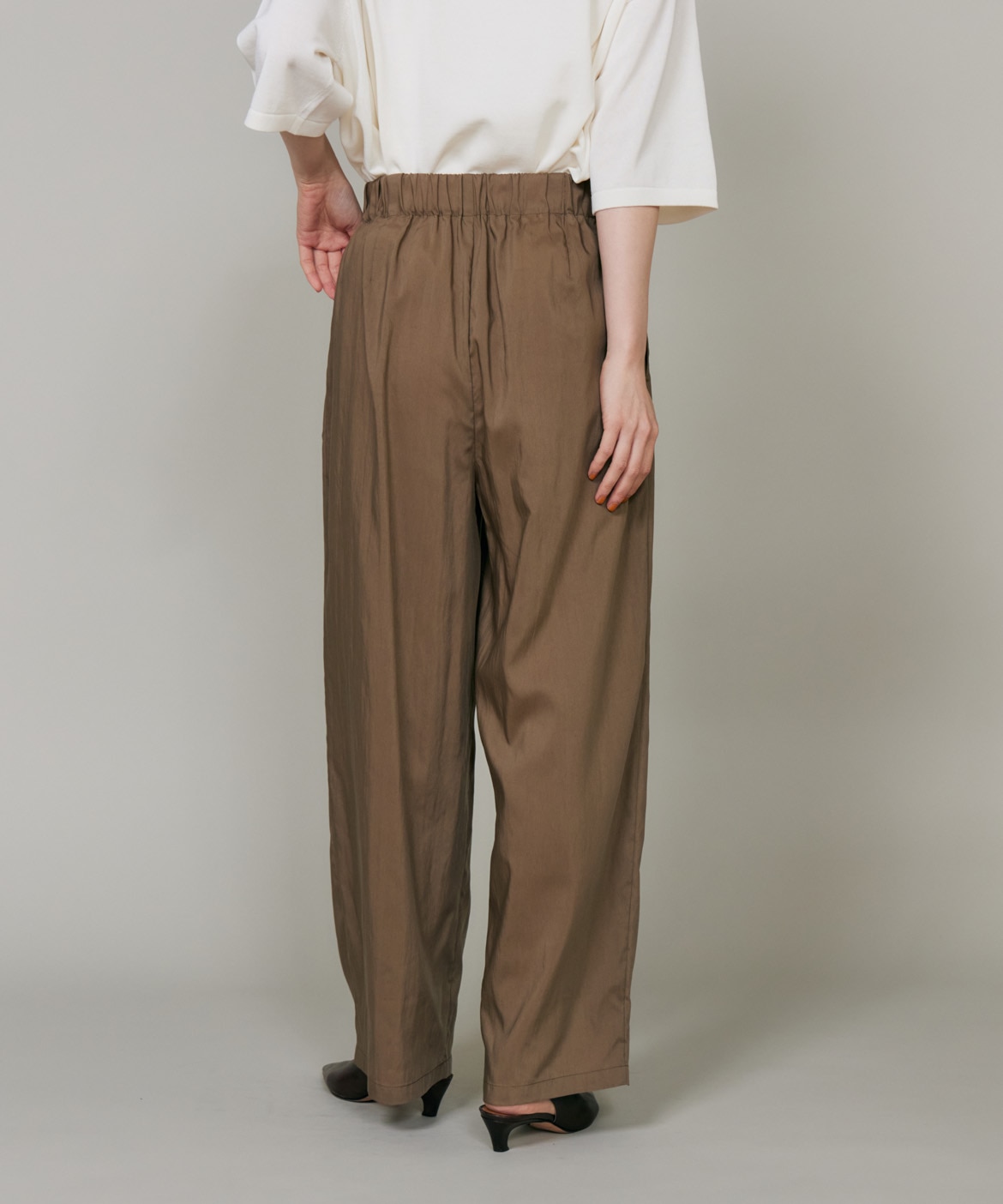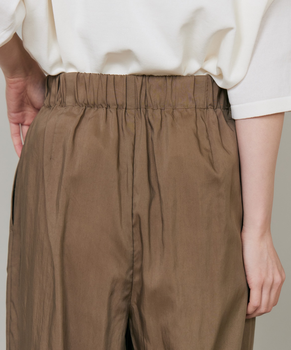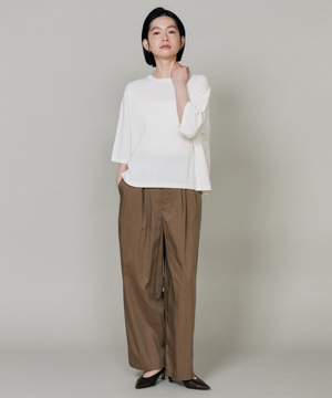 素材感を活かしたしなやかなドレープ感が特徴のギャザータックパンツ。ウエストはオールゴム仕様により履き心地も良く、程よいワイドシルエットでリラックス感があり、さり気ない光沢感はカジュアルなスタイリングのアクセントに。