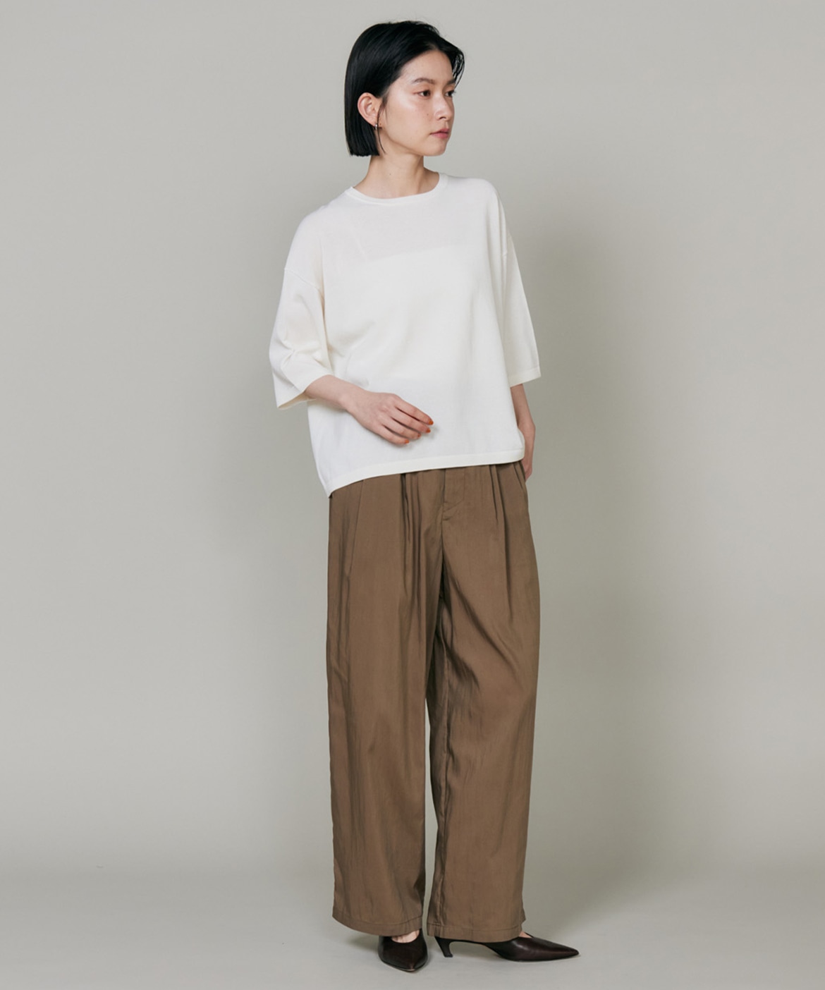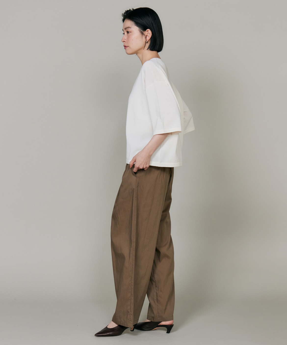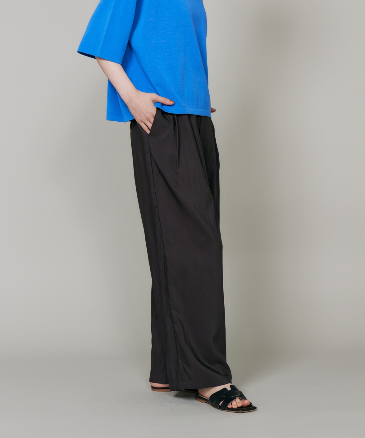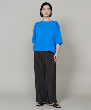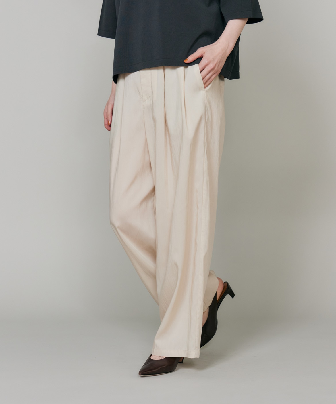 素材感を活かしたしなやかなドレープ感が特徴のギャザータックパンツ。ウエストはオールゴム仕様により履き心地も良く、程よいワイドシルエットでリラックス感があり、さり気ない光沢感はカジュアルなスタイリングのアクセントに。