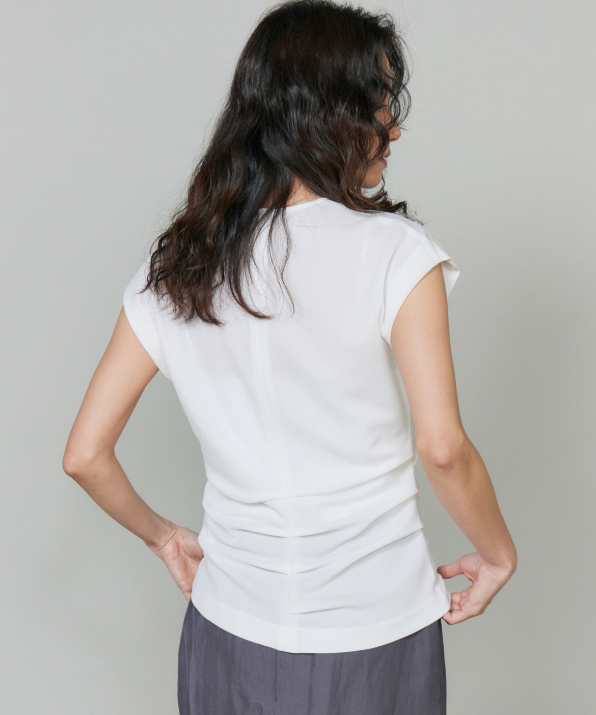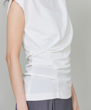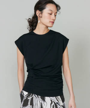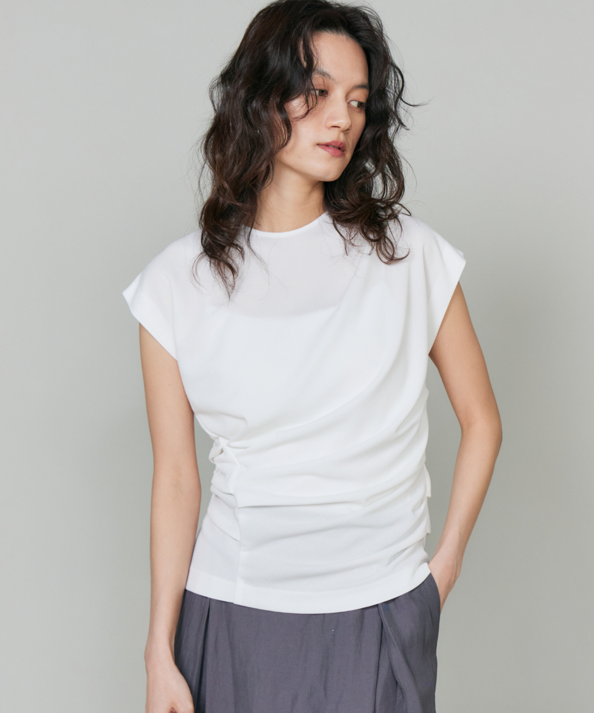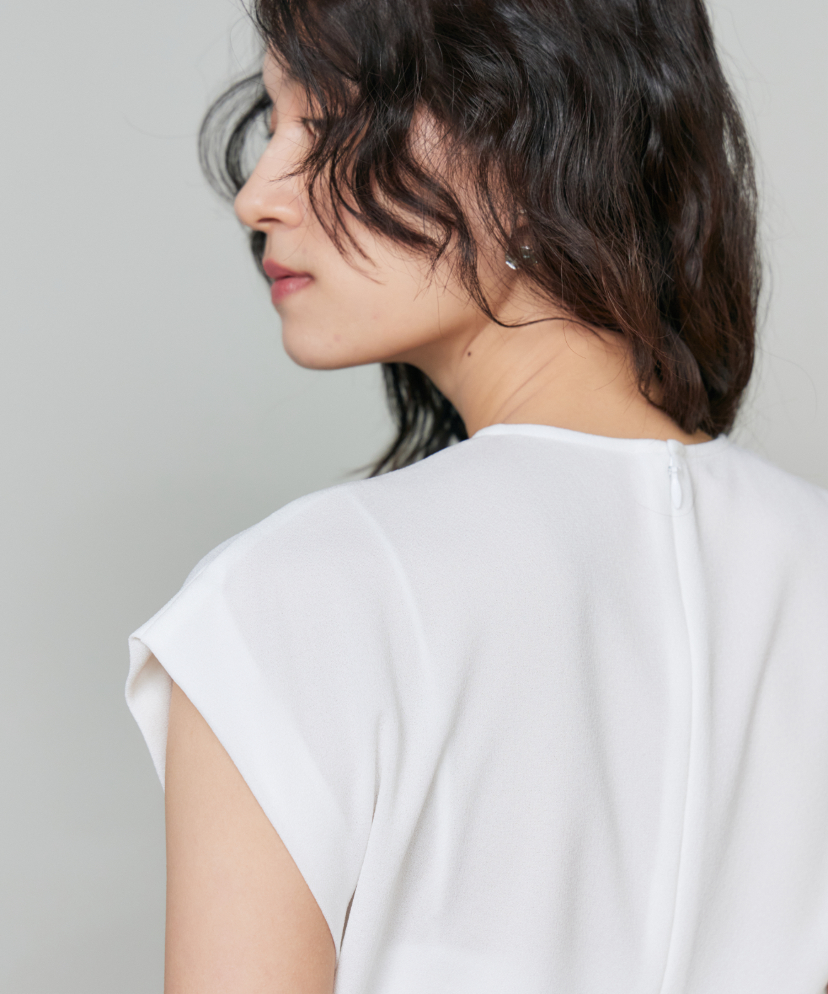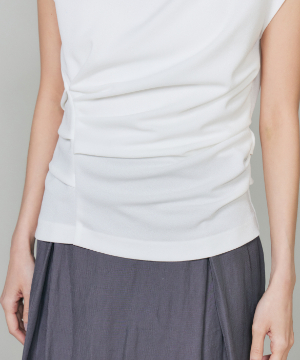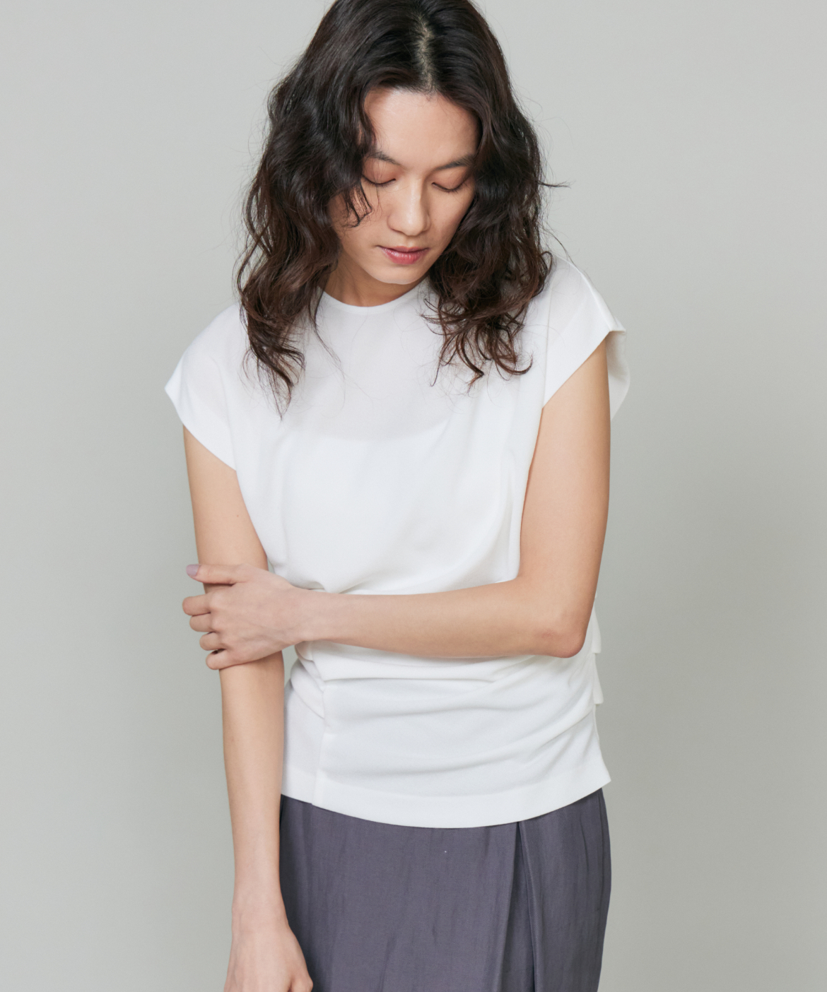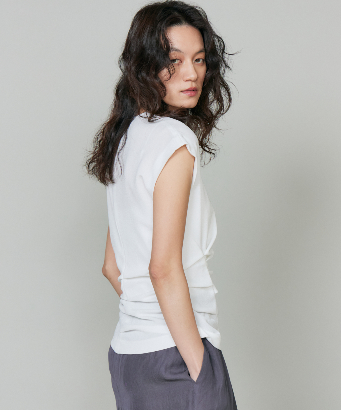 ノースリーブのフィット感のある梨地素材のトップス。裾はヒップ丈で、フロントはドレープ感があり、斜めのギャザーが立体感を演出します。ラウンドネック、背面はコンシールジッパーとフック開閉のデザイン。カット素材なのに布帛見えするのでデイリーからドレスアップスタイルまで、シーンを選ばず着用できる一枚です。