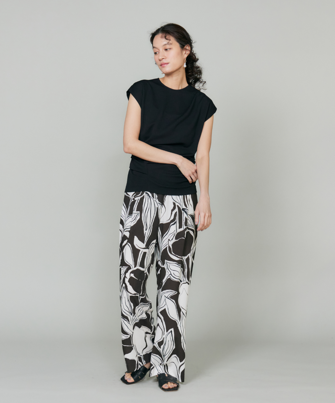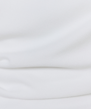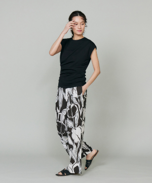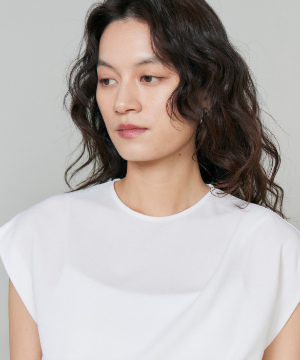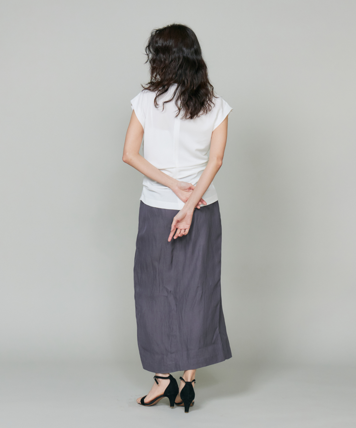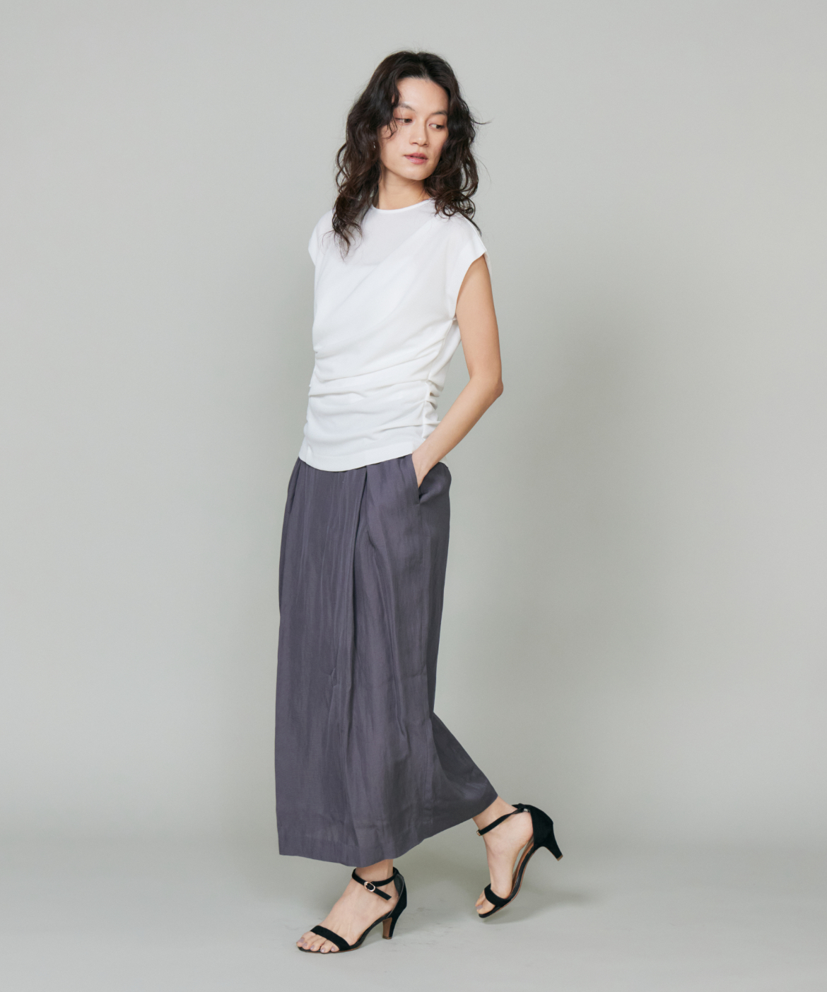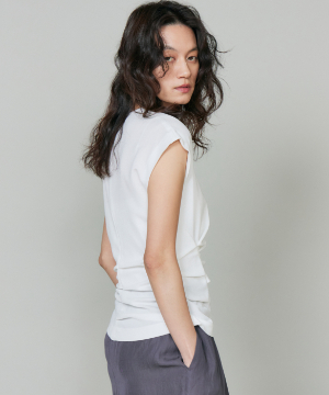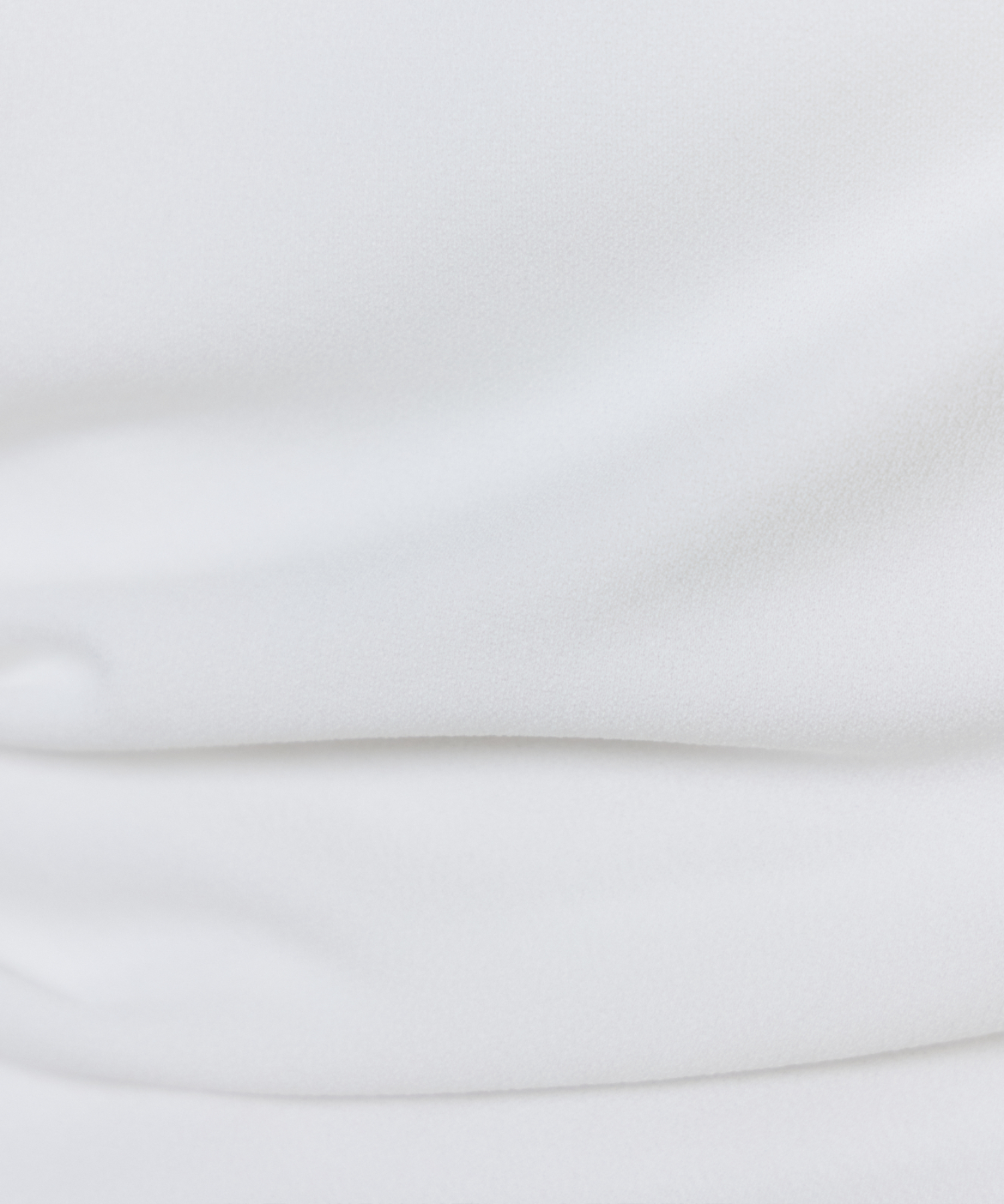 ノースリーブのフィット感のある梨地素材のトップス。裾はヒップ丈で、フロントはドレープ感があり、斜めのギャザーが立体感を演出します。ラウンドネック、背面はコンシールジッパーとフック開閉のデザイン。カット素材なのに布帛見えするのでデイリーからドレスアップスタイルまで、シーンを選ばず着用できる一枚です。