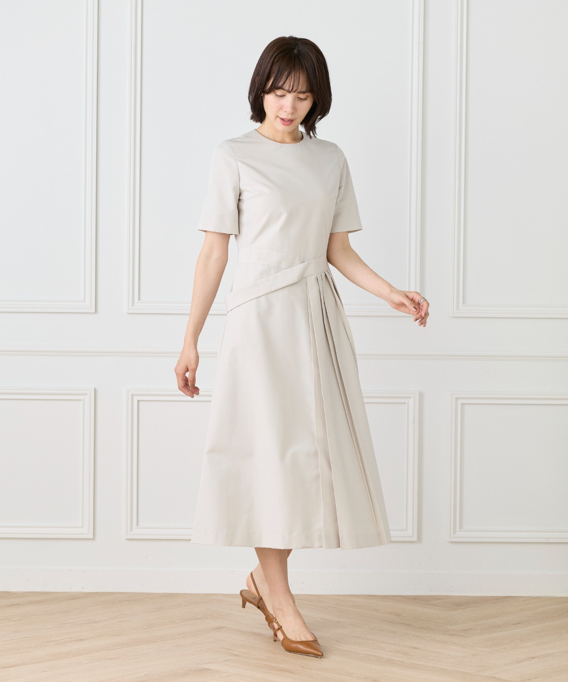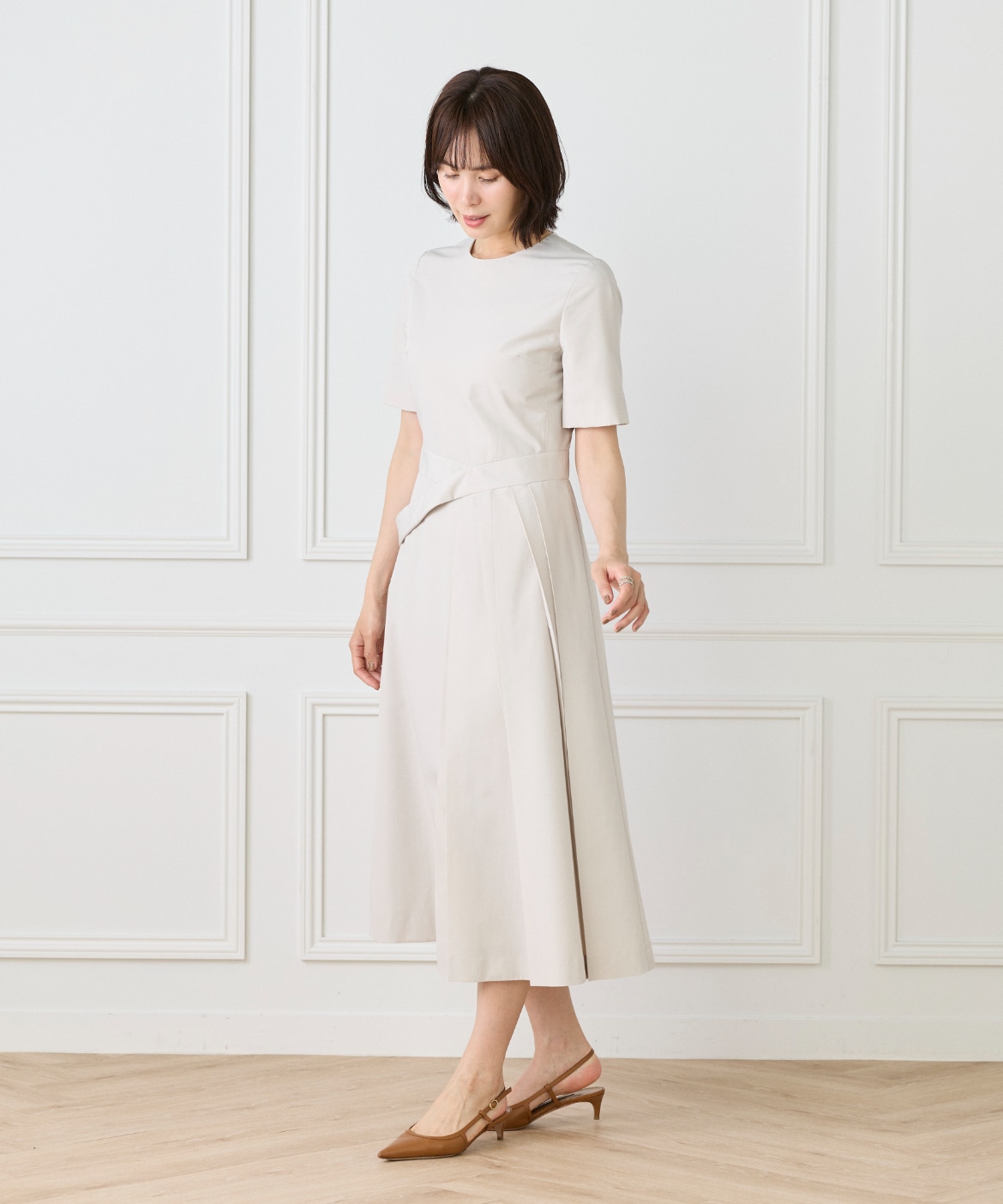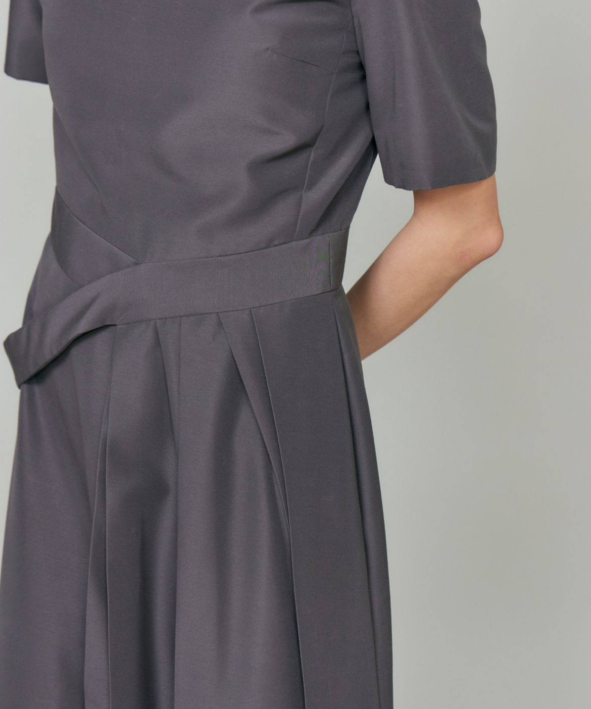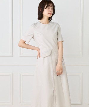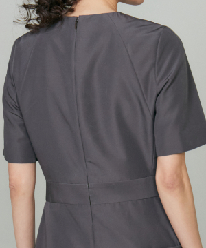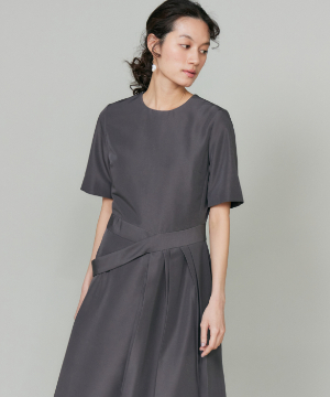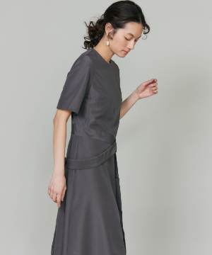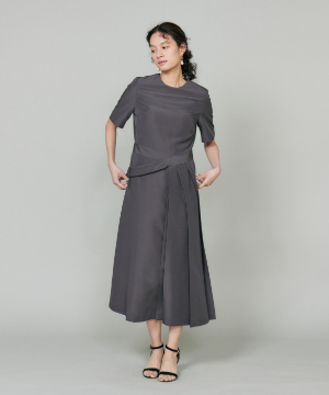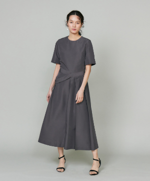 ウエストを程よくシェイプし、裾に向かって優雅に広がるフィット&フレアシルエット。構築的でありながらも、どこか柔らかさを感じさせる絶妙なバランスが魅力です。きゅっと詰まったネックラインと端正な袖のデザインが、全体をすっきりとした印象にまとめます。さらに、ウエストで折り重なるように施したプリーツディテールが、スカートに自然なボリュームと動きをプラス。ラップ風デザインがアクセントとなり、流れるようなドレープが美しい表情を演出します。
