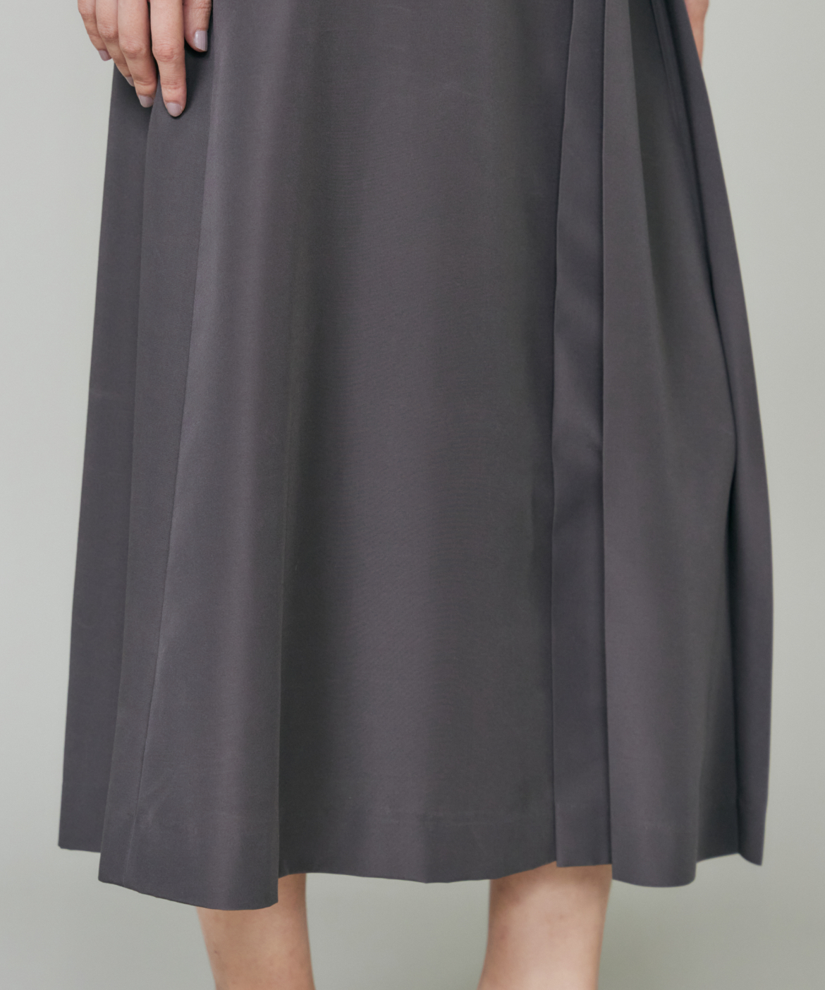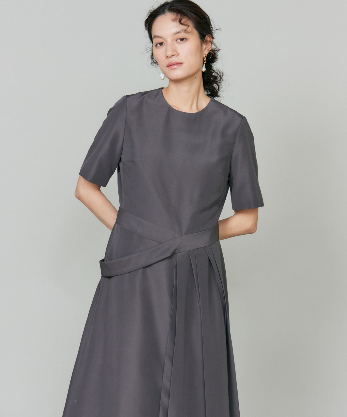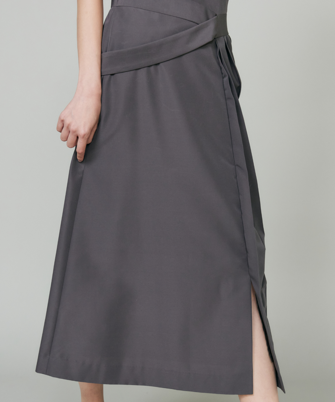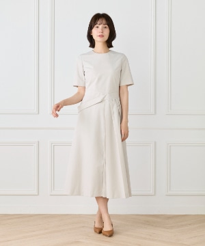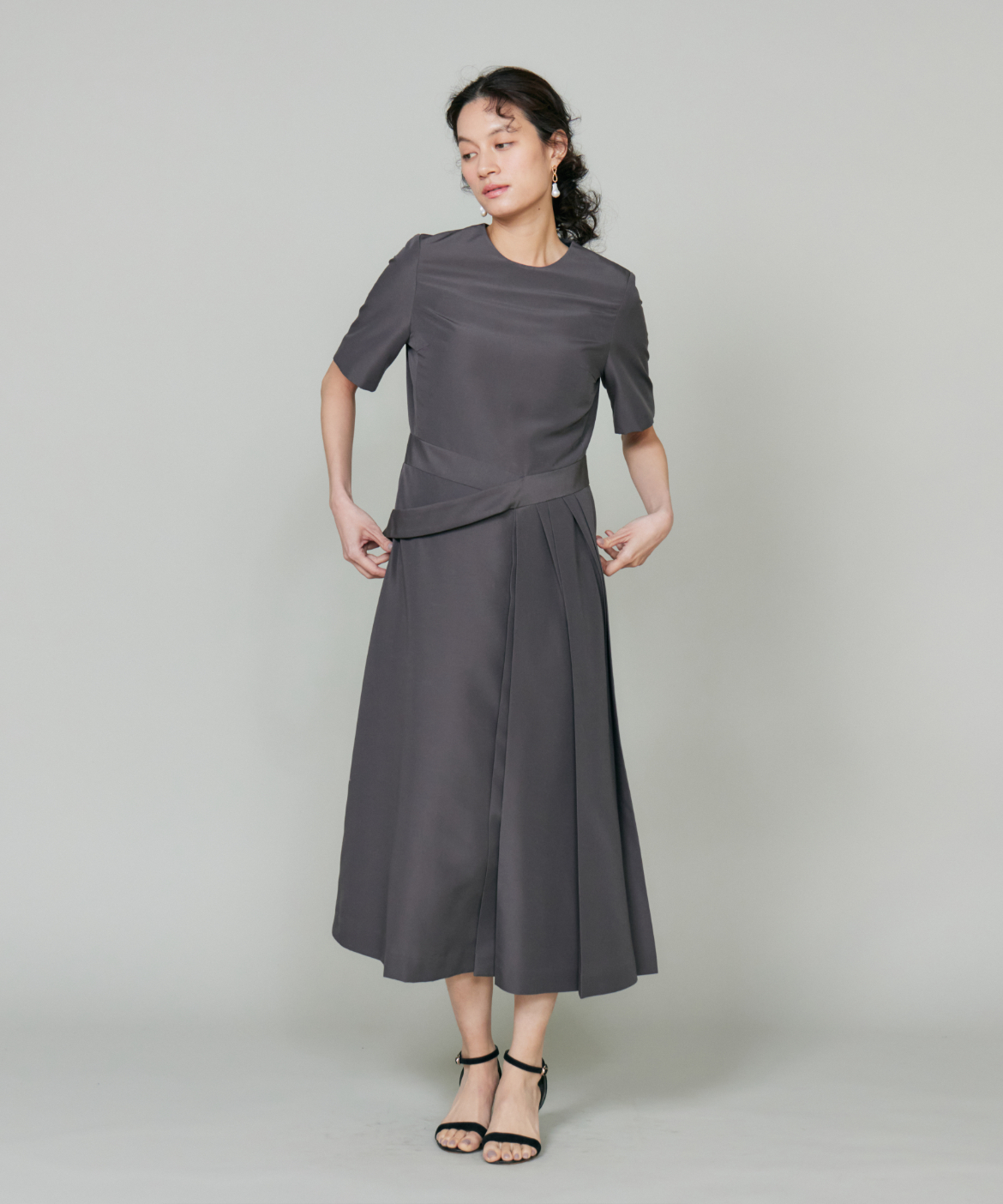ウエストを程よくシェイプし、裾に向かって優雅に広がるフィット&フレアシルエット。構築的でありながらも、どこか柔らかさを感じさせる絶妙なバランスが魅力です。きゅっと詰まったネックラインと端正な袖のデザインが、全体をすっきりとした印象にまとめます。さらに、ウエストで折り重なるように施したプリーツディテールが、スカートに自然なボリュームと動きをプラス。ラップ風デザインがアクセントとなり、流れるようなドレープが美しい表情を演出します。