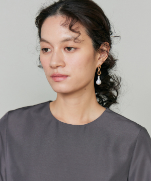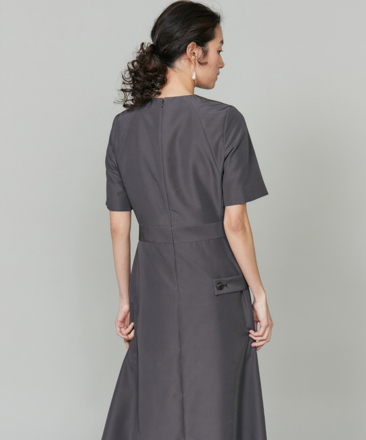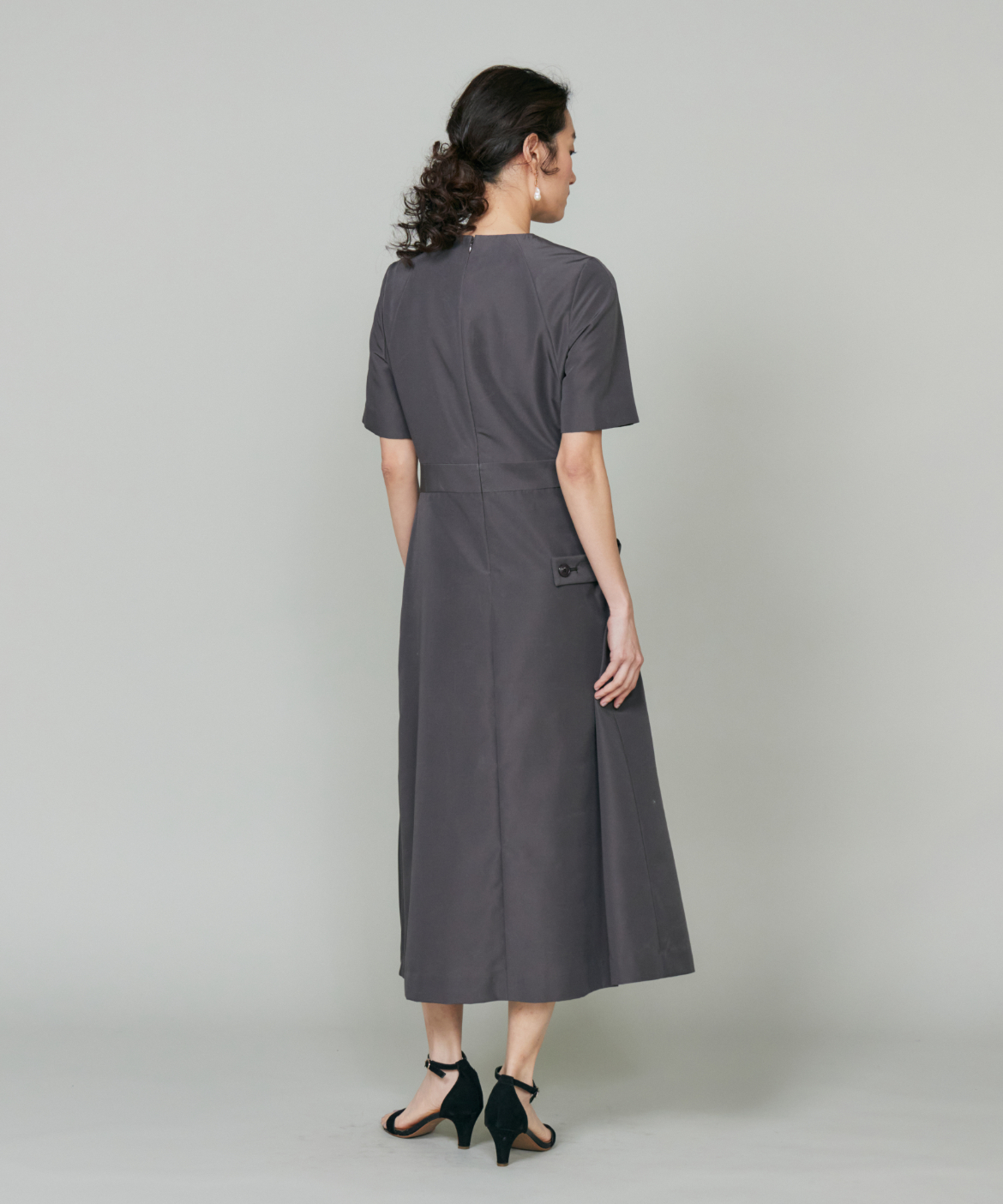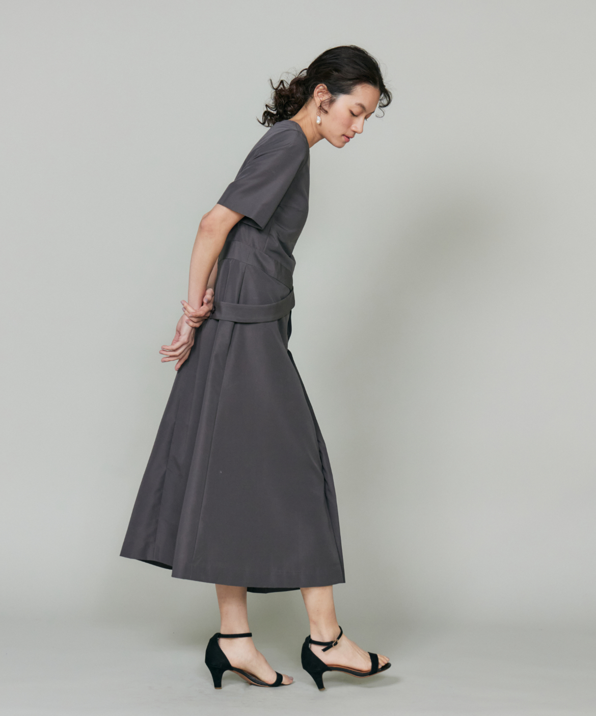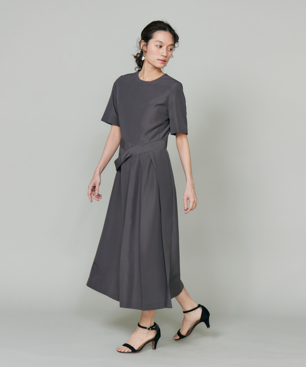 ウエストを程よくシェイプし、裾に向かって優雅に広がるフィット&フレアシルエット。構築的でありながらも、どこか柔らかさを感じさせる絶妙なバランスが魅力です。きゅっと詰まったネックラインと端正な袖のデザインが、全体をすっきりとした印象にまとめます。さらに、ウエストで折り重なるように施したプリーツディテールが、スカートに自然なボリュームと動きをプラス。ラップ風デザインがアクセントとなり、流れるようなドレープが美しい表情を演出します。