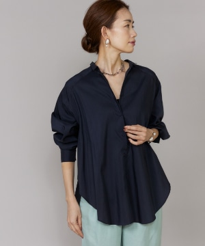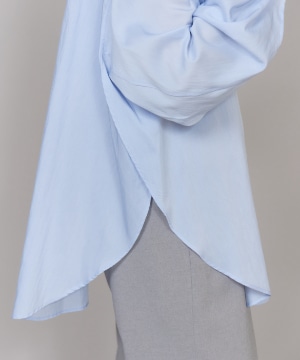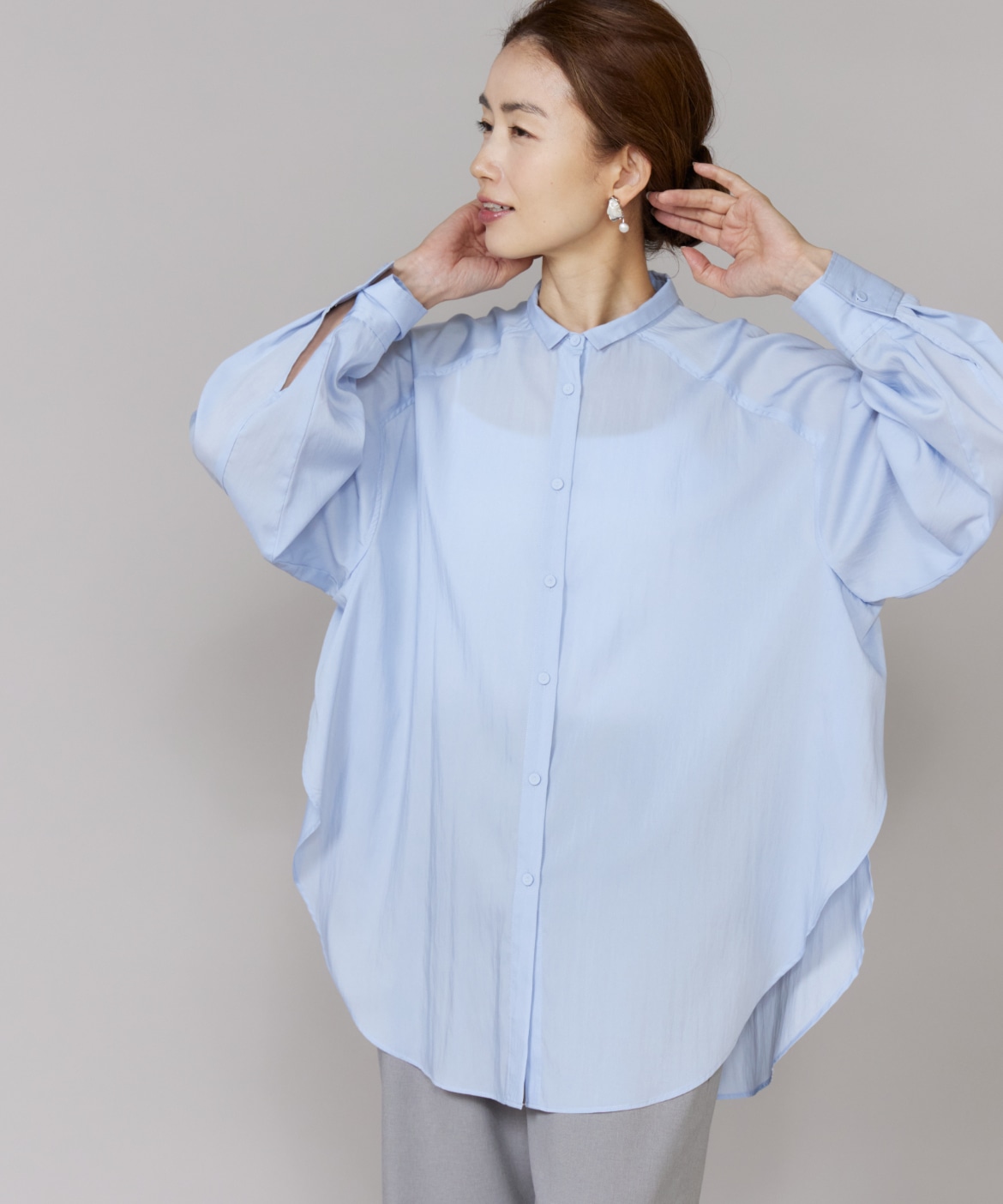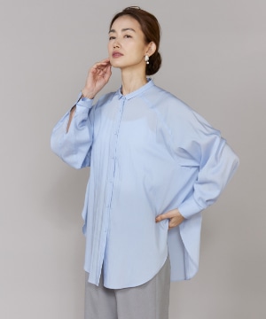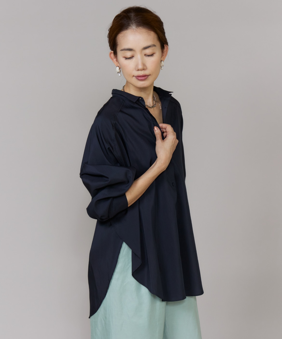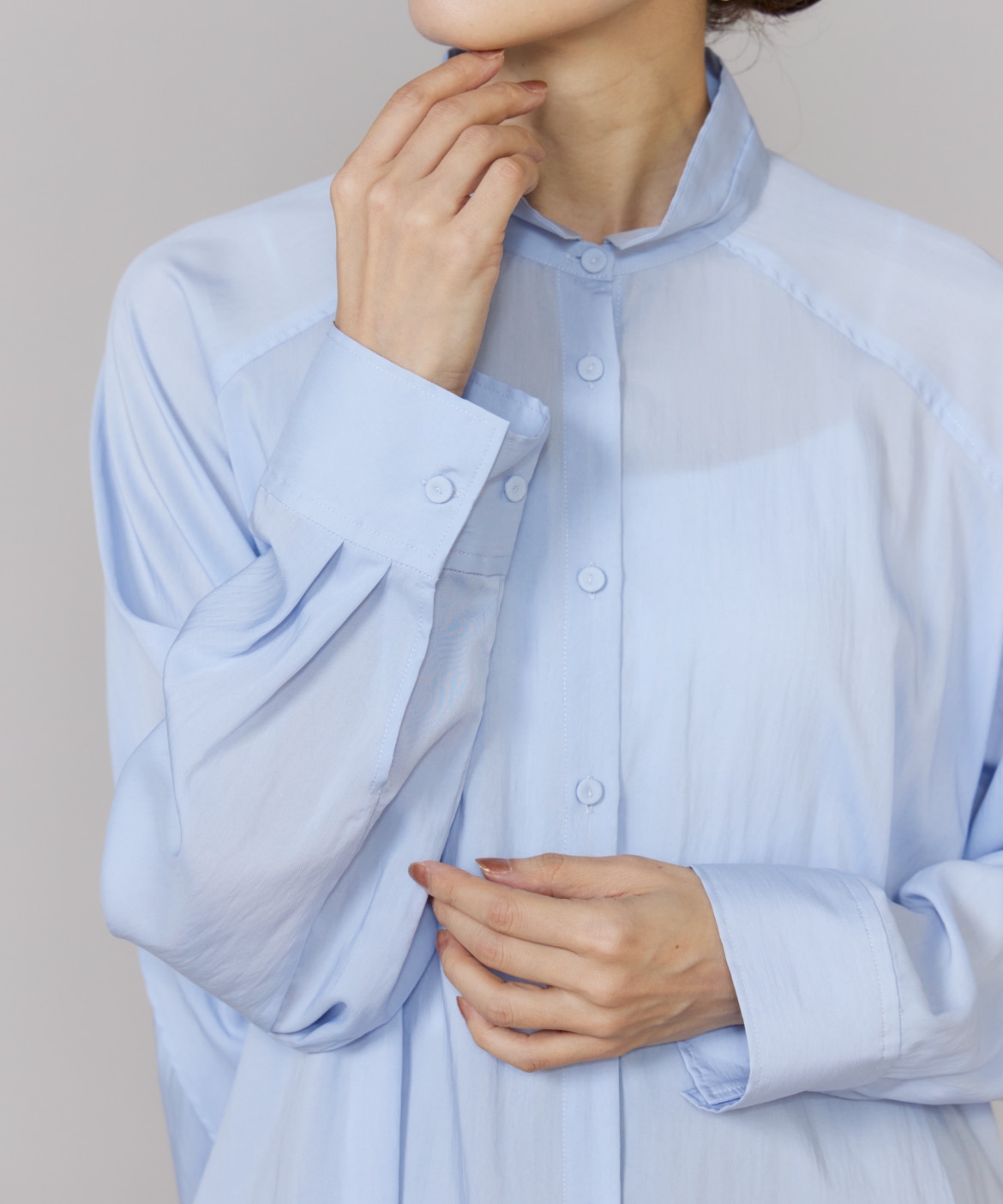 コンパクトなシャツカラーとワイドなサイジングのロングシャツ。衿を立ててスタンド風にも着こなせるデザインで、ワイドなラグランスリーブによるストレスフリーな着心地とモード感を演出し、デザイン性のあるカッティングやサイドのデザインスリットをアクセントに、袖口はダブル釦仕様でサイズ調整が可能な、シンプルながら存在感のある一着です。