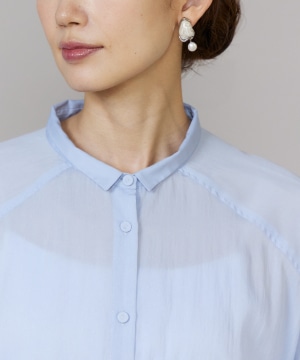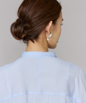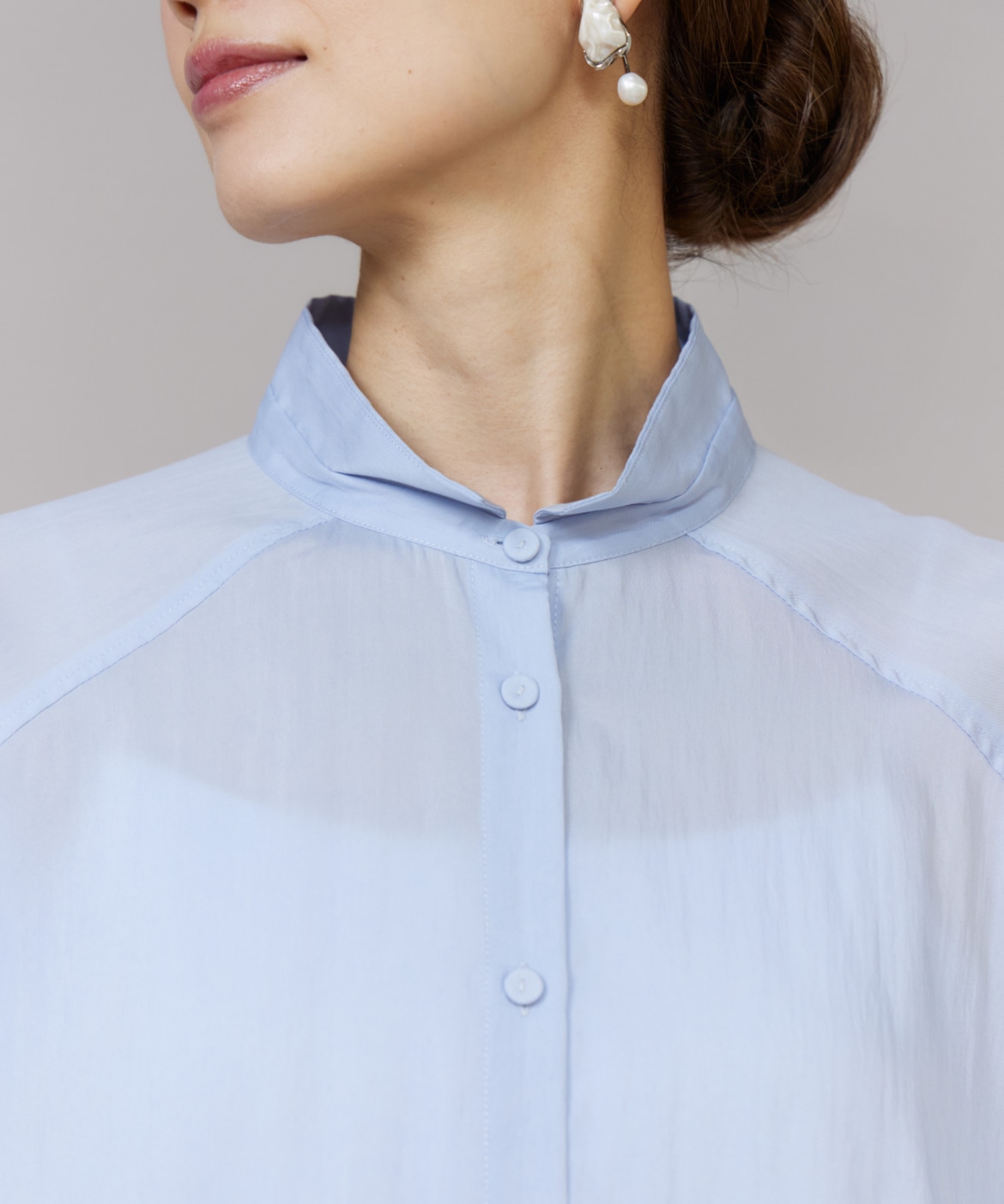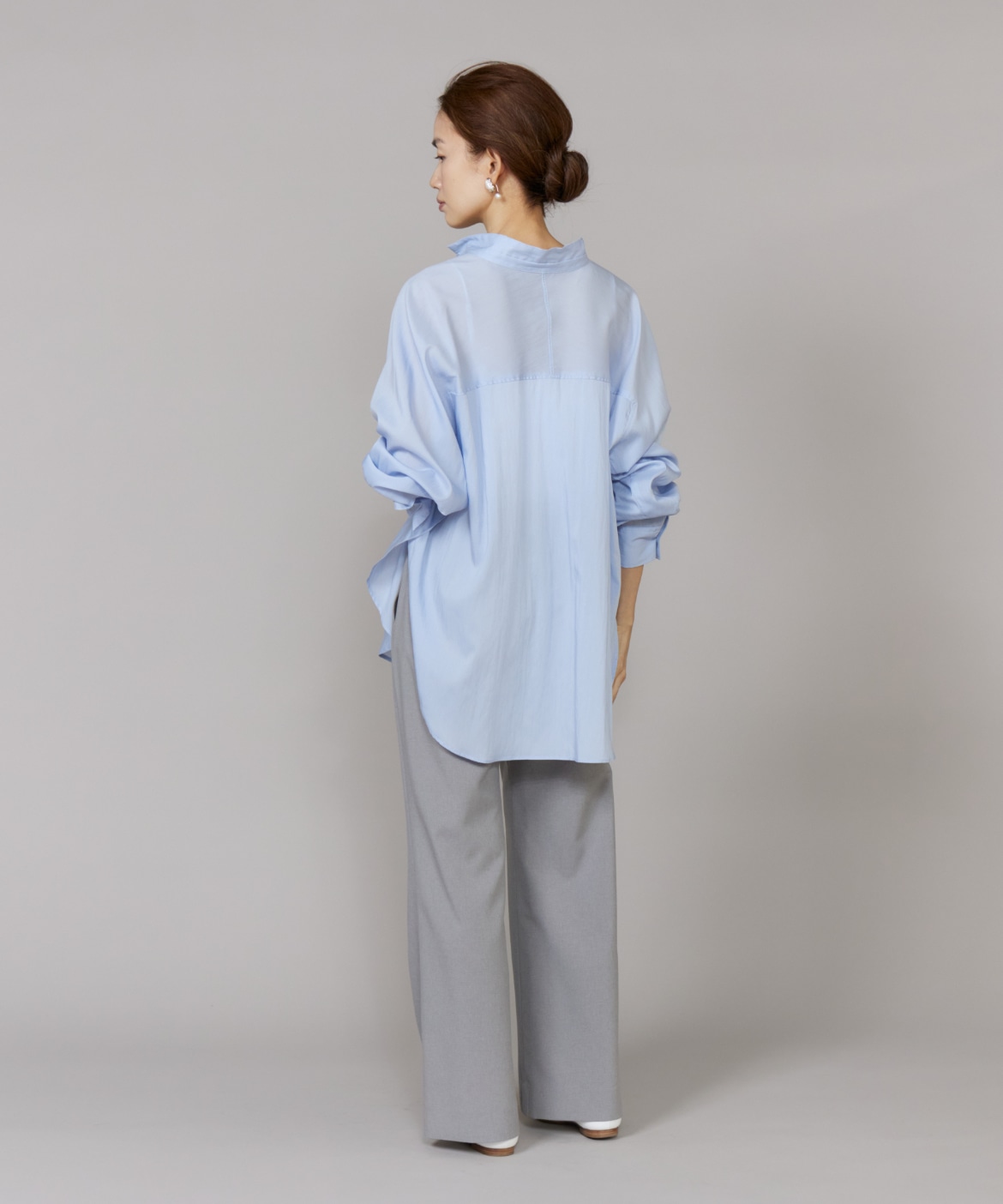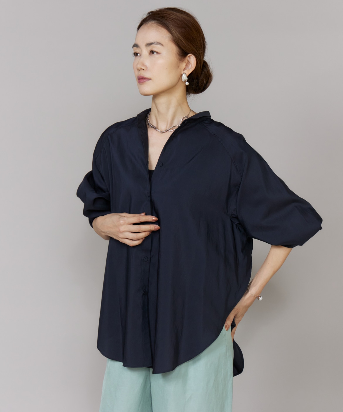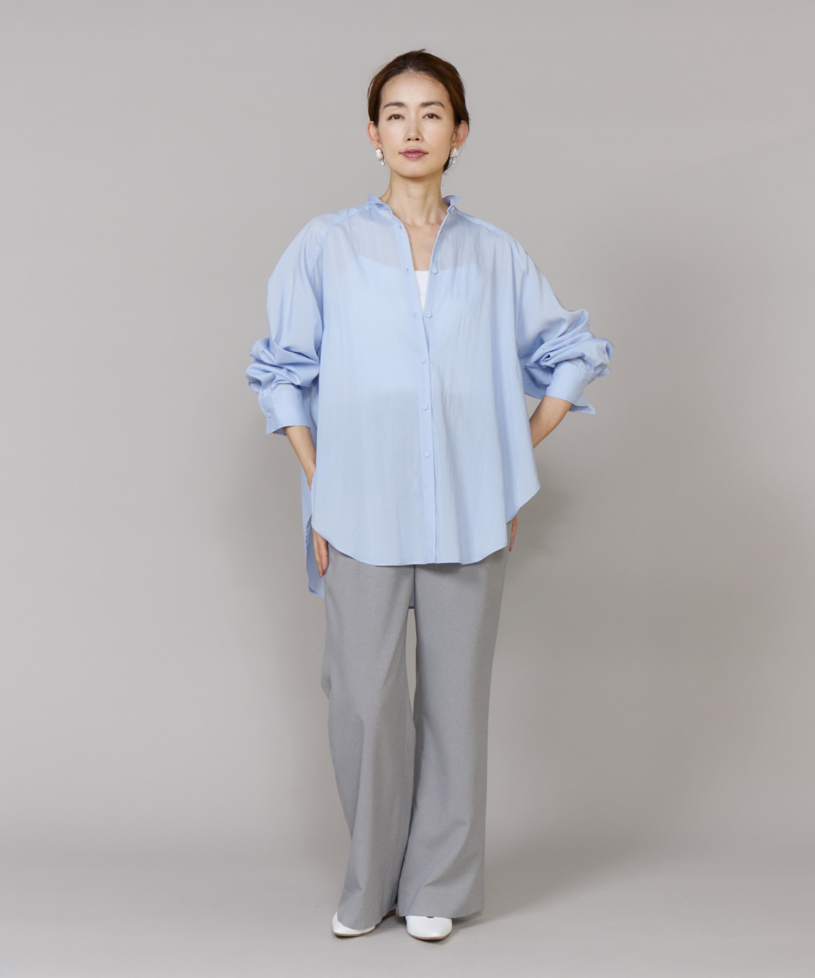 コンパクトなシャツカラーとワイドなサイジングのロングシャツ。衿を立ててスタンド風にも着こなせるデザインで、ワイドなラグランスリーブによるストレスフリーな着心地とモード感を演出し、デザイン性のあるカッティングやサイドのデザインスリットをアクセントに、袖口はダブル釦仕様でサイズ調整が可能な、シンプルながら存在感のある一着です。