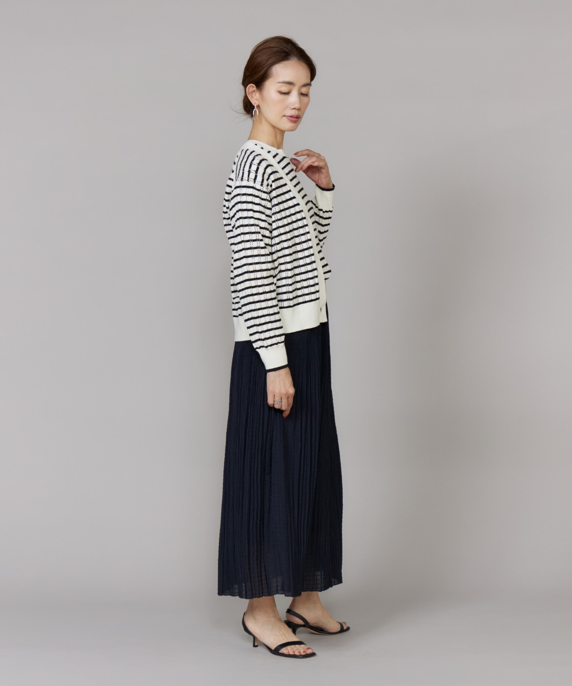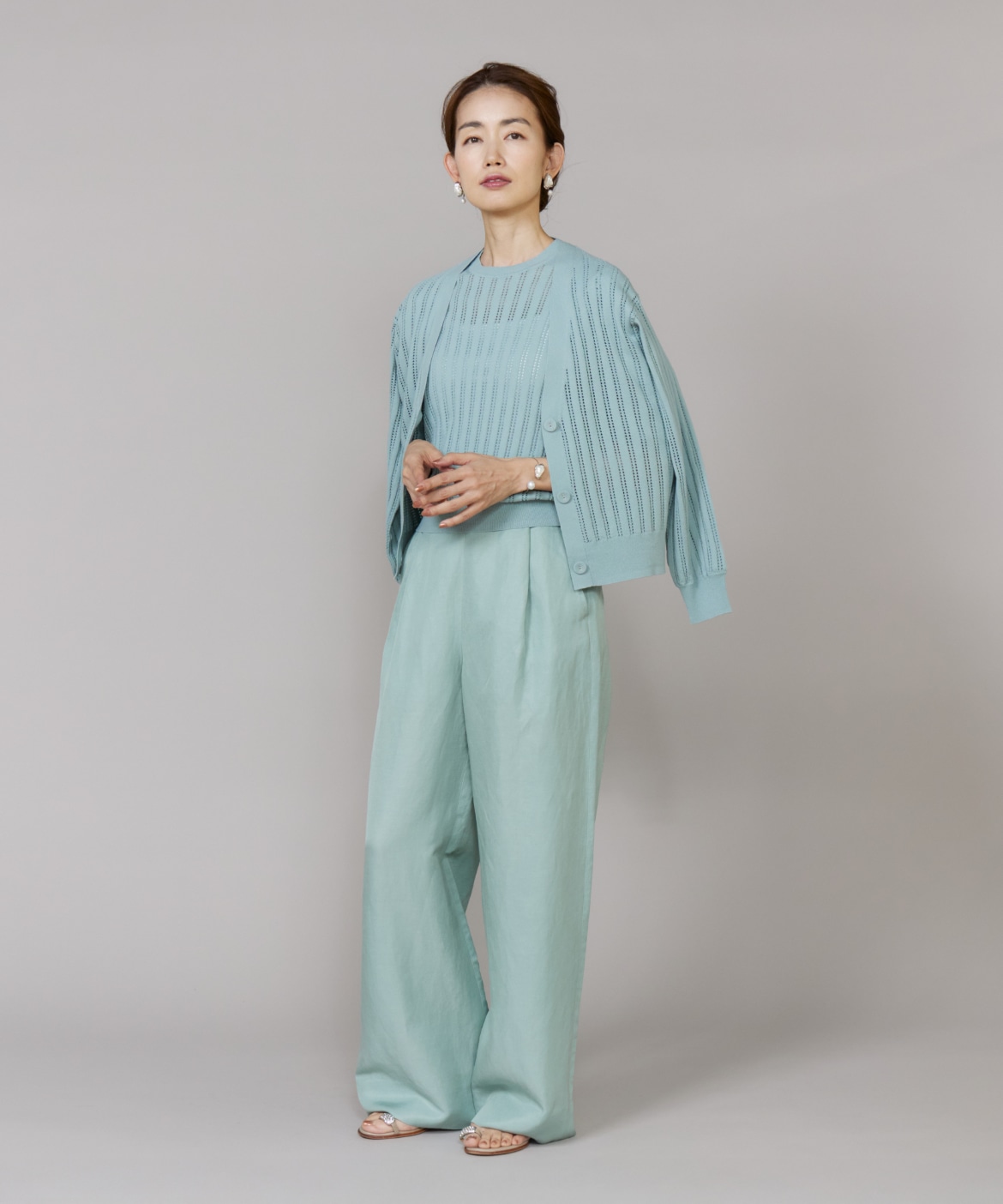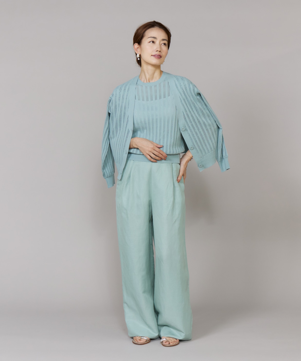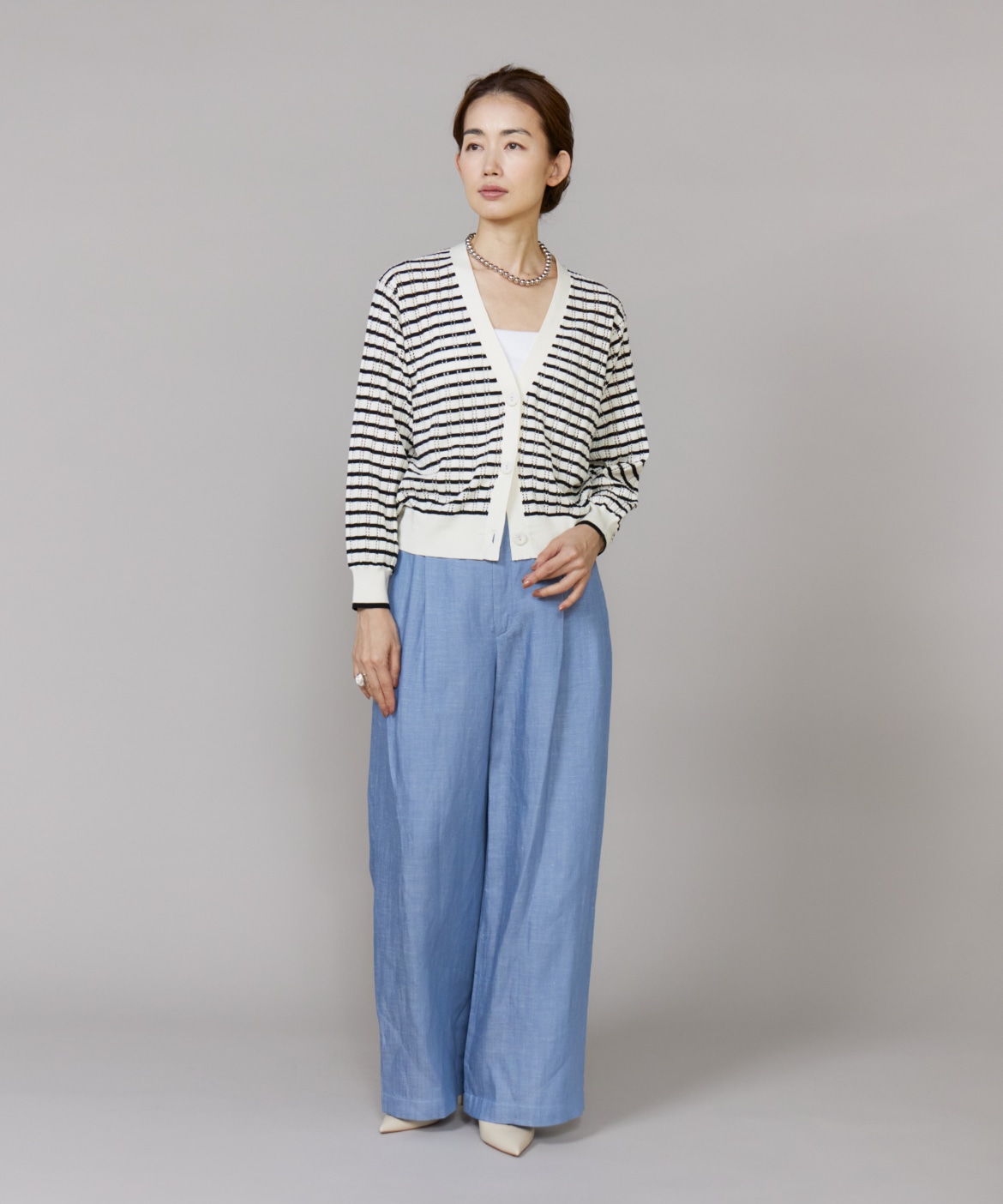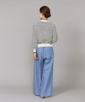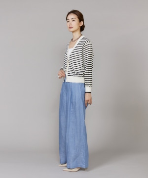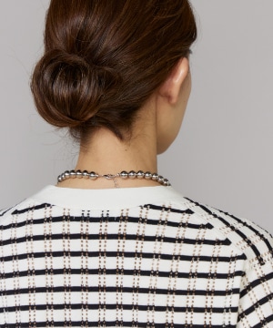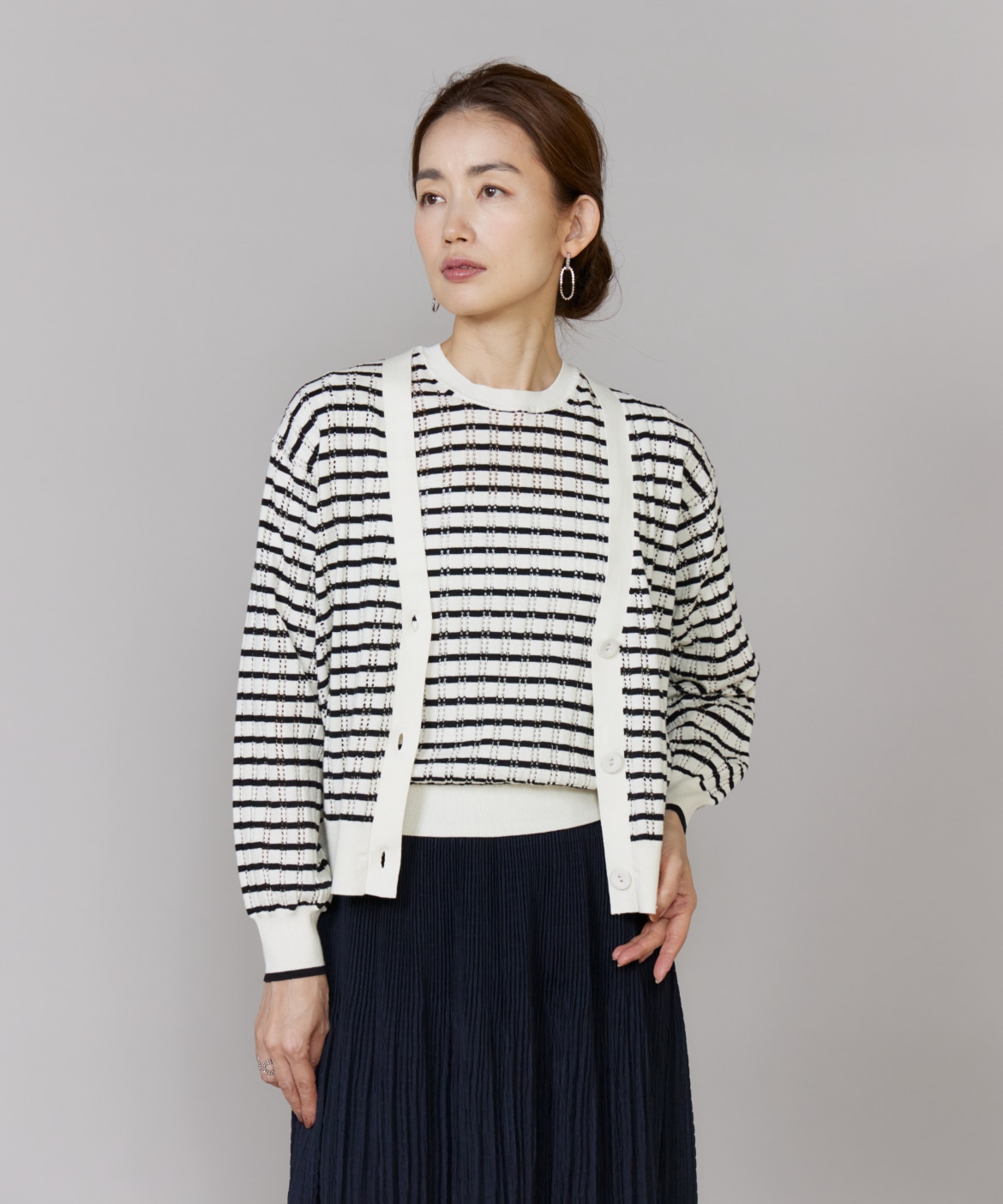 透かし柄リブクルーVネックカーディガン
