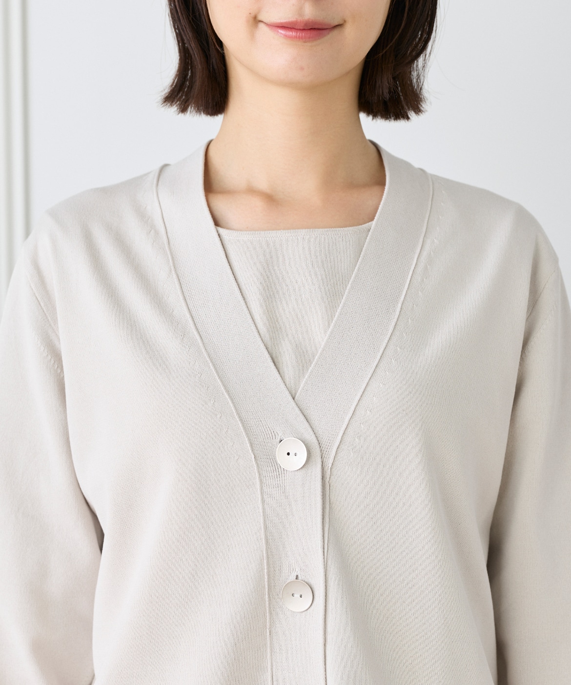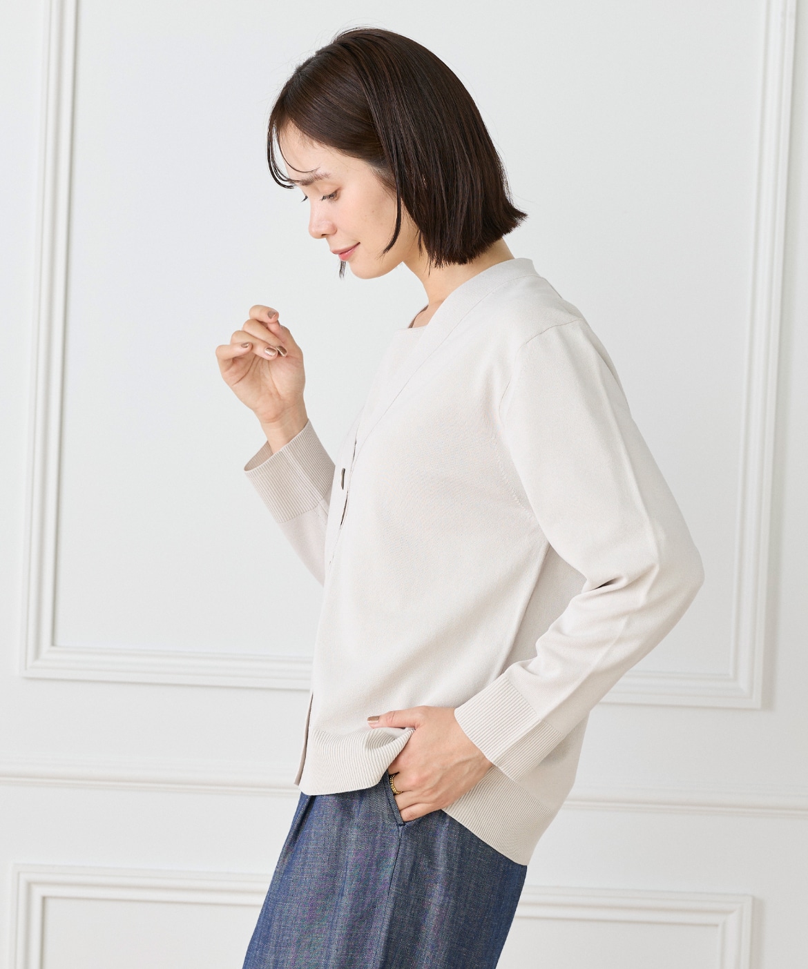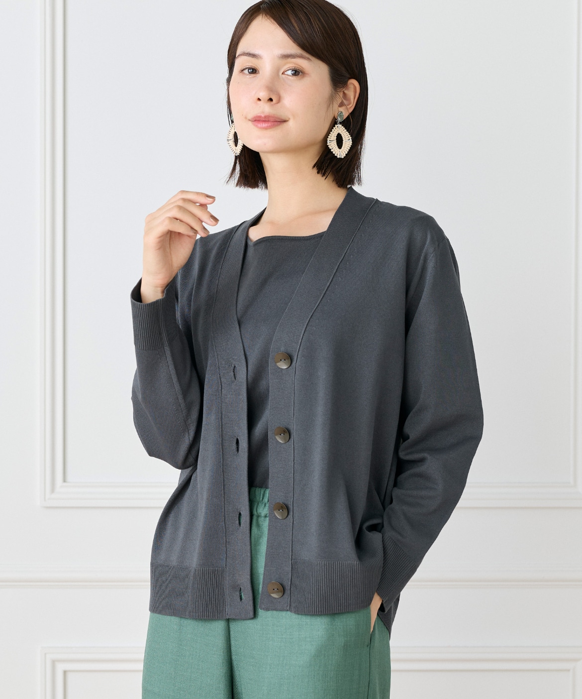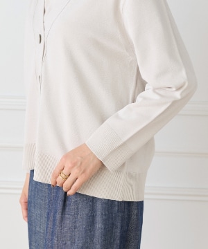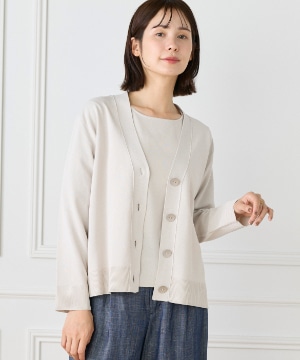 ストレッチ糸を使用した、程よいハリ感のある天竺編みカーディガン。さらっとした軽やかなタッチで、季節の変わり目にも快適に着られる一枚です。メタルボタンをあしらうことでナチュラルになりすぎず、さりげなく洗練された印象に。ヒップが隠れる着丈とラフに羽織れるサイジングで、デイリーに活躍します。