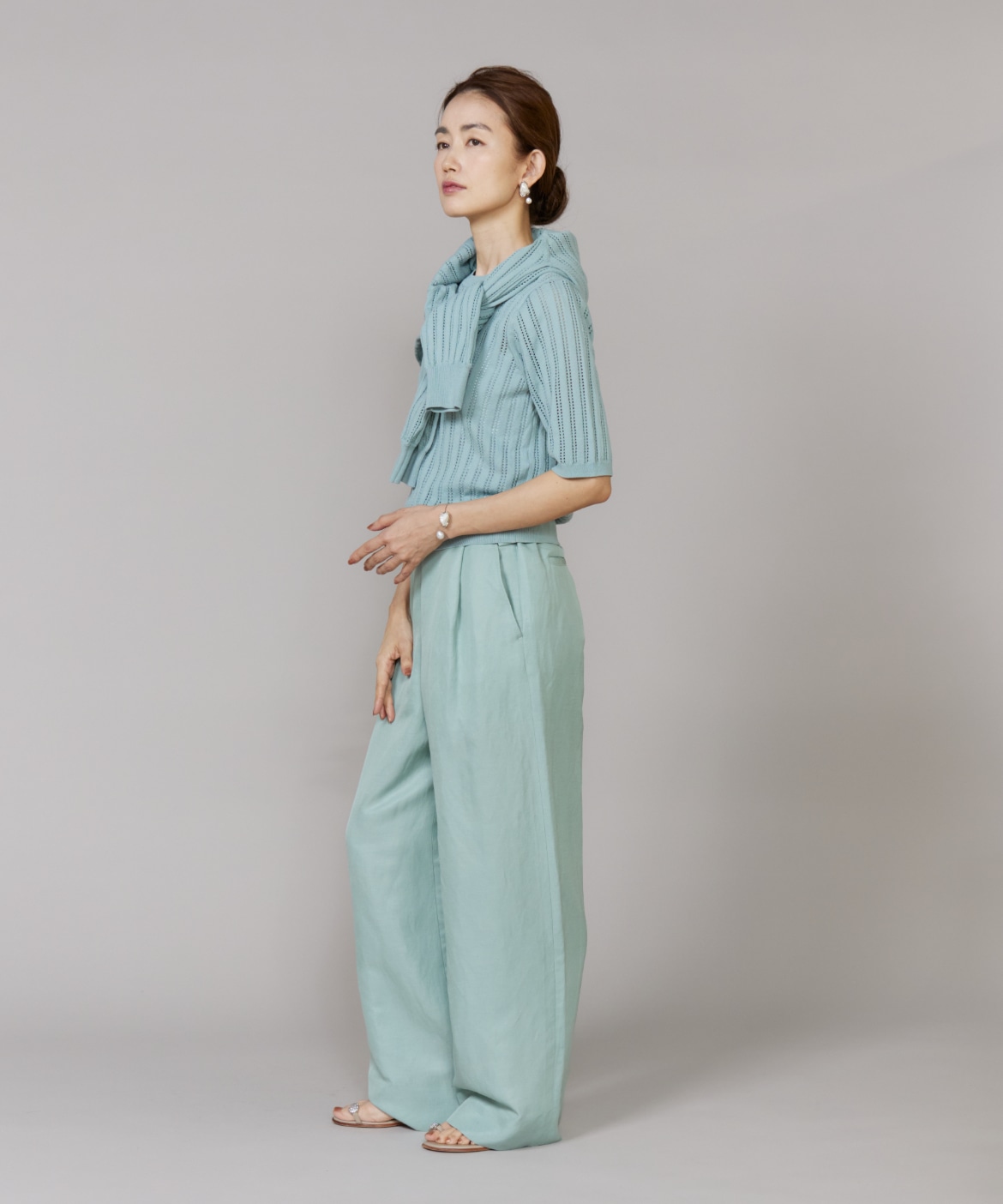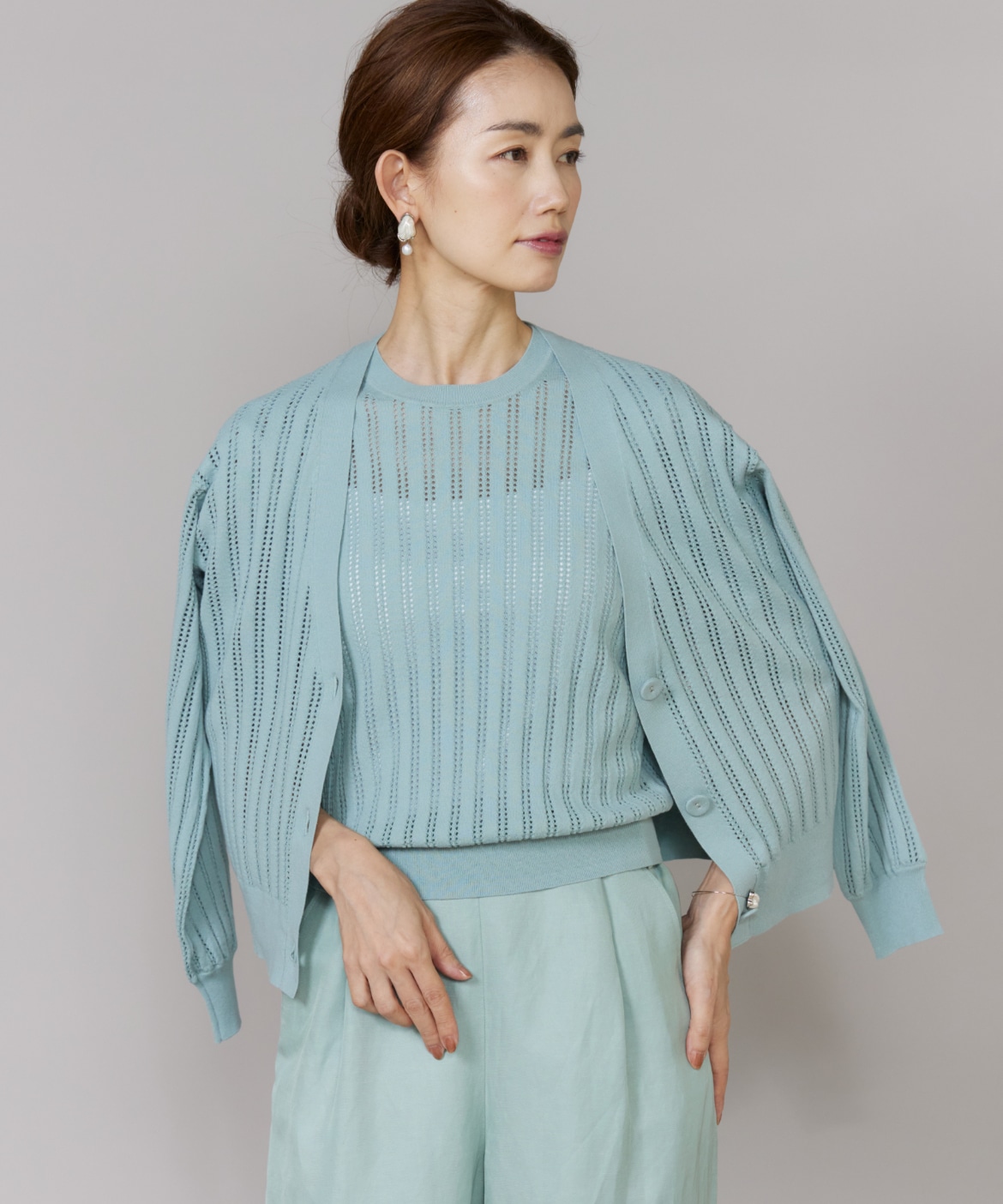 綿糸の細番手にストレッチ性の高いPE糸を撚り合わせた素材を使用し、編み目が詰まったさらっとした肌触りに仕上げました。リブ編みに透かし柄をあしらい、表情感のある編地が特徴。