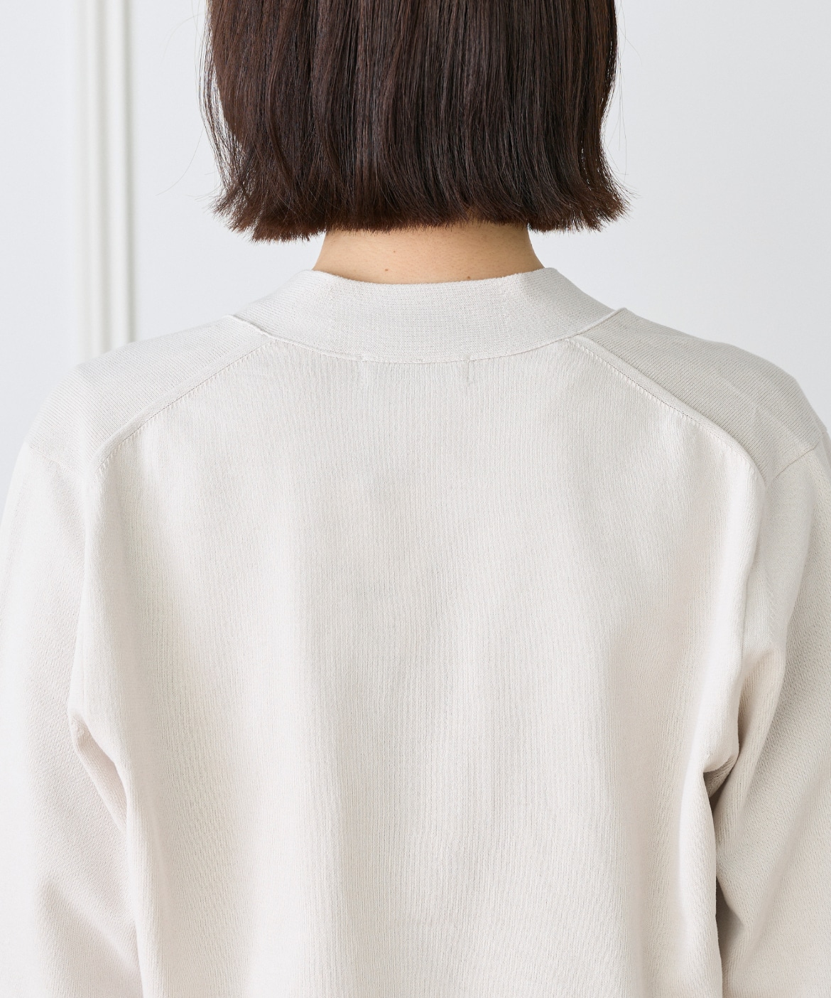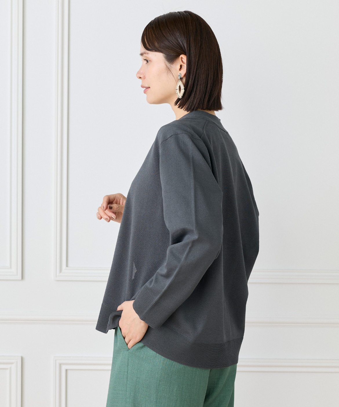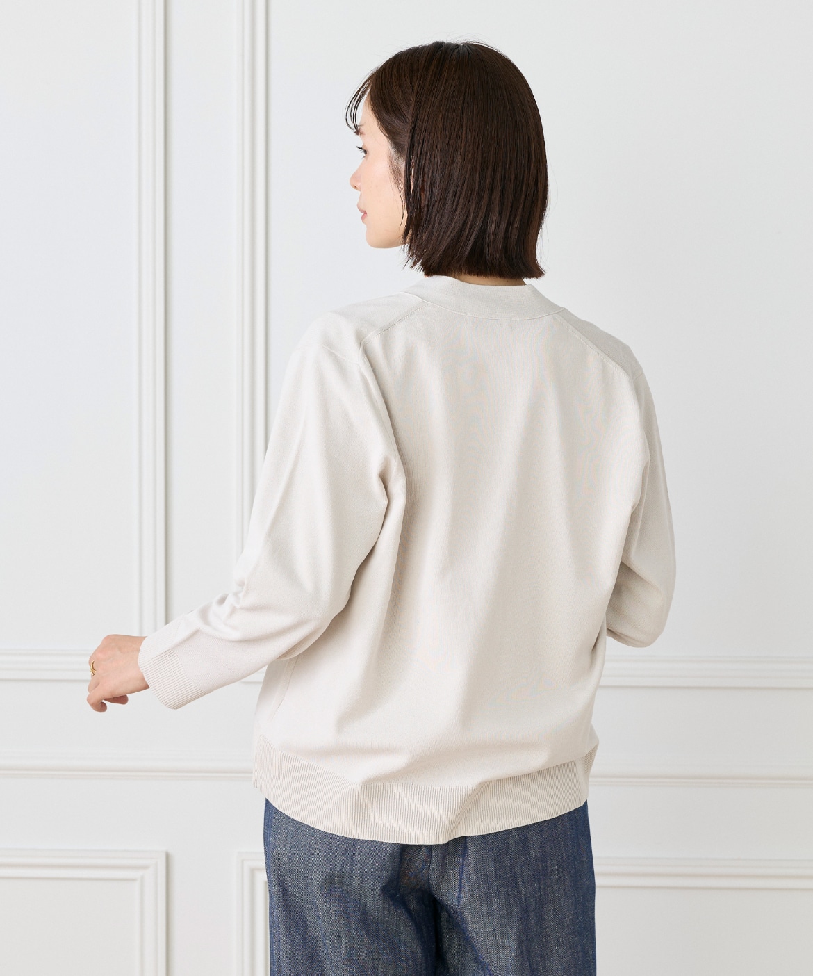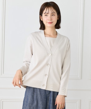 ストレッチ糸を使用した、程よいハリ感のある天竺編みカーディガン。さらっとした軽やかなタッチで、季節の変わり目にも快適に着られる一枚です。メタルボタンをあしらうことでナチュラルになりすぎず、さりげなく洗練された印象に。ヒップが隠れる着丈とラフに羽織れるサイジングで、デイリーに活躍します。