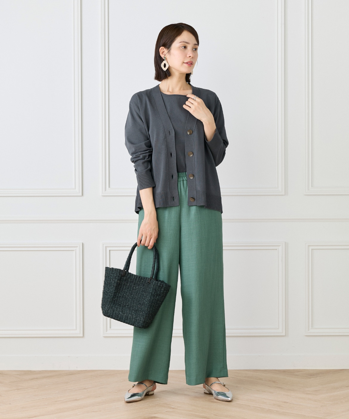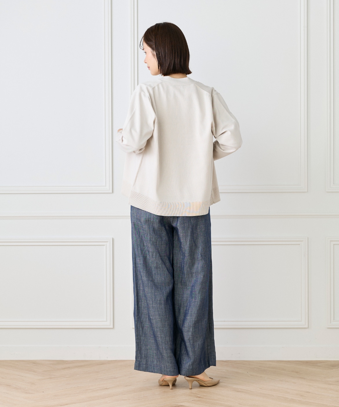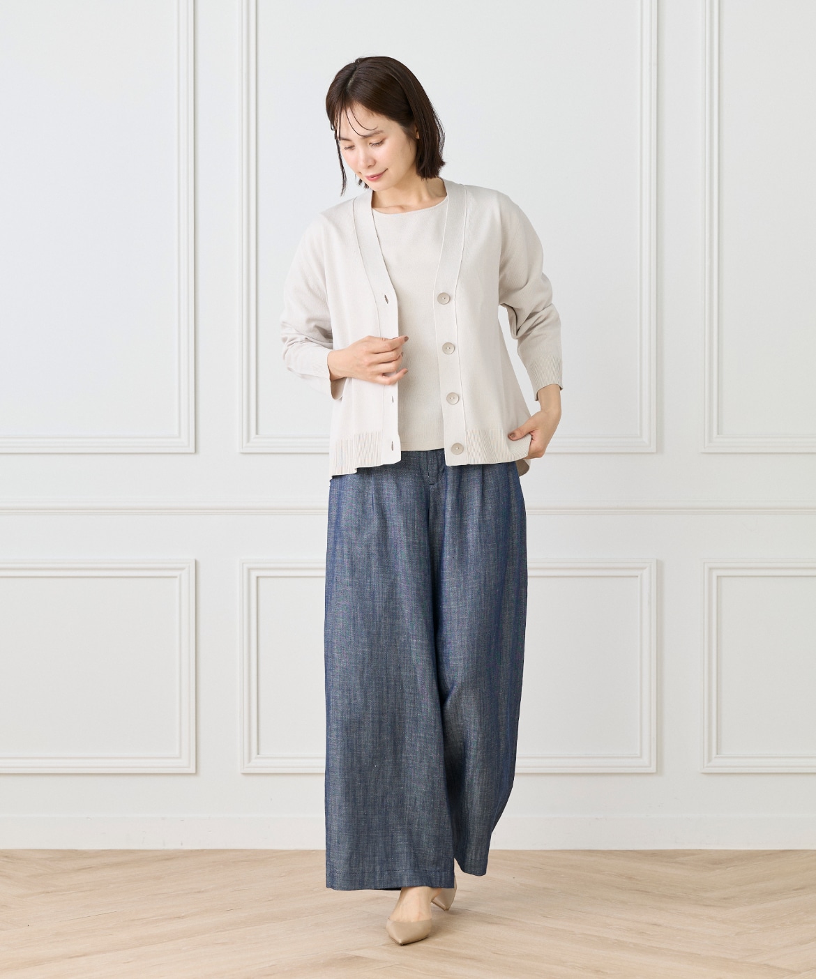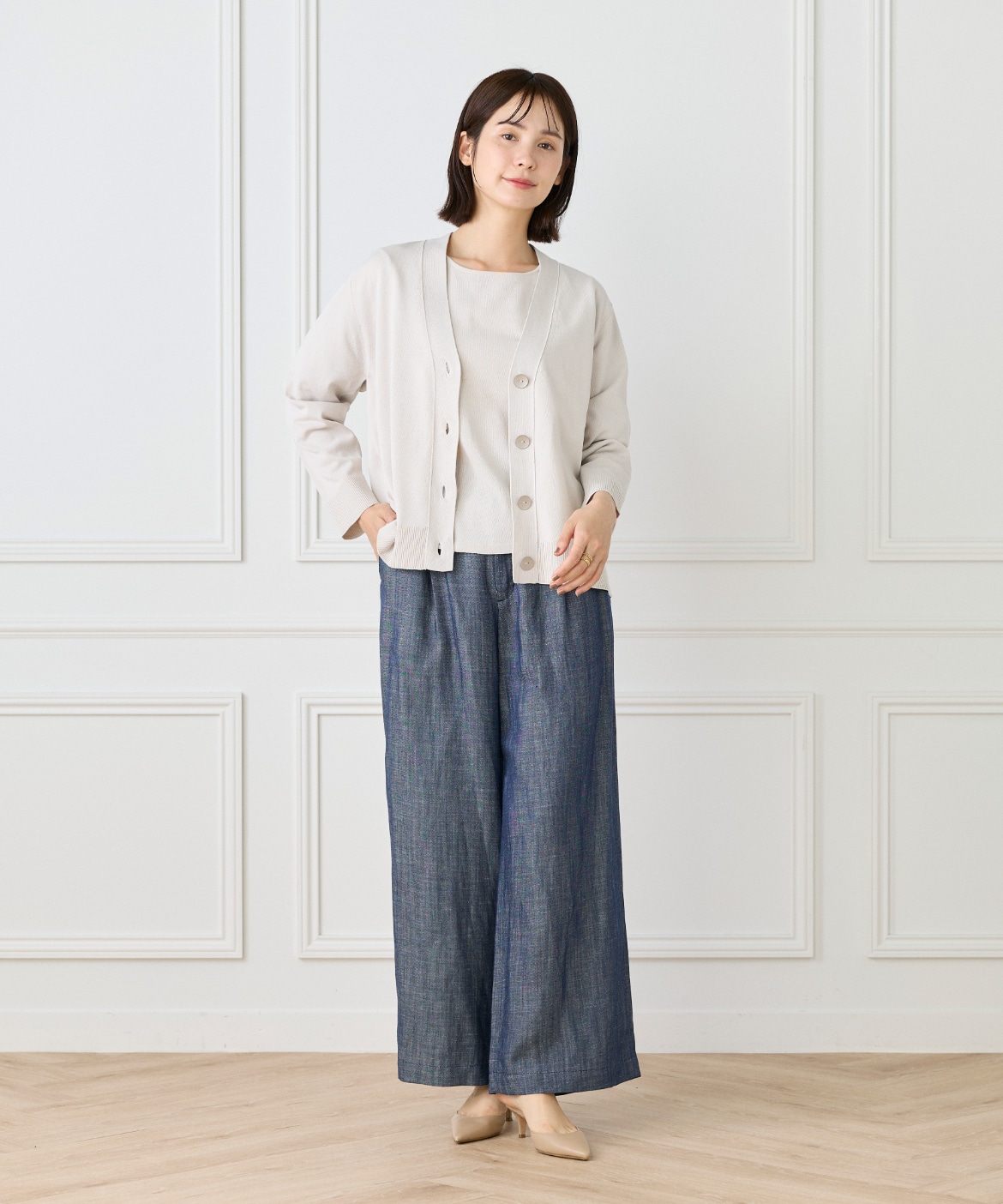 ストレッチ糸を使用した、程よいハリ感のある天竺編みカーディガン。さらっとした軽やかなタッチで、季節の変わり目にも快適に着られる一枚です。メタルボタンをあしらうことでナチュラルになりすぎず、さりげなく洗練された印象に。ヒップが隠れる着丈とラフに羽織れるサイジングで、デイリーに活躍します。