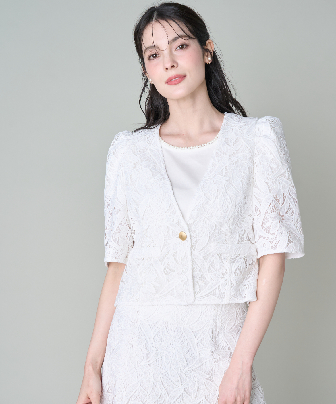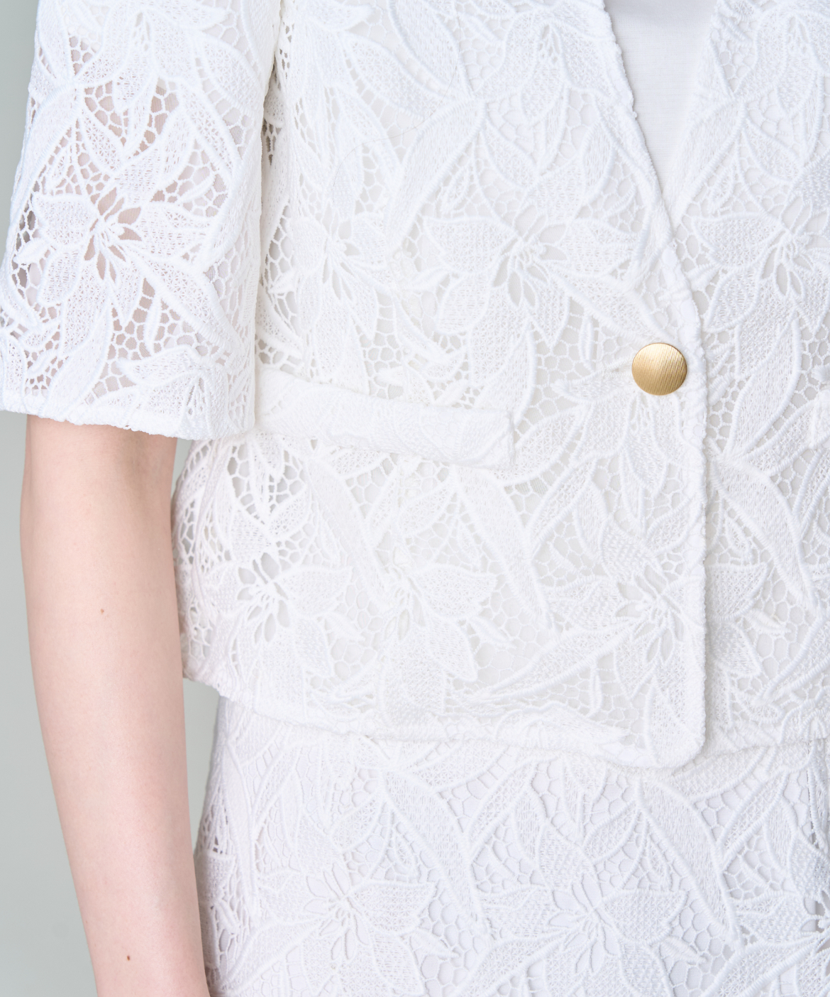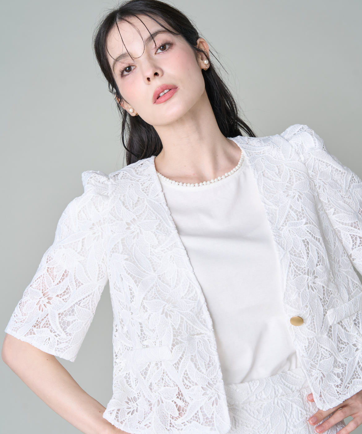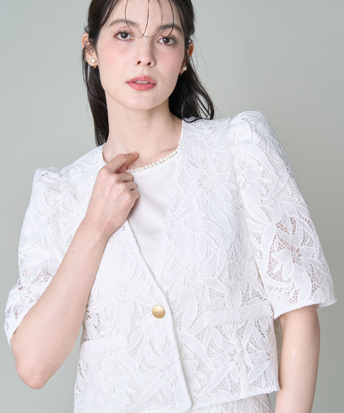 大胆なレースが目を引く半袖ジャケット。華やかさがありながら、透け感のある裏地で軽やかに着られる一枚です。白と黒の2色展開に、こだわりのカラーで仕上げた金ボタンが上品なアクセント。羽織るだけでコーディネートを華やかに引き上げてくれます。同素材のスカートとのセットアップなら、より洗練された印象に。入卒や学校行事はもちろん、デニム合わせなどカジュアルスタイルにもおすすめです。