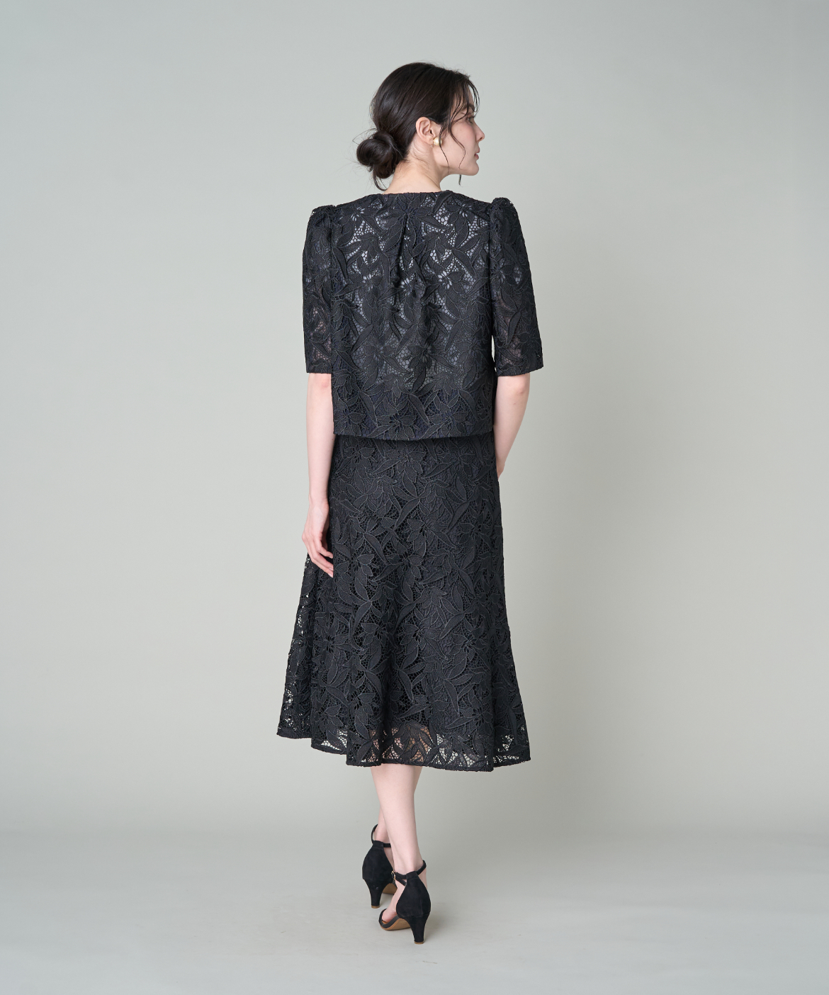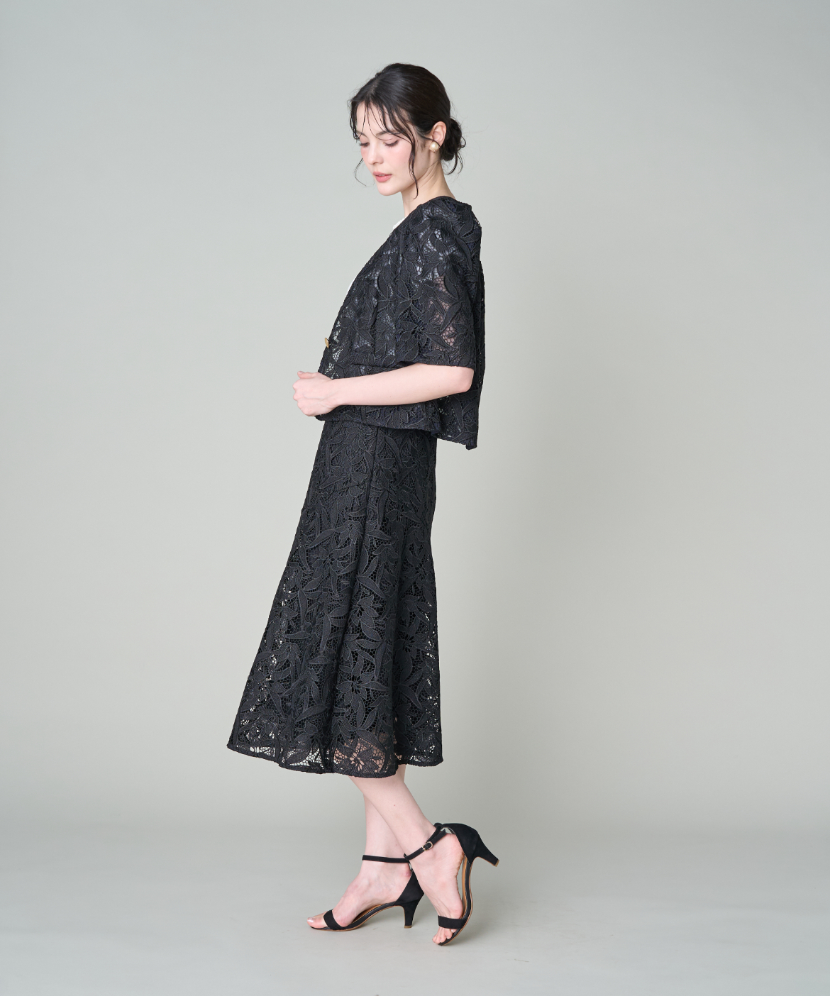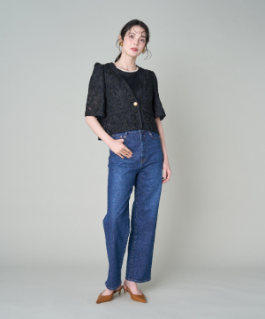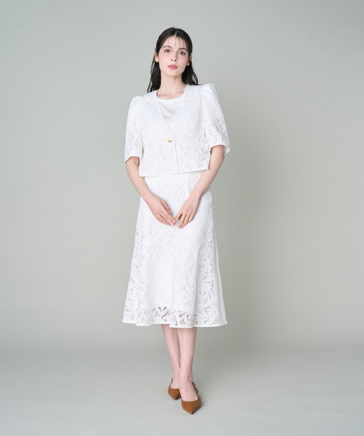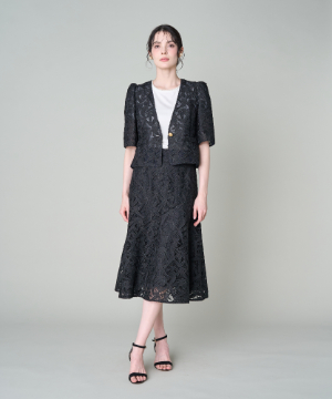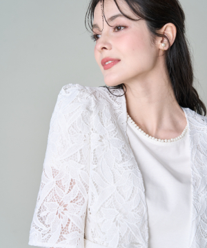 大胆なレースが目を引く半袖ジャケット。華やかさがありながら、透け感のある裏地で軽やかに着られる一枚です。白と黒の2色展開に、こだわりのカラーで仕上げた金ボタンが上品なアクセント。羽織るだけでコーディネートを華やかに引き上げてくれます。同素材のスカートとのセットアップなら、より洗練された印象に。入卒や学校行事はもちろん、デニム合わせなどカジュアルスタイルにもおすすめです。