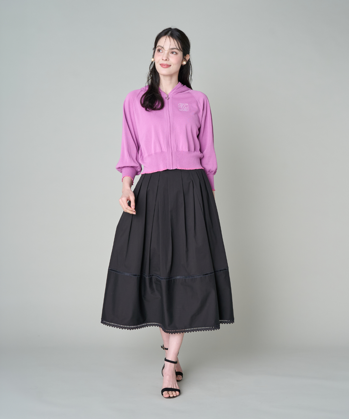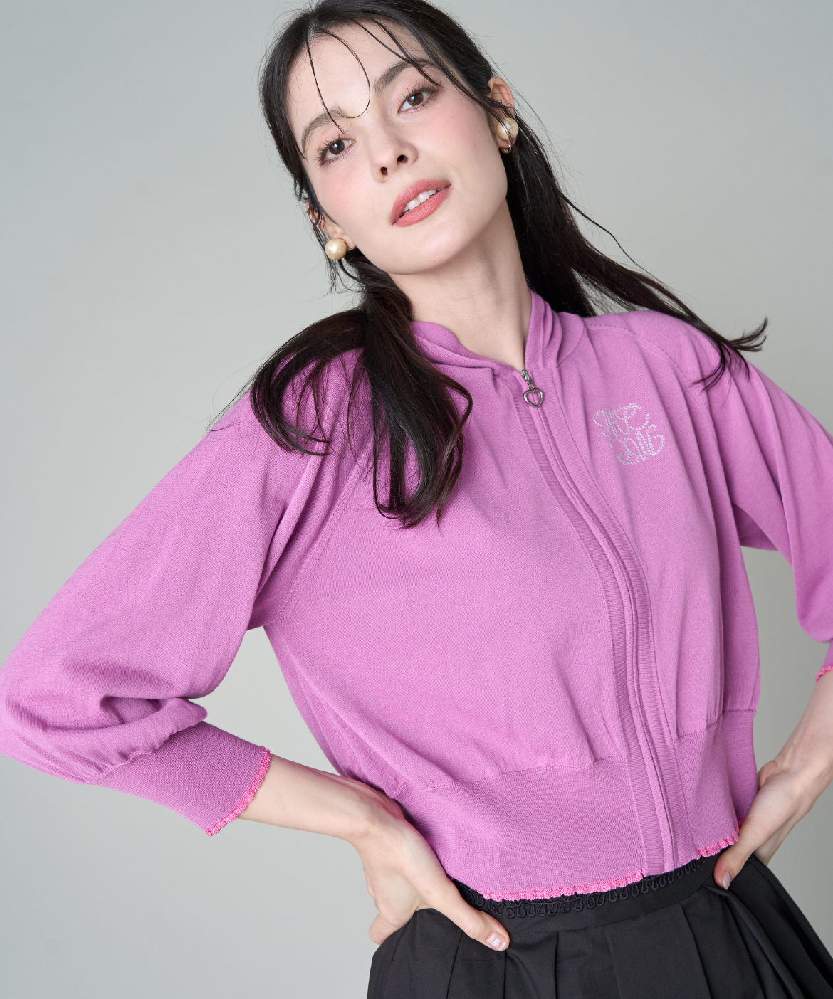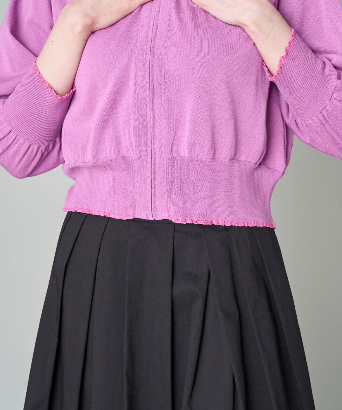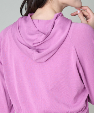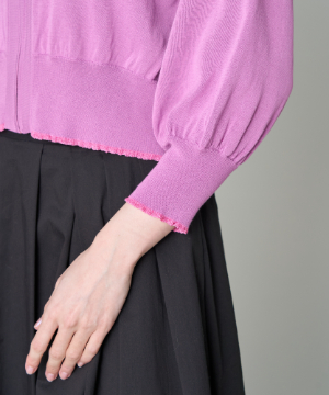シャリ感のある素材で仕立てた、暑い季節に活躍するニットパーカー。ワンピースやスカートにバランスよく羽織れるコンパクトなサイズ感と短めの着丈が、Maglieらしい上品な印象を演出します。ふんわりとした袖のボリュームと、リブ端にあしらった華奢なフリルがさりげない華やかさをプラス。胸元のMaglieロゴもアクセントになっています。軽くてかさばらず持ち運びしやすく、冷房対策や季節の変わり目にも重宝する一枚です。