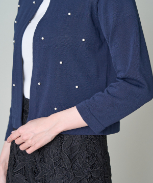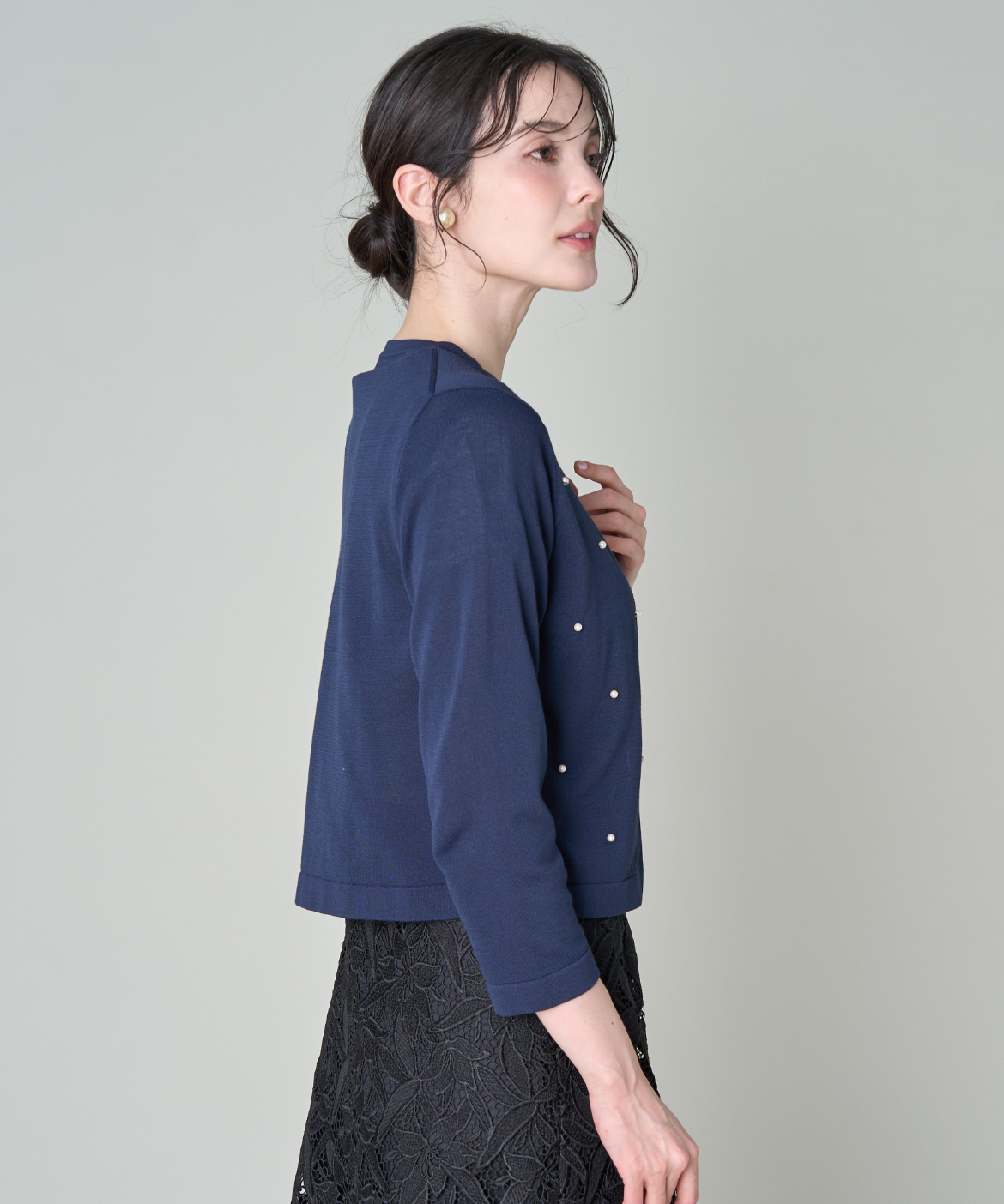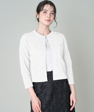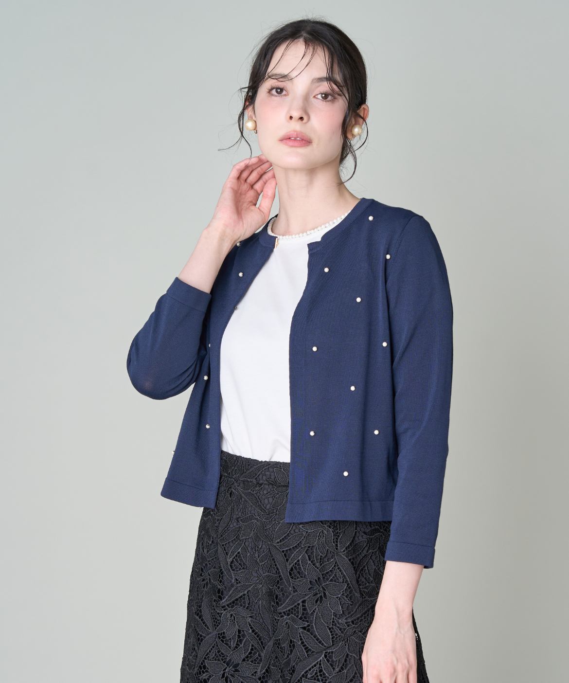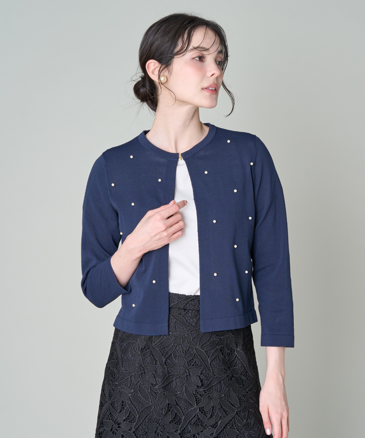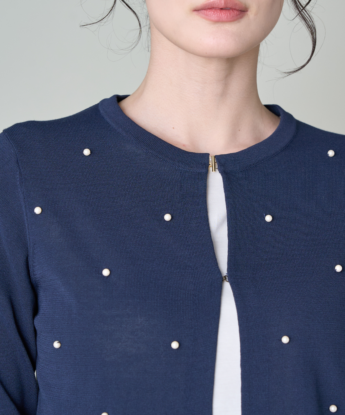 パール使いが華やかな、ニットカーディガン。きらっと光るゴールドのホックがアクセントの前開きデザインと、コンパクトなネックラインや短めの着丈で、ジャケット感覚でお使いいただけるデザインです。程よくハリ感がありきちんと見えを叶える素材感で、通勤にもハレの日にもオススメです。