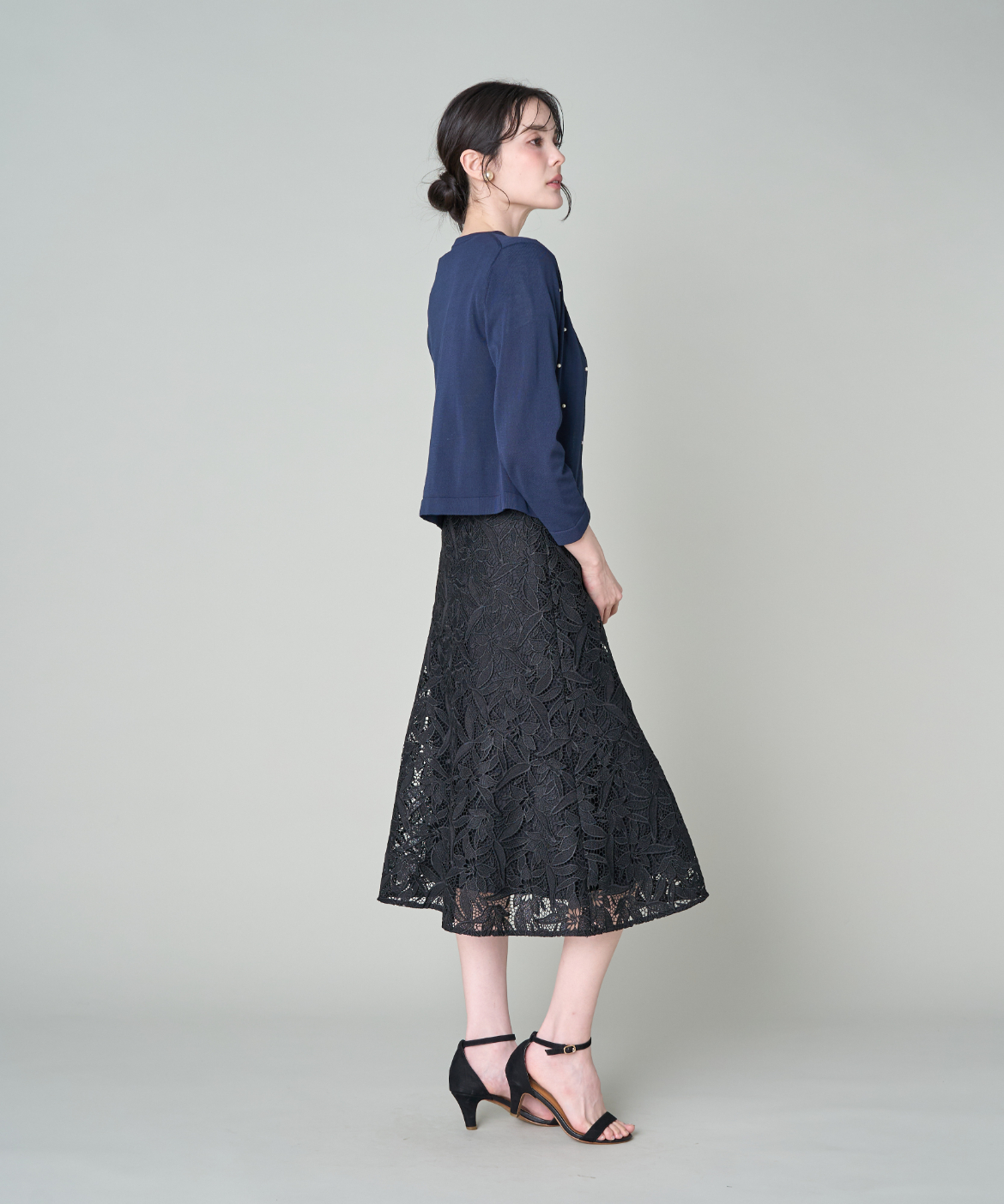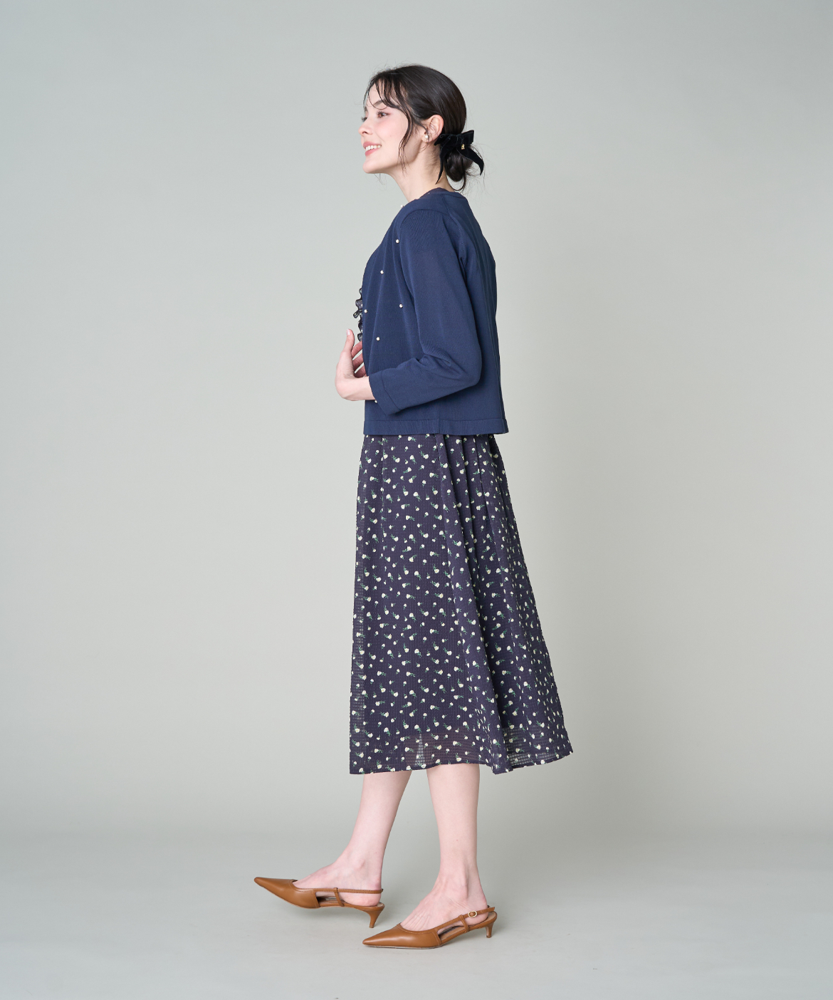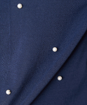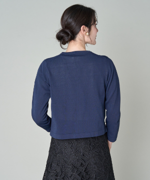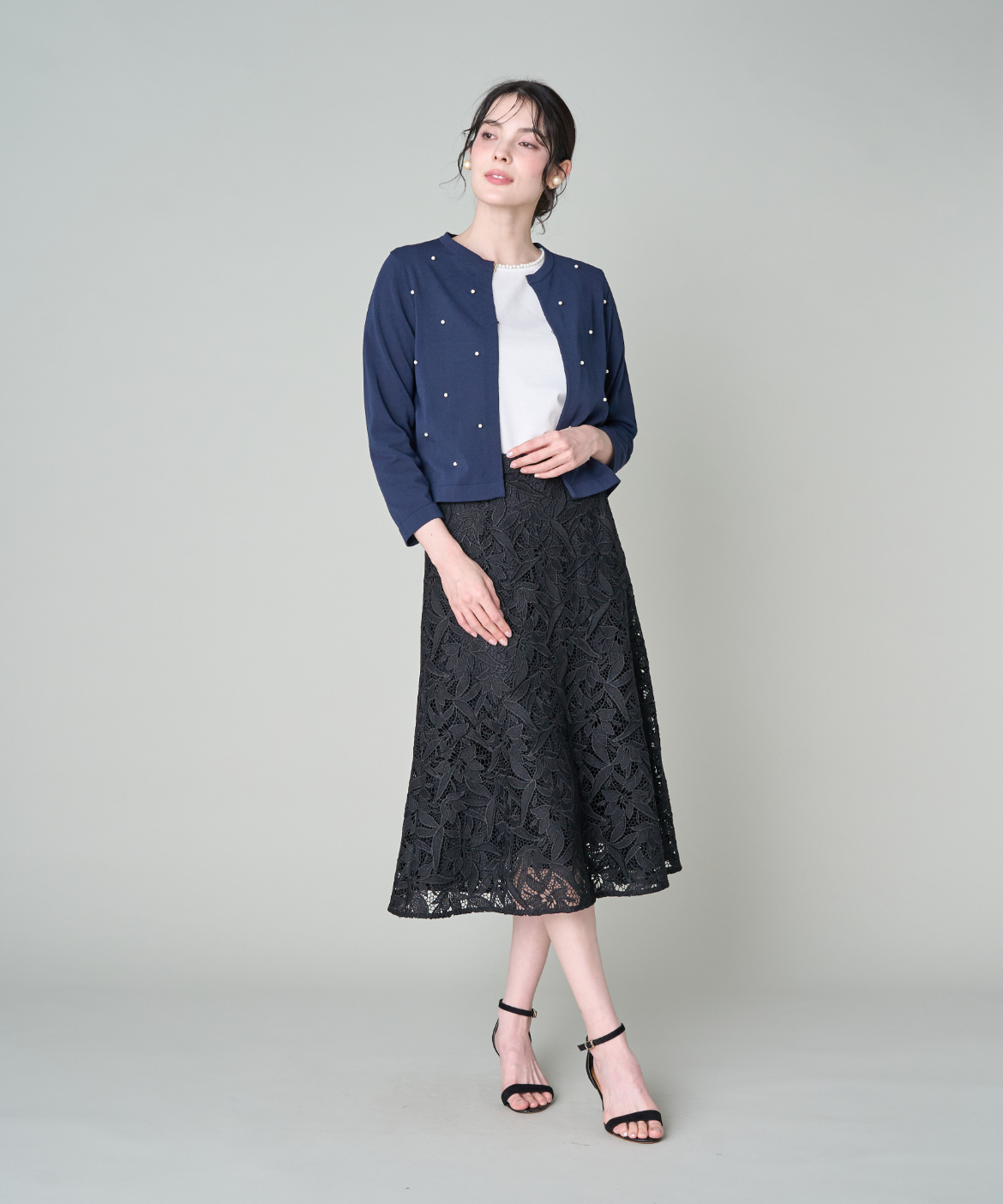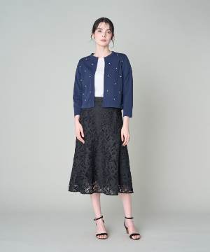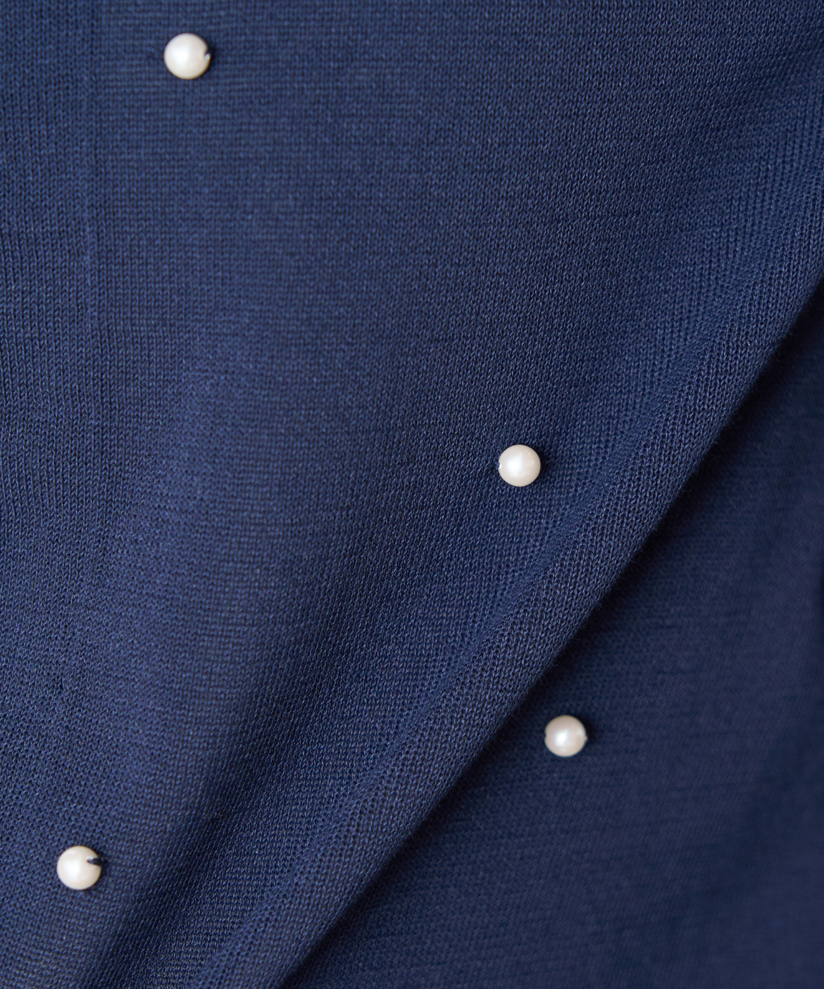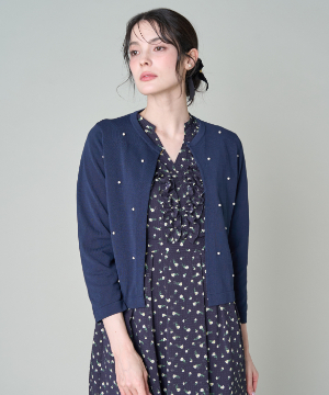 パール使いが華やかな、ニットカーディガン。きらっと光るゴールドのホックがアクセントの前開きデザインと、コンパクトなネックラインや短めの着丈で、ジャケット感覚でお使いいただけるデザインです。程よくハリ感がありきちんと見えを叶える素材感で、通勤にもハレの日にもオススメです。