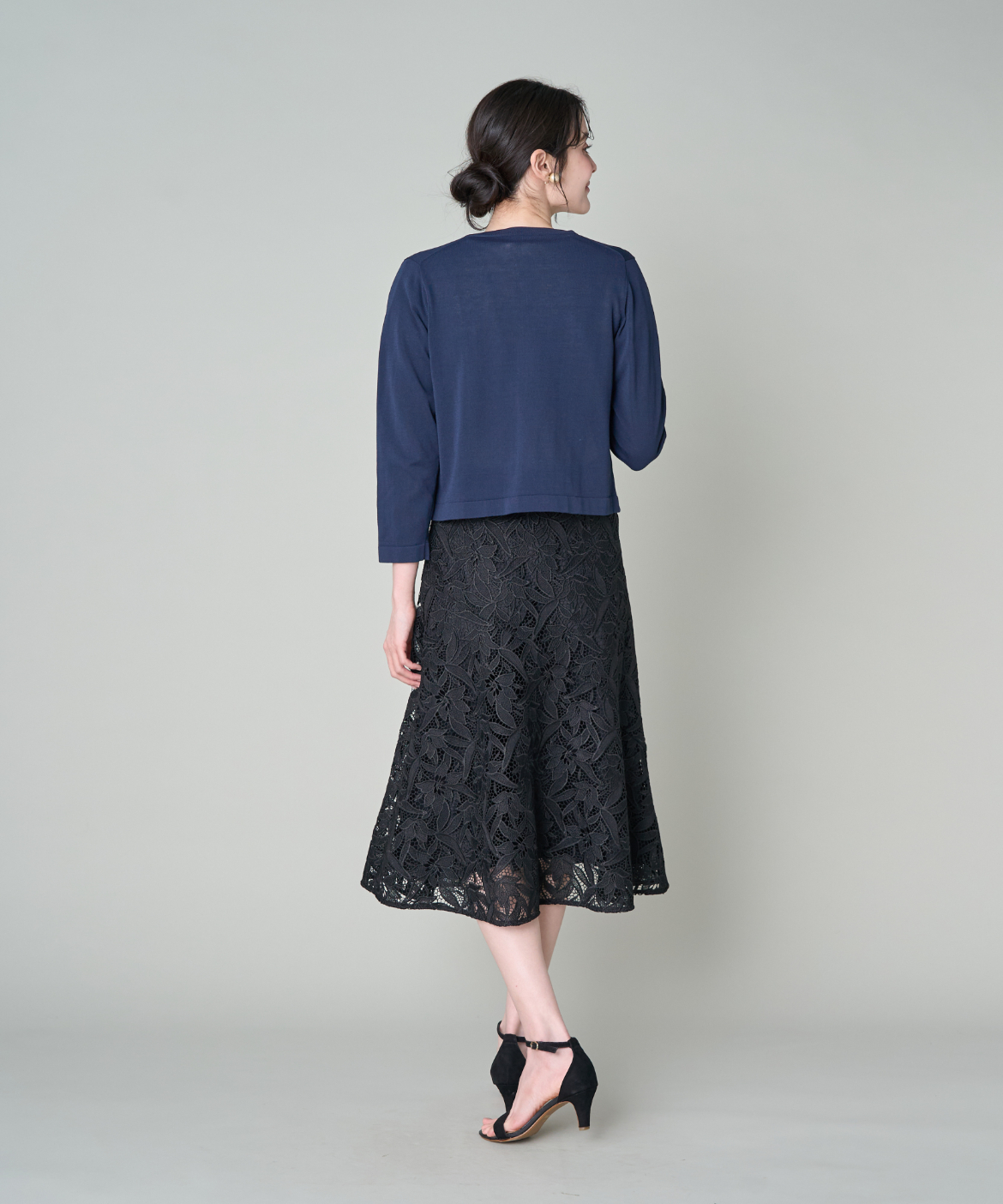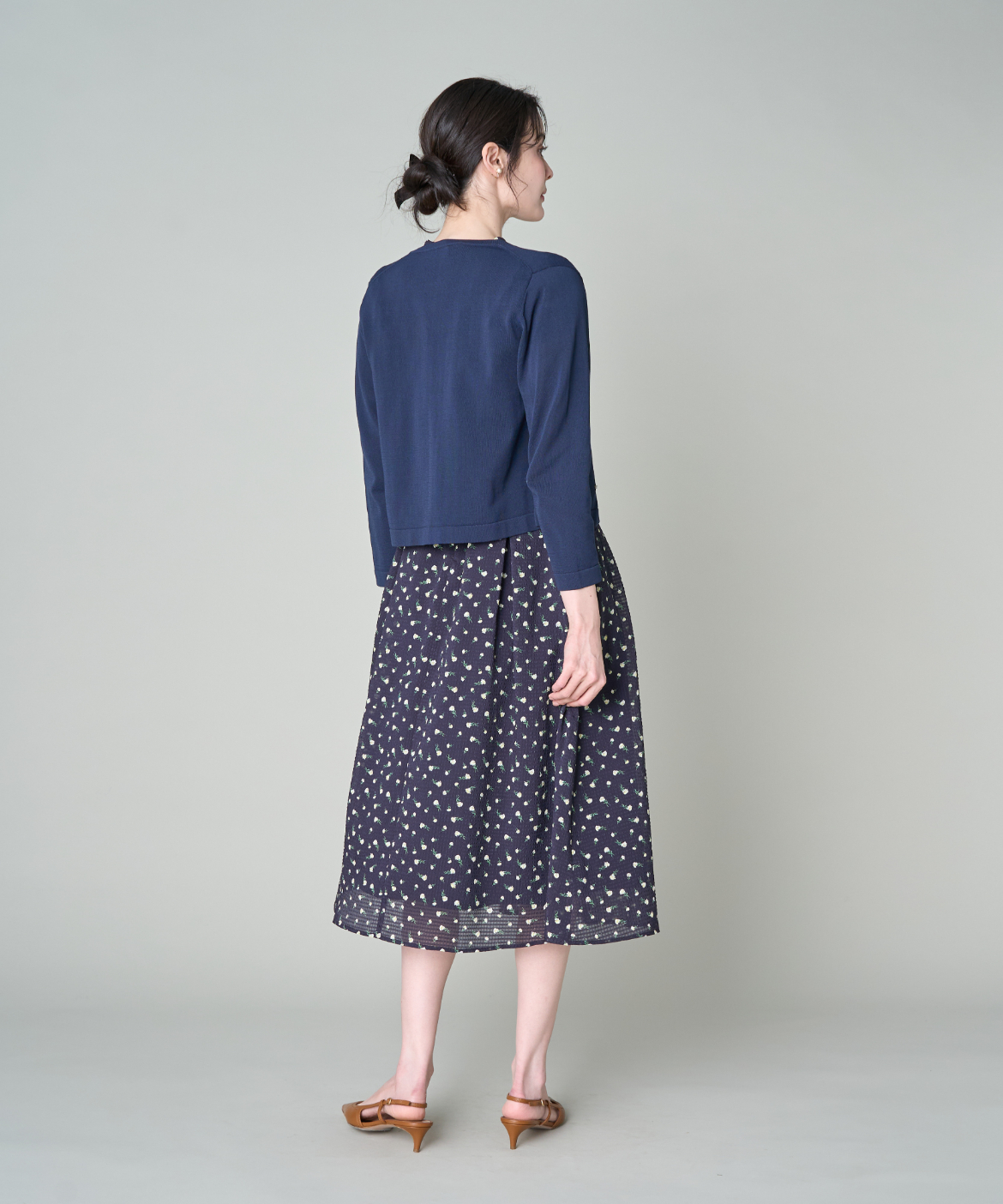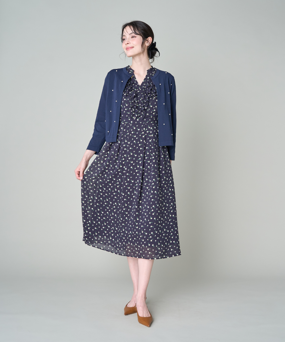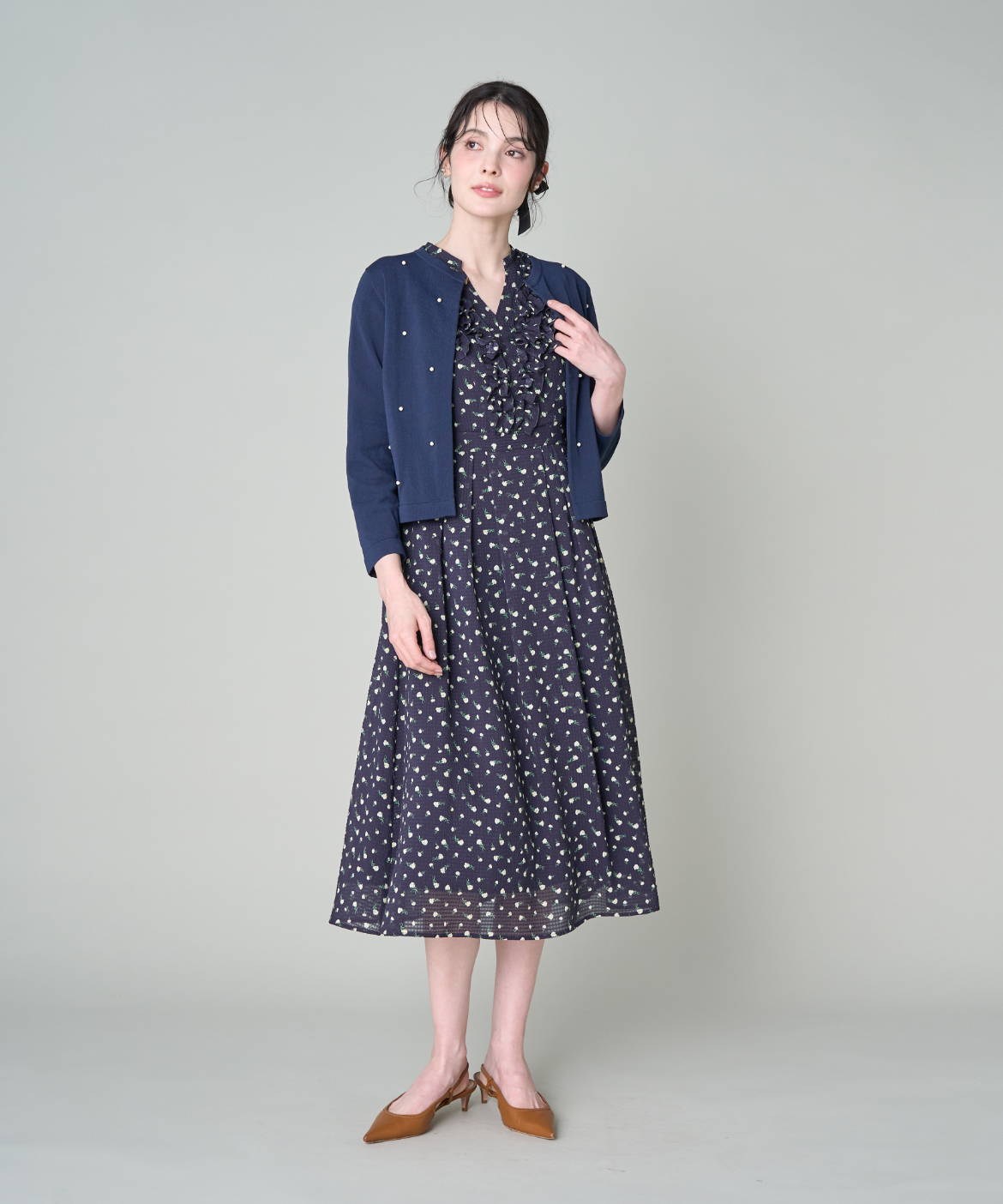 パール使いが華やかな、ニットカーディガン。きらっと光るゴールドのホックがアクセントの前開きデザインと、コンパクトなネックラインや短めの着丈で、ジャケット感覚でお使いいただけるデザインです。程よくハリ感がありきちんと見えを叶える素材感で、通勤にもハレの日にもオススメです。