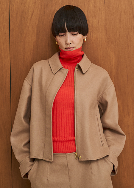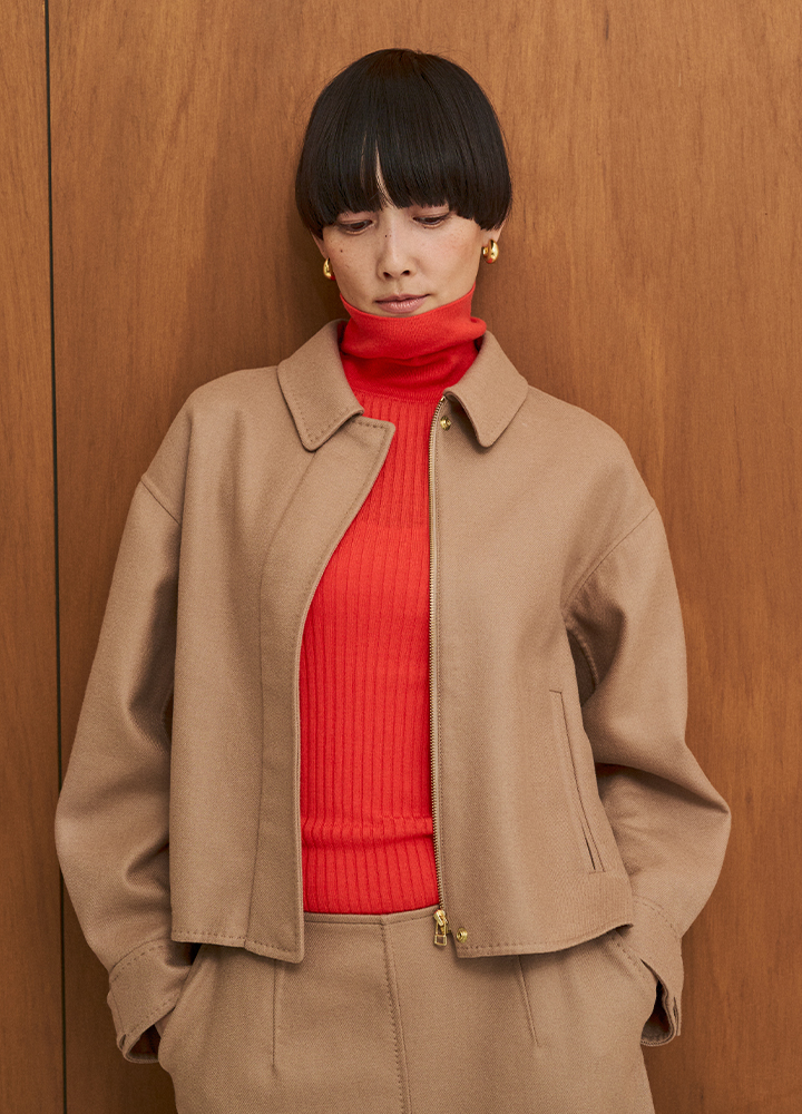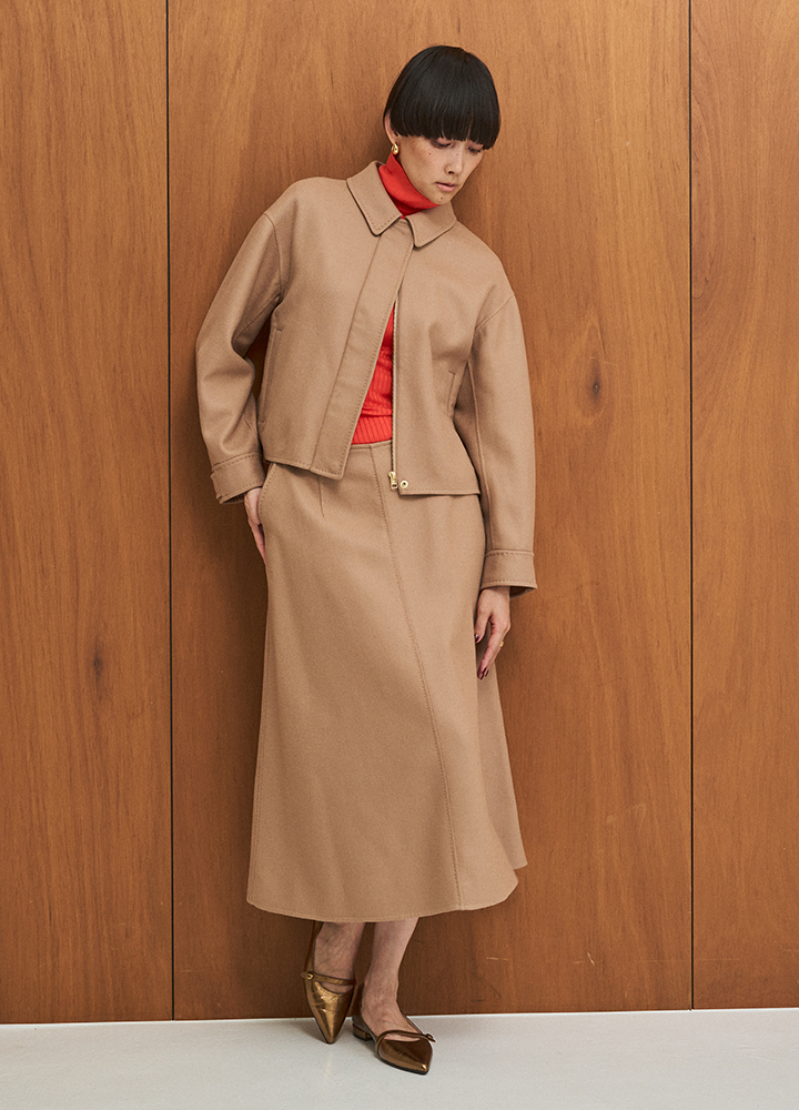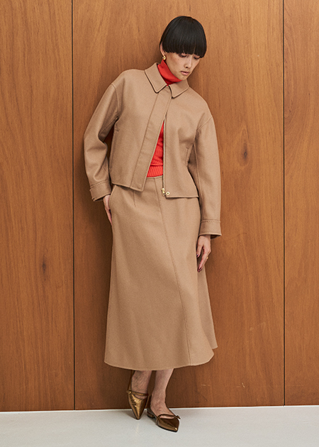 ミニマルなボクシーフォルムのブルゾンとフレアシルエットのスーツ
