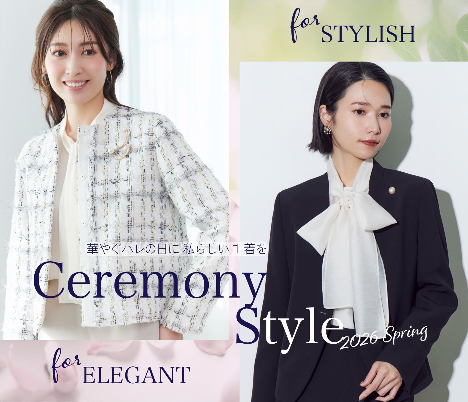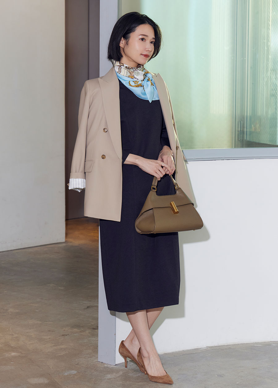 セレモニー服は普段使いしづらい印象ですが、このワンピースはお仕事着としても着回し力抜群。定番のジャケットを羽織ってももたつかず、小物でカジュアルさをプラスしていざ出勤!優しいコクーン仕立ての360度“美シルエット”は、プレゼンや登壇服として自身のハレの日にも重宝すること間違いなし。