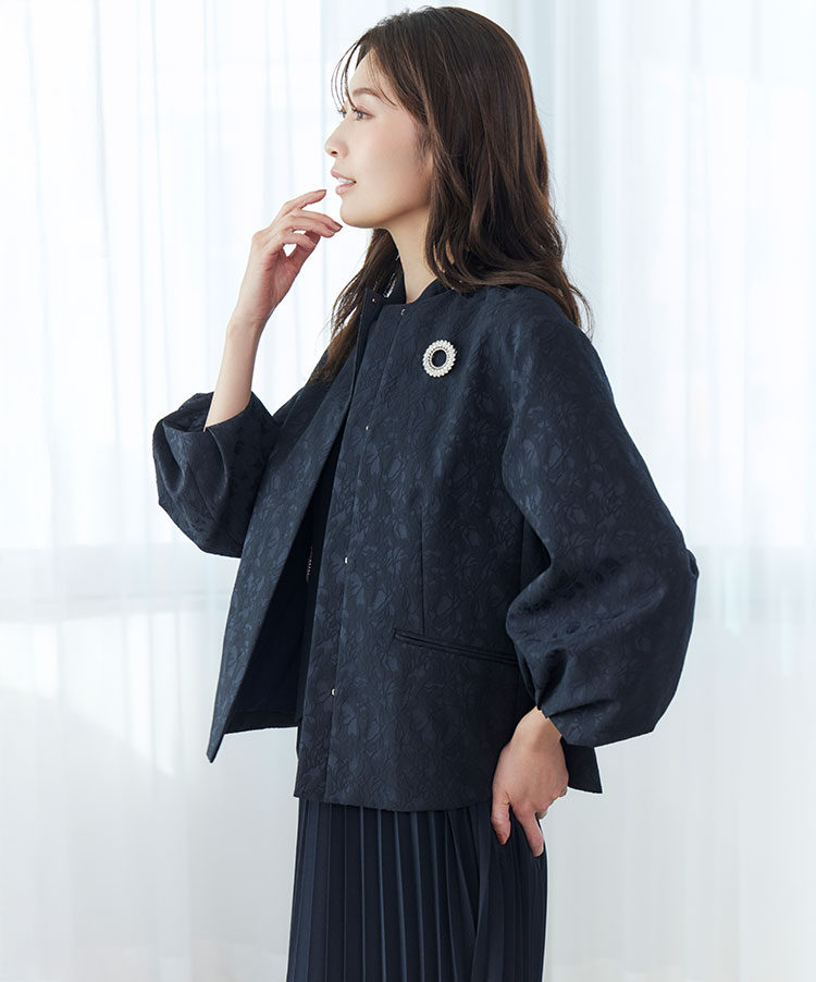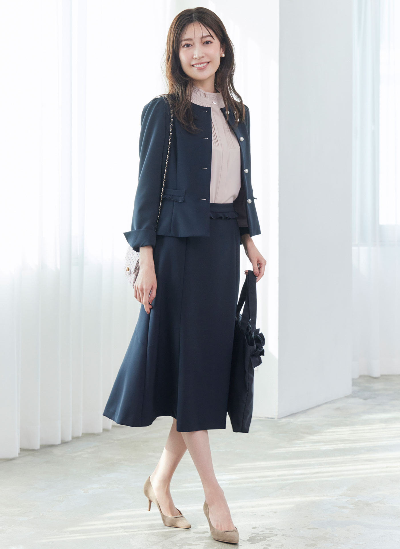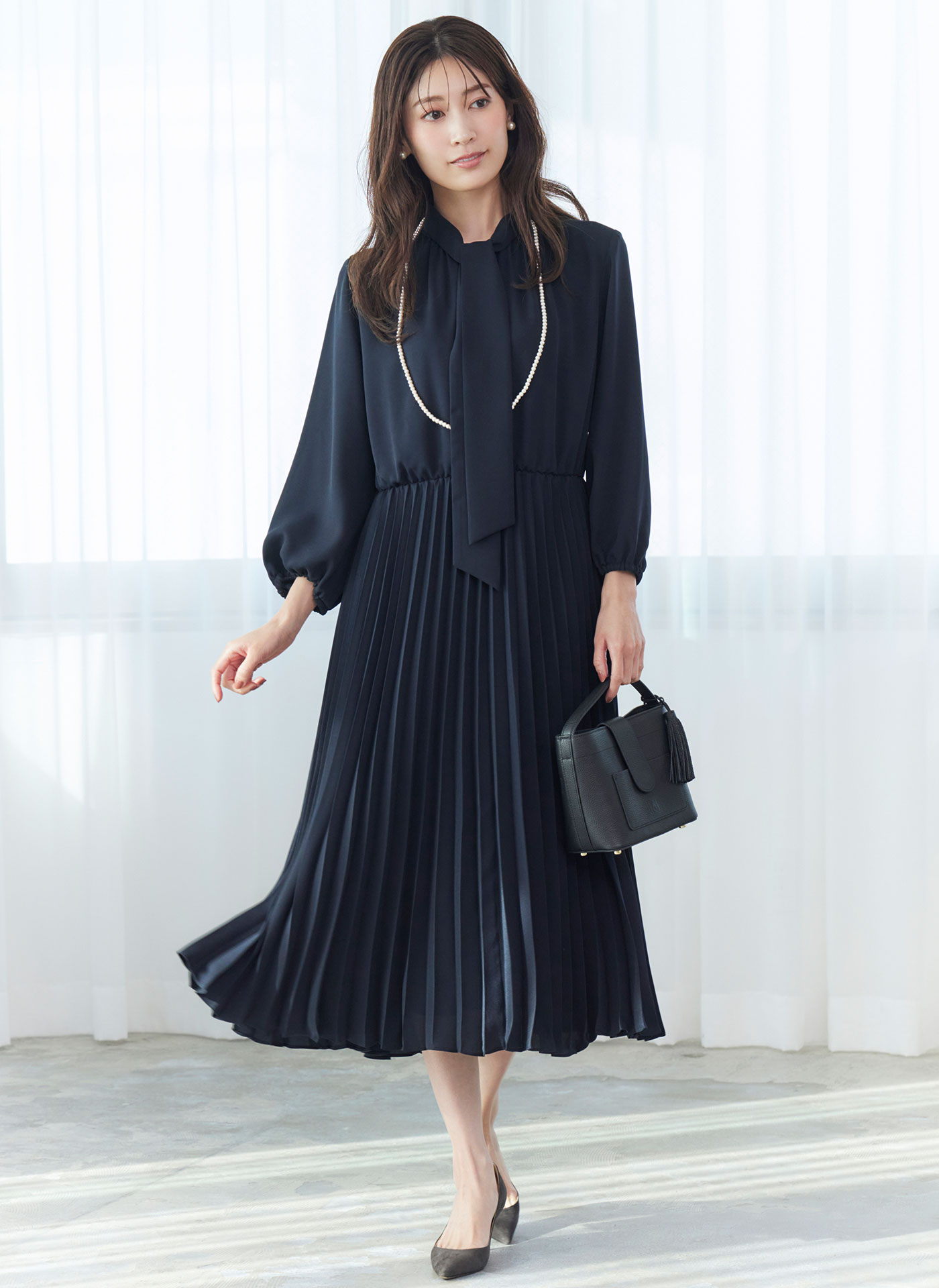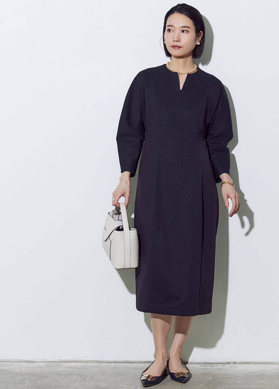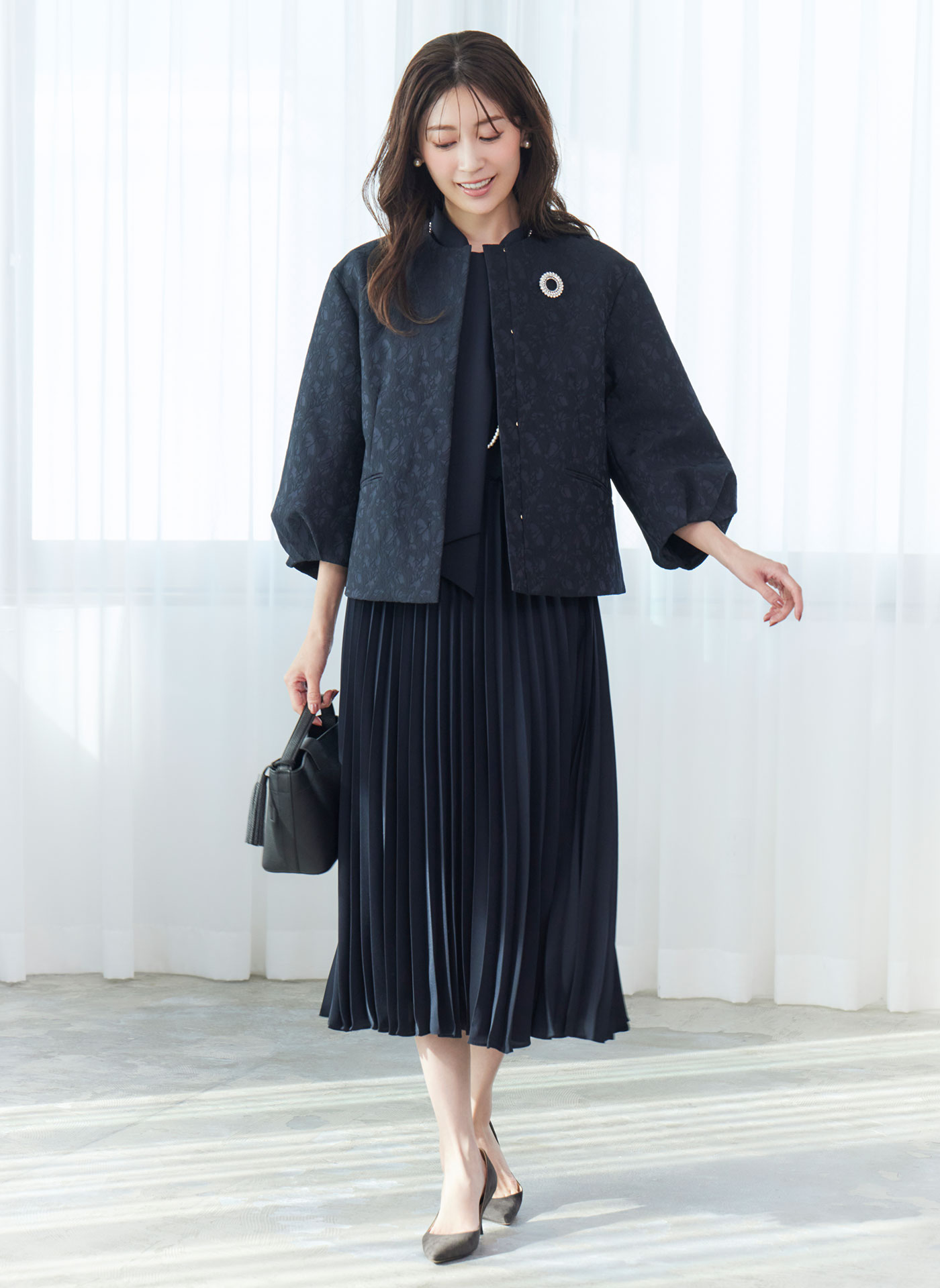 おごそかな雰囲気にもエレガントさは忘れたくないママにぴったりの安心ネイビーカラー。長時間座っていても疲れ知らずなのは、ワンピースならでは。程よい凹凸感のあるジャガードのジャケットを合わせて、素材の違いを楽しむオールネイビーコーディネートがおすすめ。