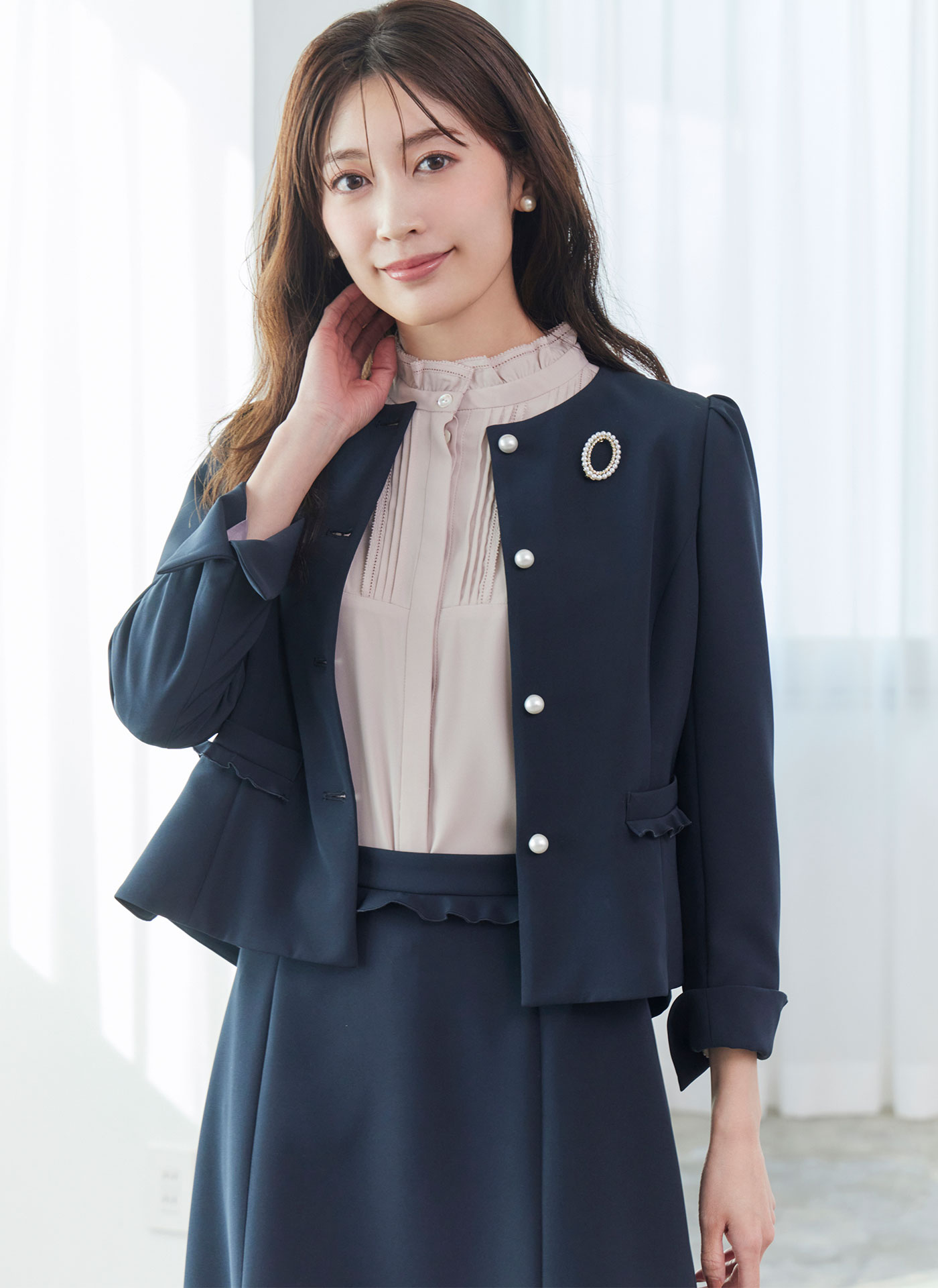 ジャケットのポケット、スカートのウエスト回りに施されたフリルも、主張しすぎないところがポイント。マーリエらしいピンクカラーのフリルブラウスを合わせて、とことんフェミニンを楽しみたいママにはぴったりの1着。
