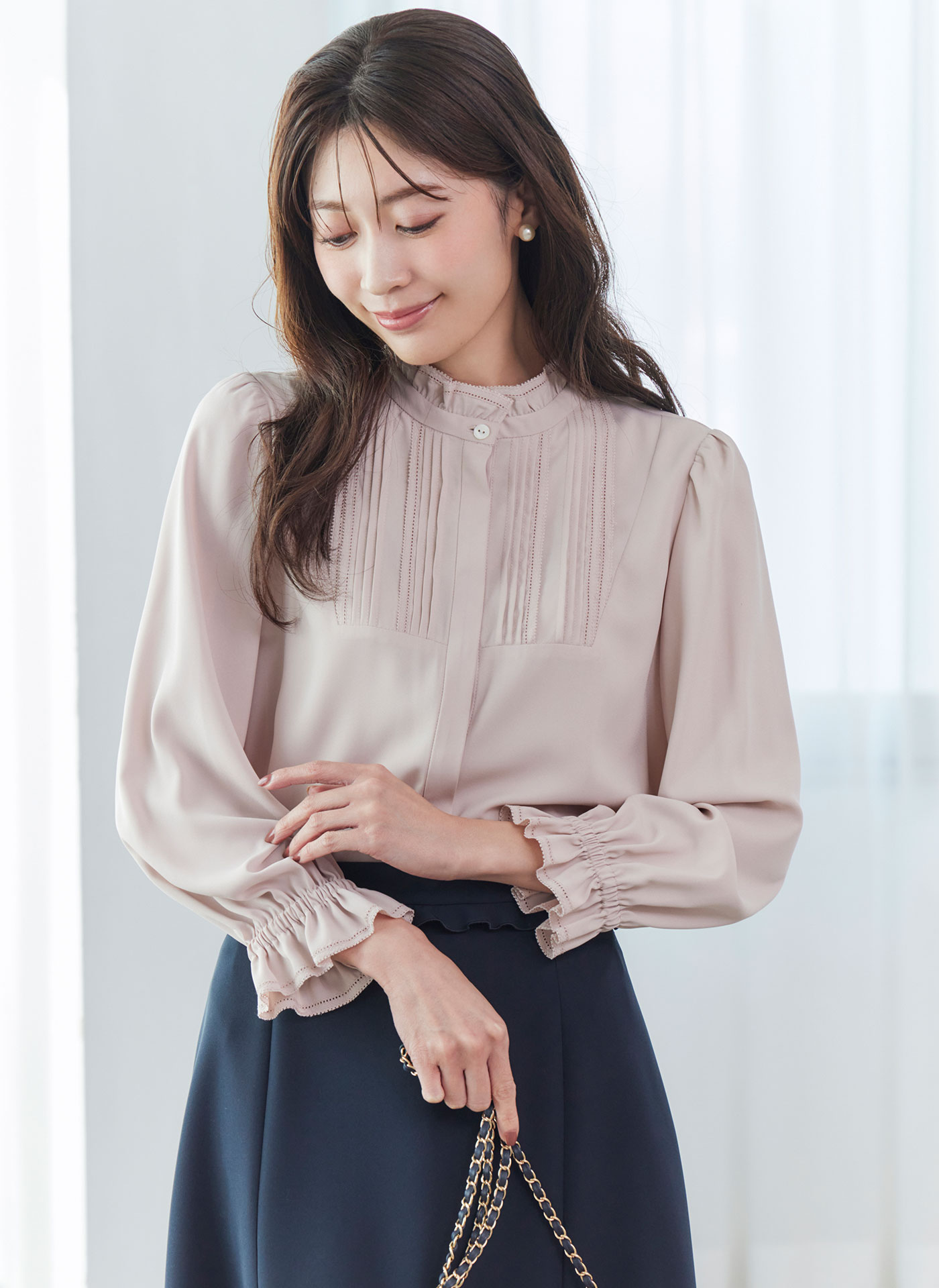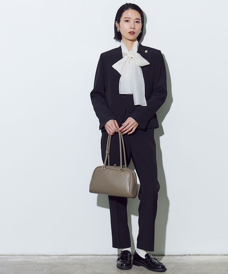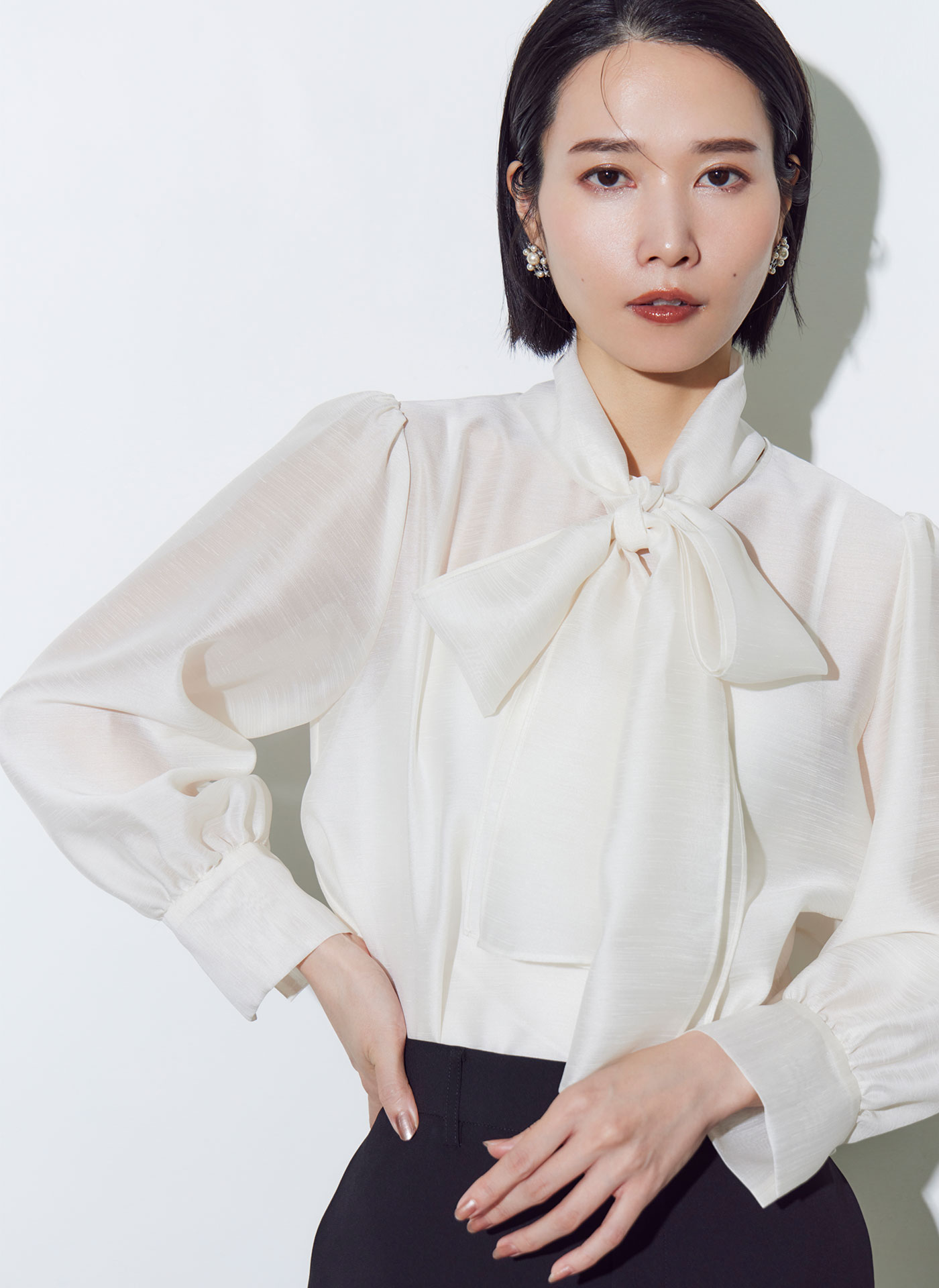 顔周りを明るく華やかに見せてくれる大きなリボンを主役に、INED定番のジョーゼットスーツをスタイリング。ボトムはテーパードパンツをチョイスしてバランスを。ブラウスのシアー、柔らかな素材感は、きりっとした中に程よい甘さをプラスしてくれます。