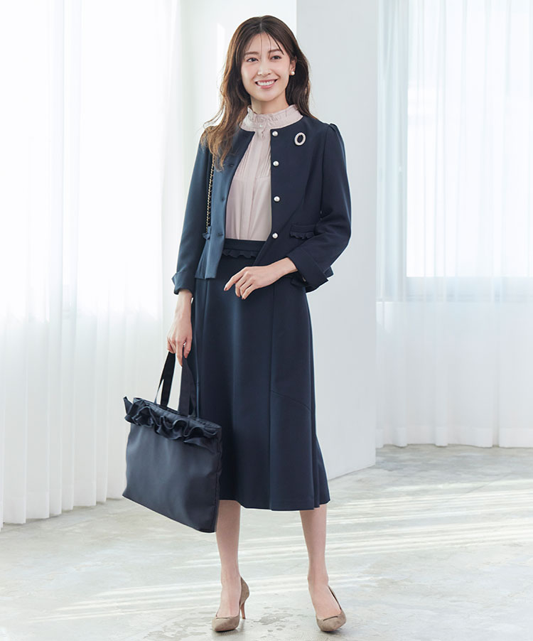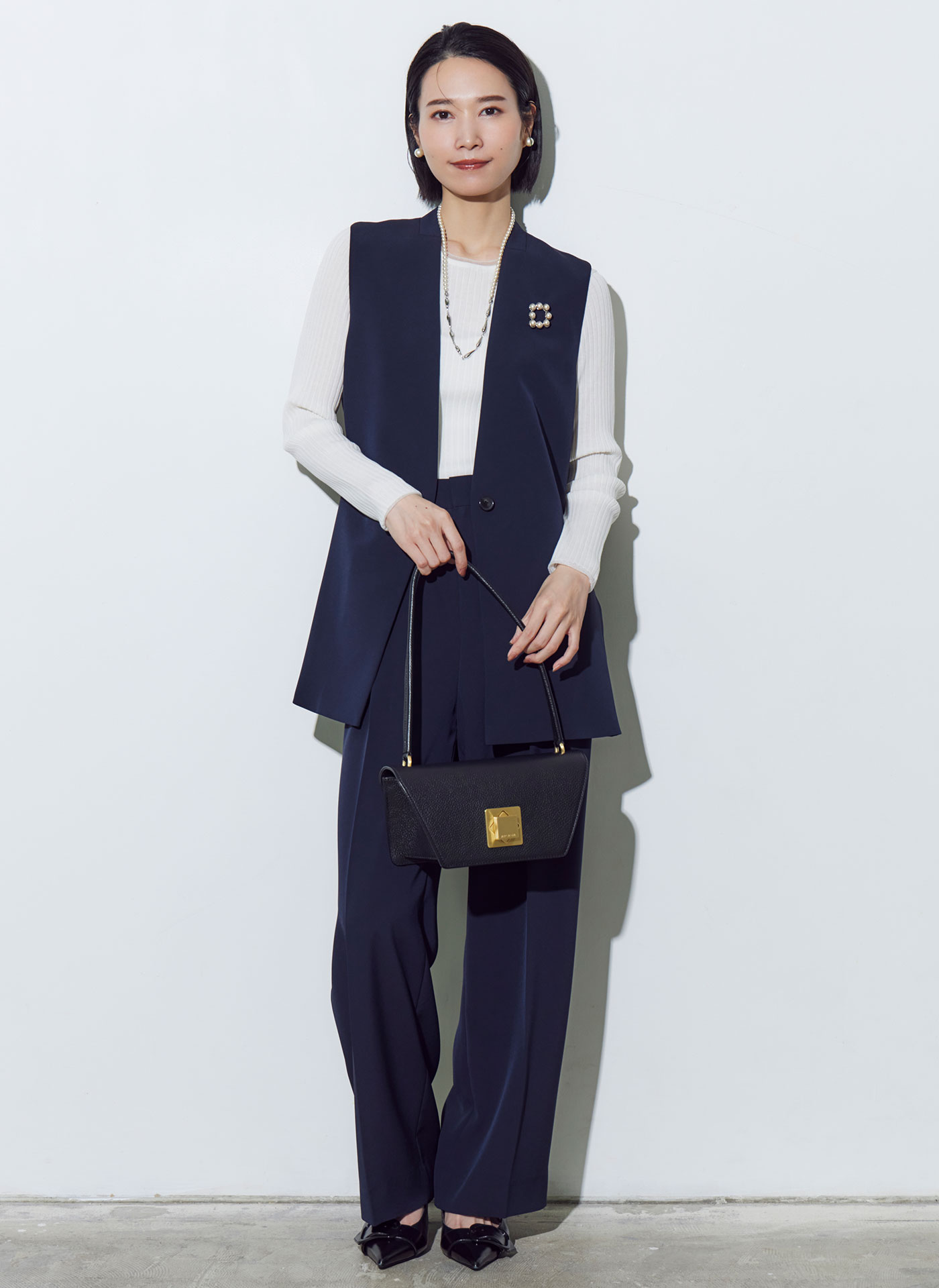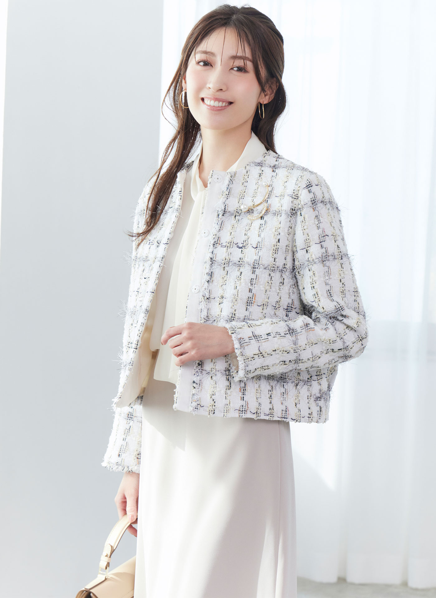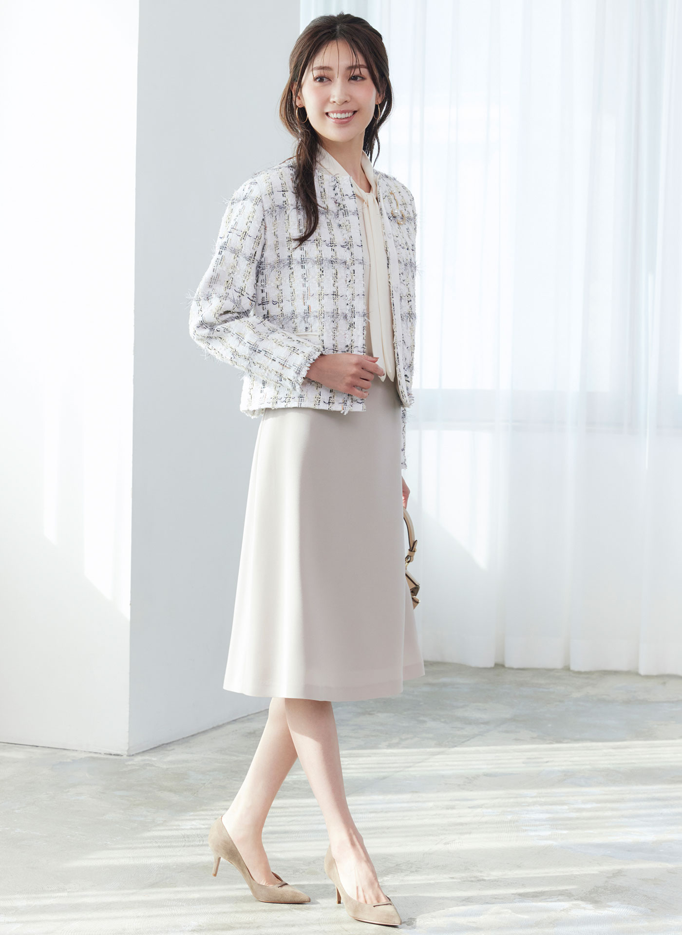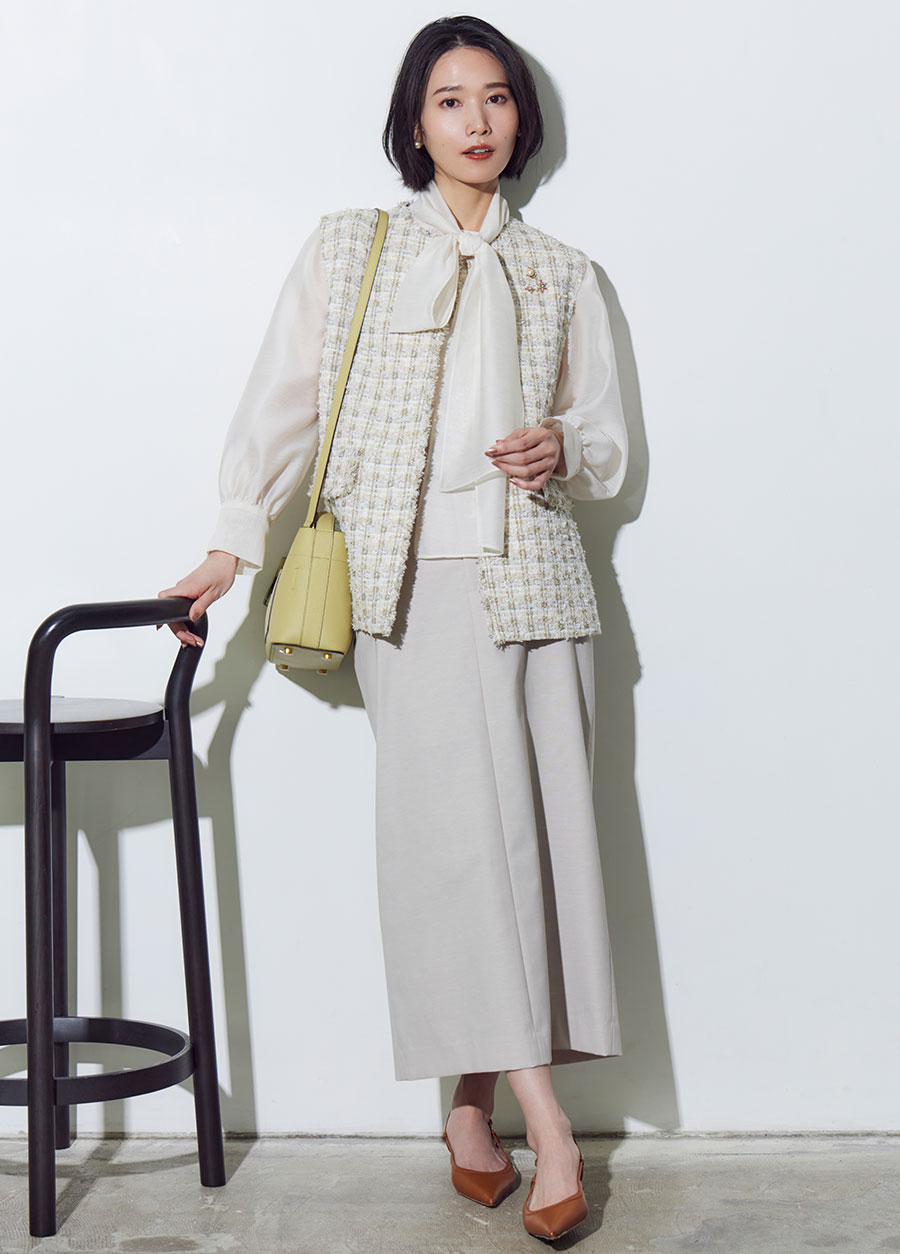 始まりのハレの日には、自分自身も思いきって華やかに!ツイードを主役に、インナーは同系色でまとめるのがポイント。ゆれるタイブラウスが柔らかな印象を与えます。トレンドのブローチで、大切な1日にさらに輝きをプラスして。