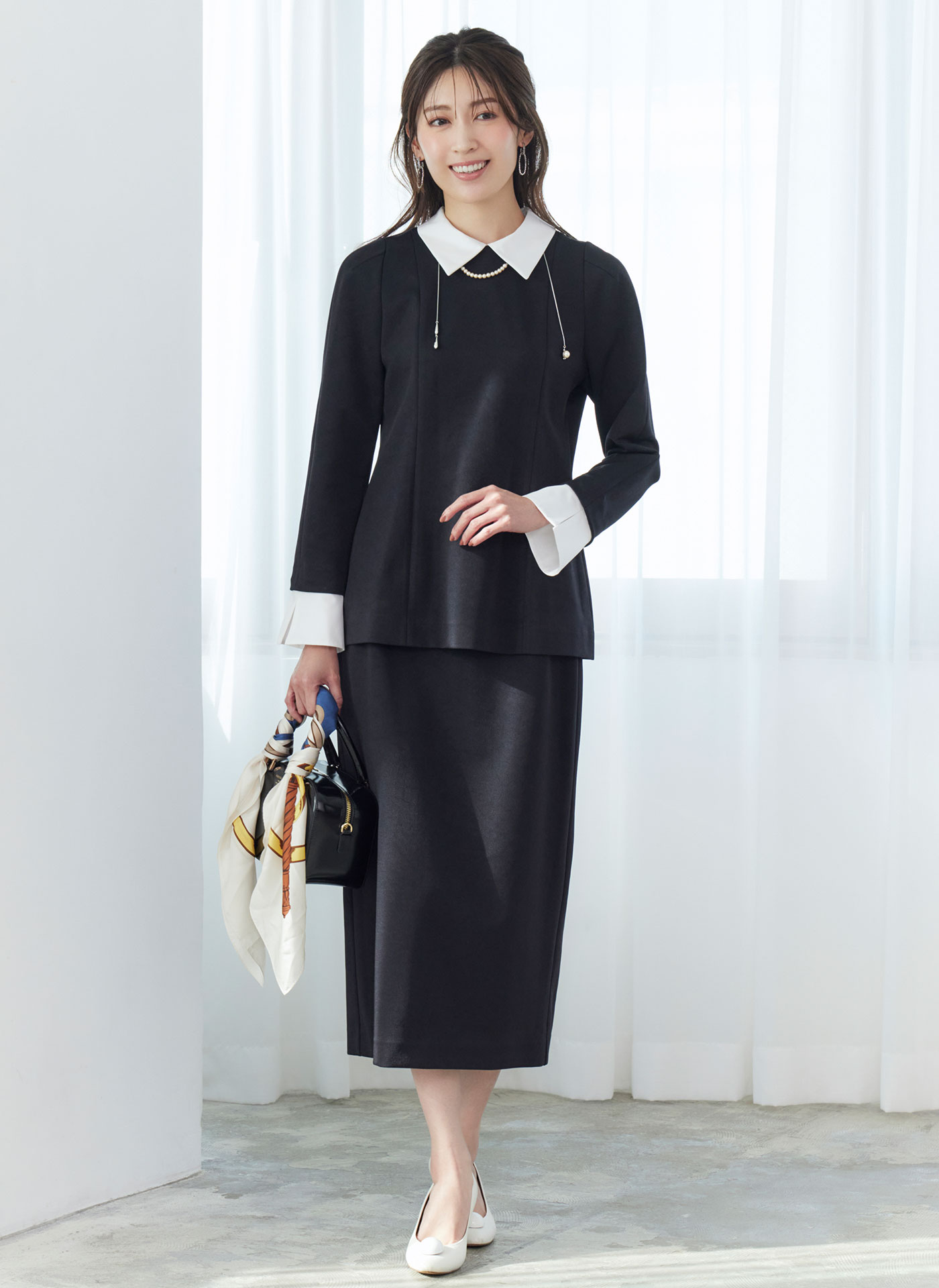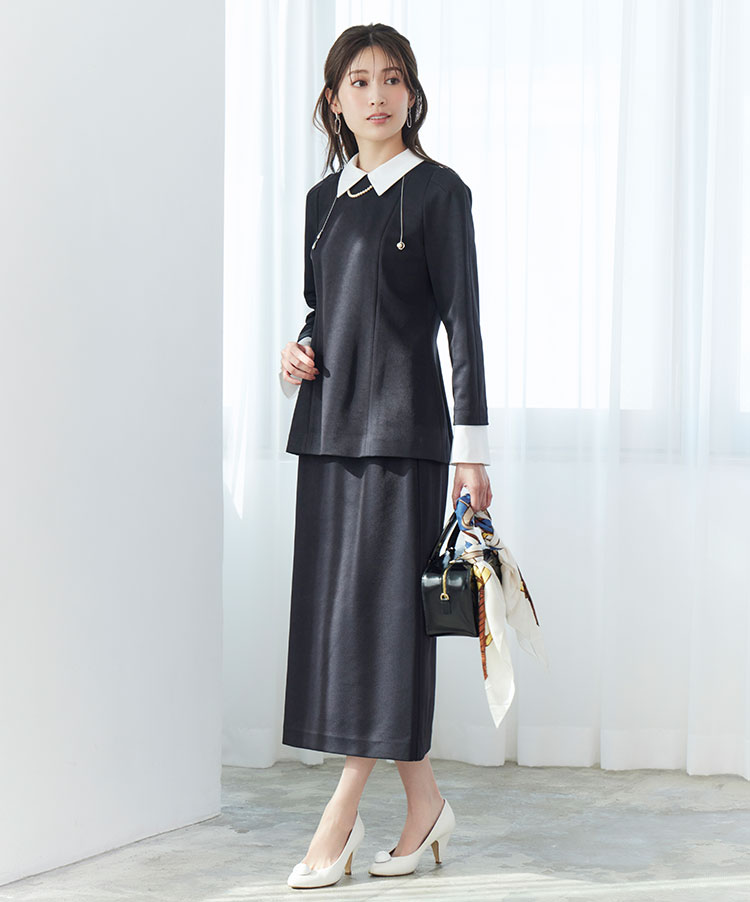 清潔感のある襟とふくらみのある女性らしいペプラムシルエットが魅力のトップスとハイウエストのデザインタイトスカートのセットアップ。衿と袖口が取り外しできる2WAY仕様になっています。スカートは後ろがギャザーゴムになっているため体にフィットしつつも着心地の良さを追求。