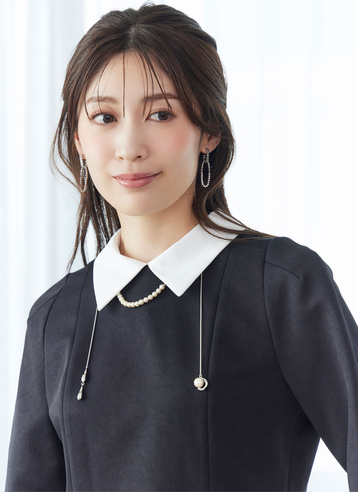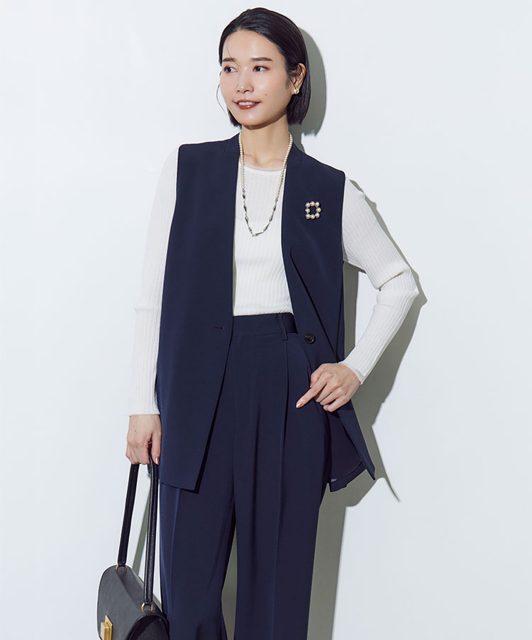 同素材のストレートパンツを合わせた、すっきりとしたTラインシルエットを意識したきれいめスタイリングは、ハレの日はもちろん、校内見学などもある学校説明会や文化祭など移動が多い日にもおすすめ。小物をパールで統一すれば、クールな中にもやわらかさのある表情に。
