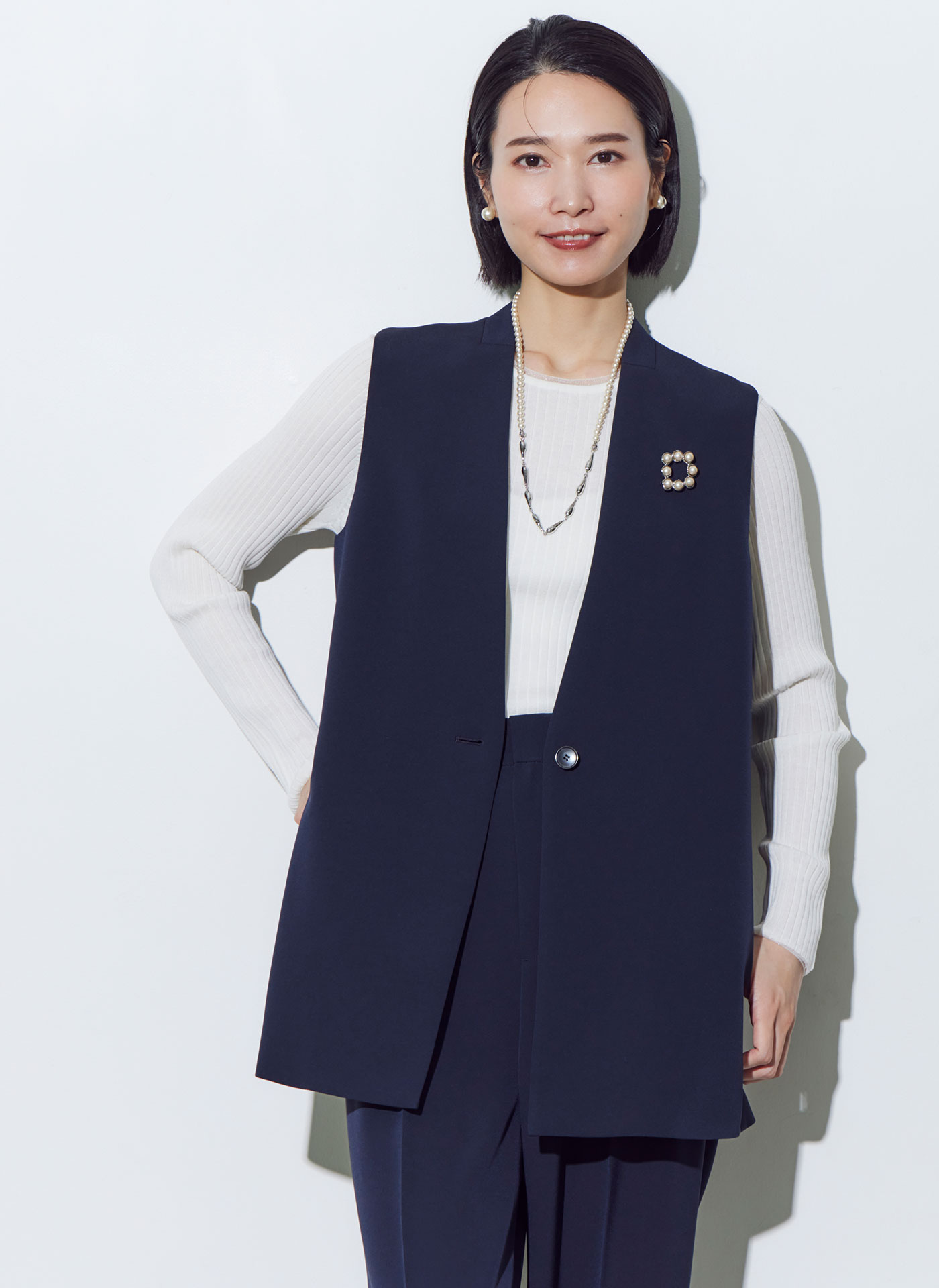 バックサテンジョーゼットを使用したフランドル定番のスーツシリーズから、カラーレスジレをピックアップ。深めのV開きに長めの着丈、うしろにフレアーを入れ、辛口な印象ながらも女性らしさをプラスしています。高めの位置につけられたボタンを留めればシルエットはすっきり、足長効果も。