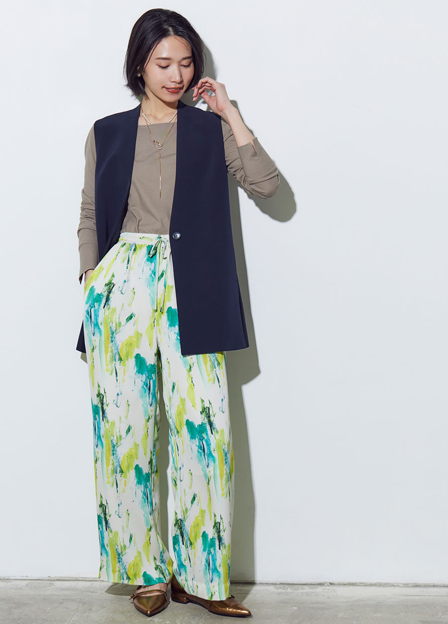 ジレのきちんとさはそのままに、トレンドのプリントボトムを合わせてリラックス感をプラス。子供の普段の姿を見たいから、ママも気負いしないスタイルを心がけたいもの。広すぎない程よいアームホールは、Tシャツなどのカットソーを合わせてもカジュアルになりすぎず、1年を通して長く着ることができるのが魅力。