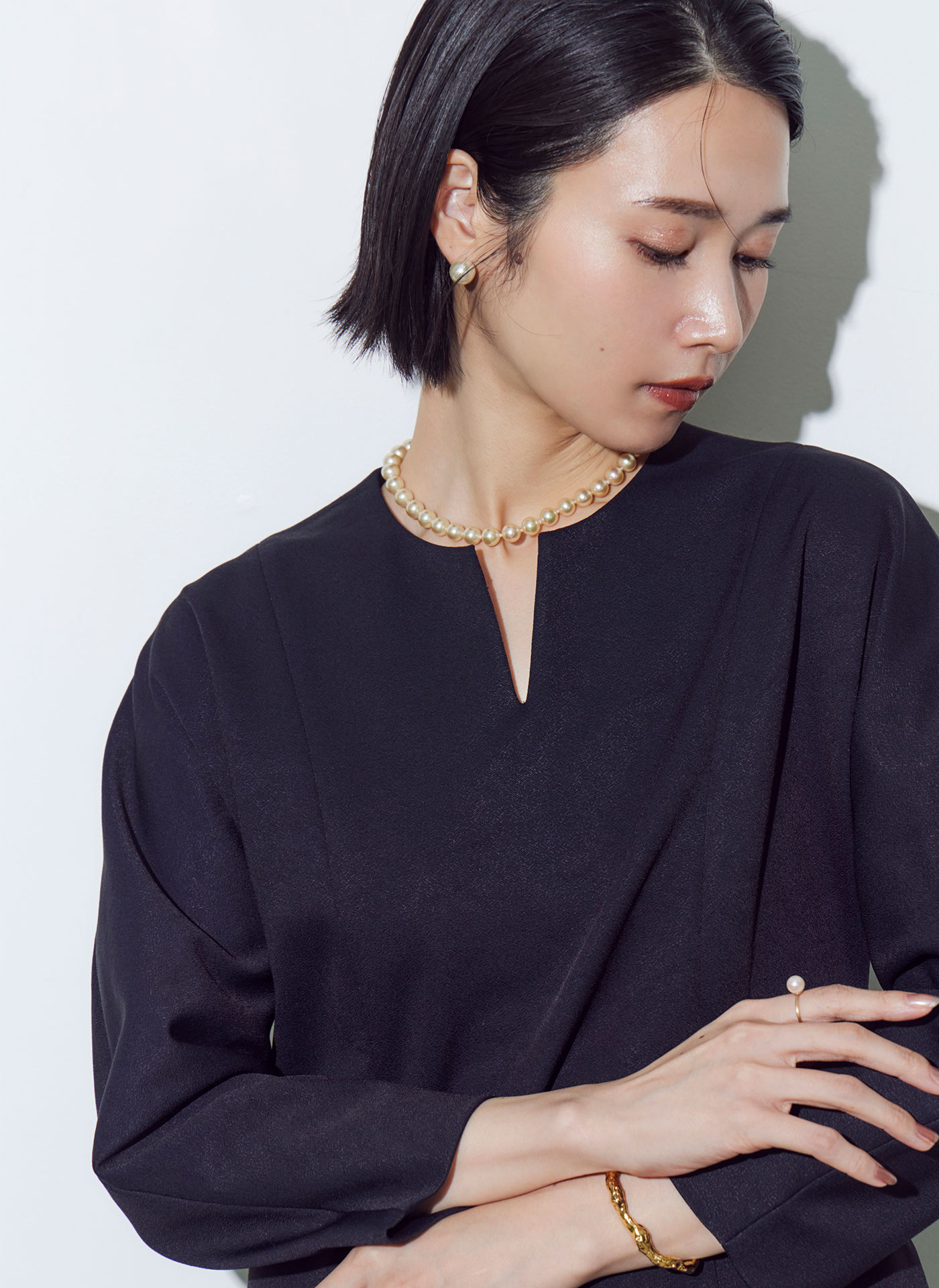 辛口な佇まいを一気に華やげてくれるフレアスリーブ、ボディラインを拾わないふんわりとしたシルエットにワンピース。ワントーンでありながら凛とした印象を与えるのは7‐IDconcept. ならでは。