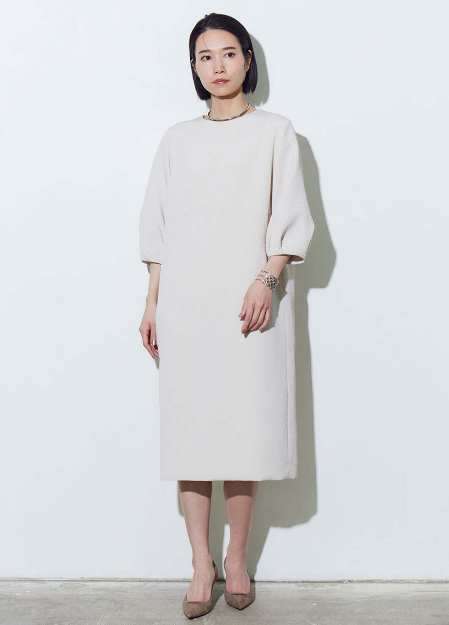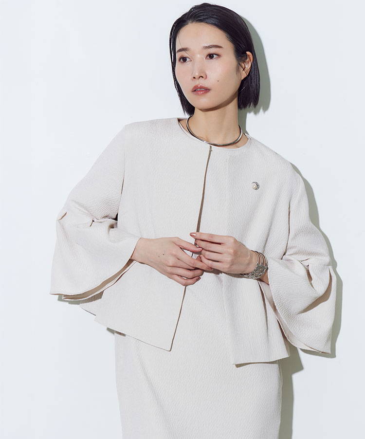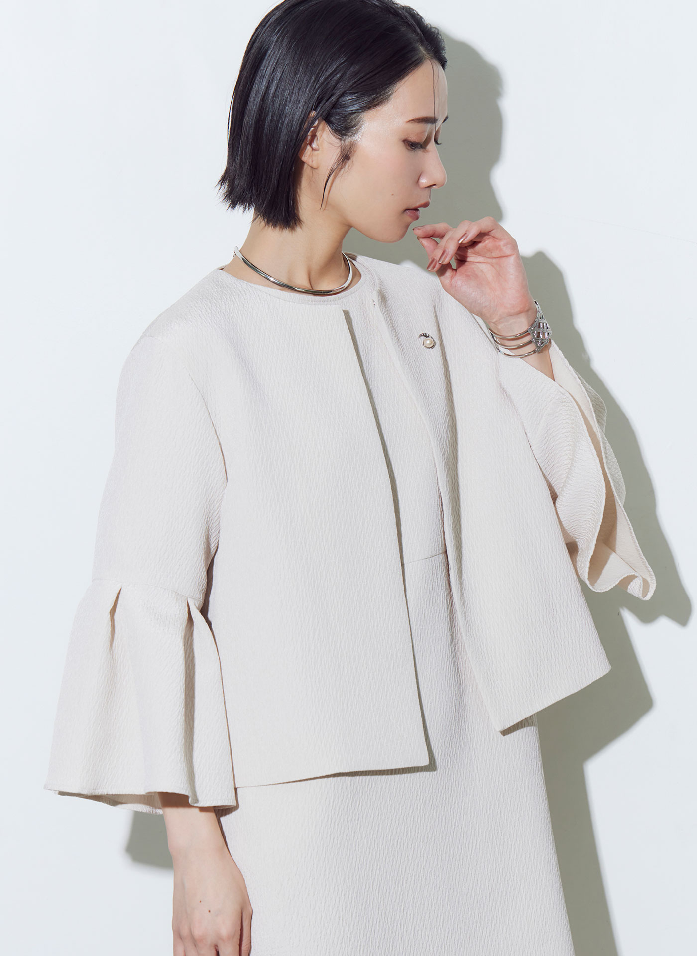 ふくれジャガードを使用した、構築感のあるパターンが魅力のジャケット&ワンピースのセットアップ。表面の繊細な凹凸とオフベージュカラーが、一気にモード顔にしてくれます。