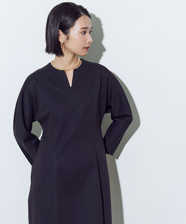 上品な光沢と丸みを帯びた構築的なフォルムが特徴的なワンピース。ハイウエストで目線が上がるデザインは足長効果もあり、ウエスト細見えも叶います。こだわりのキーネックは顔周りをすっきりと見せてくれ、スタイリッシュな印象に。