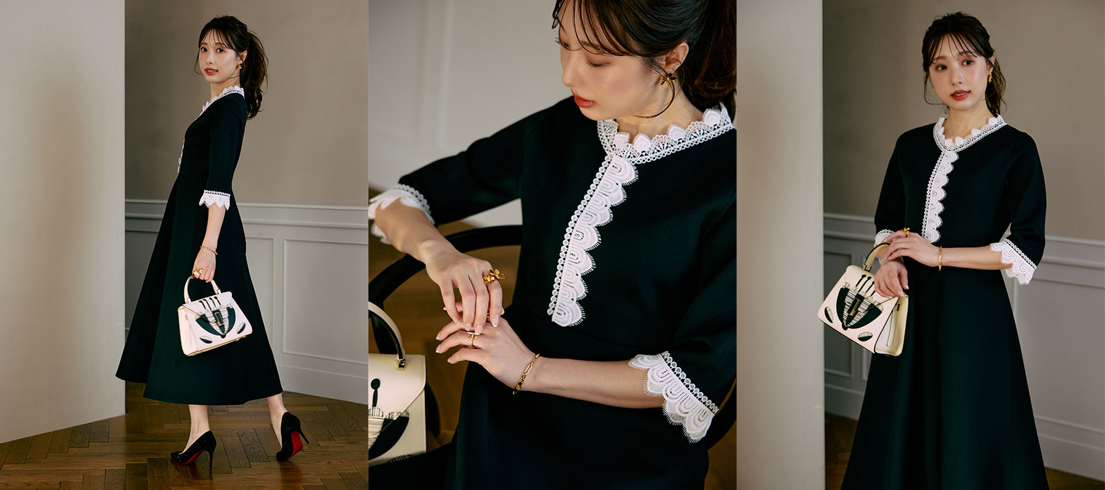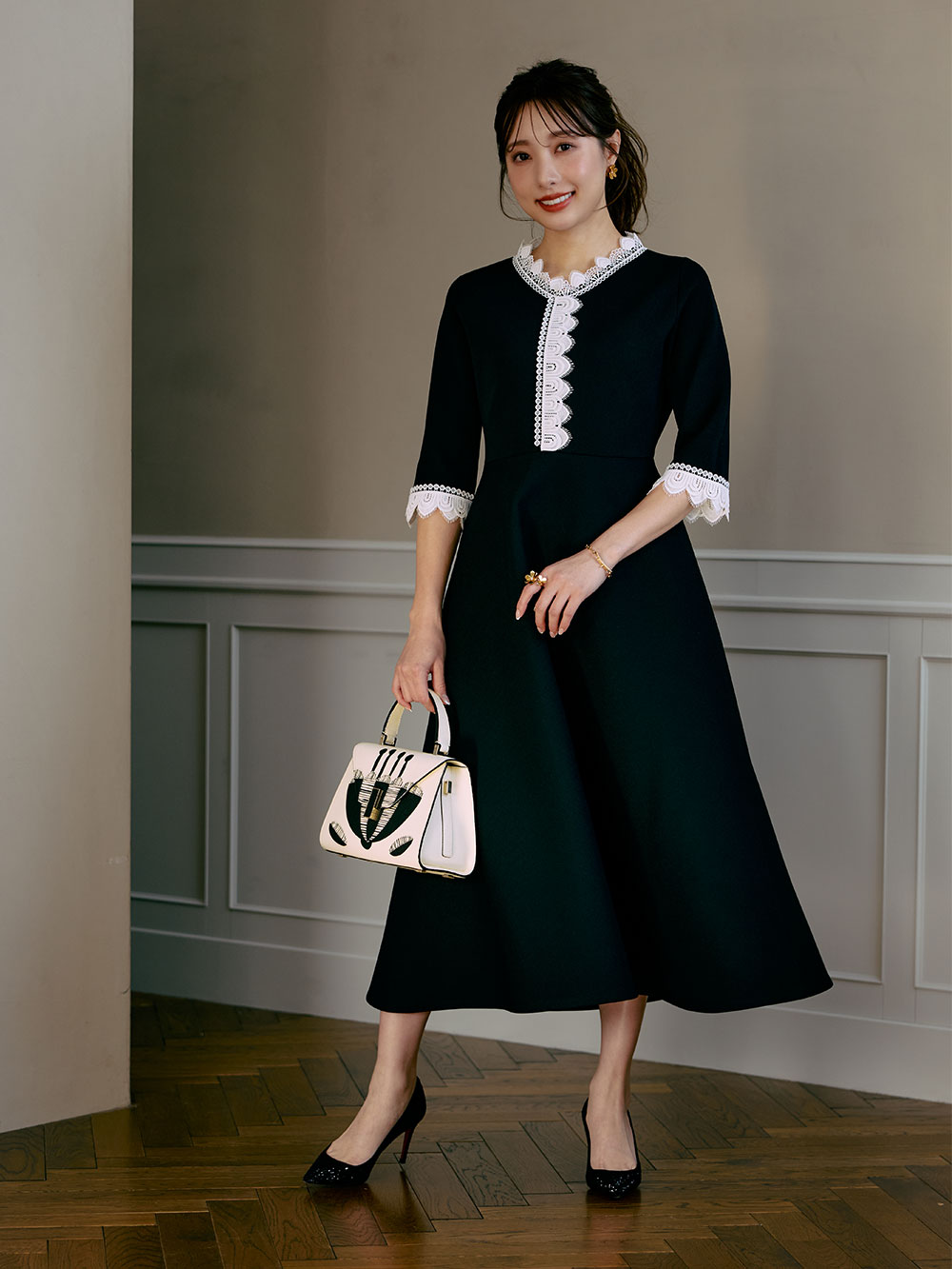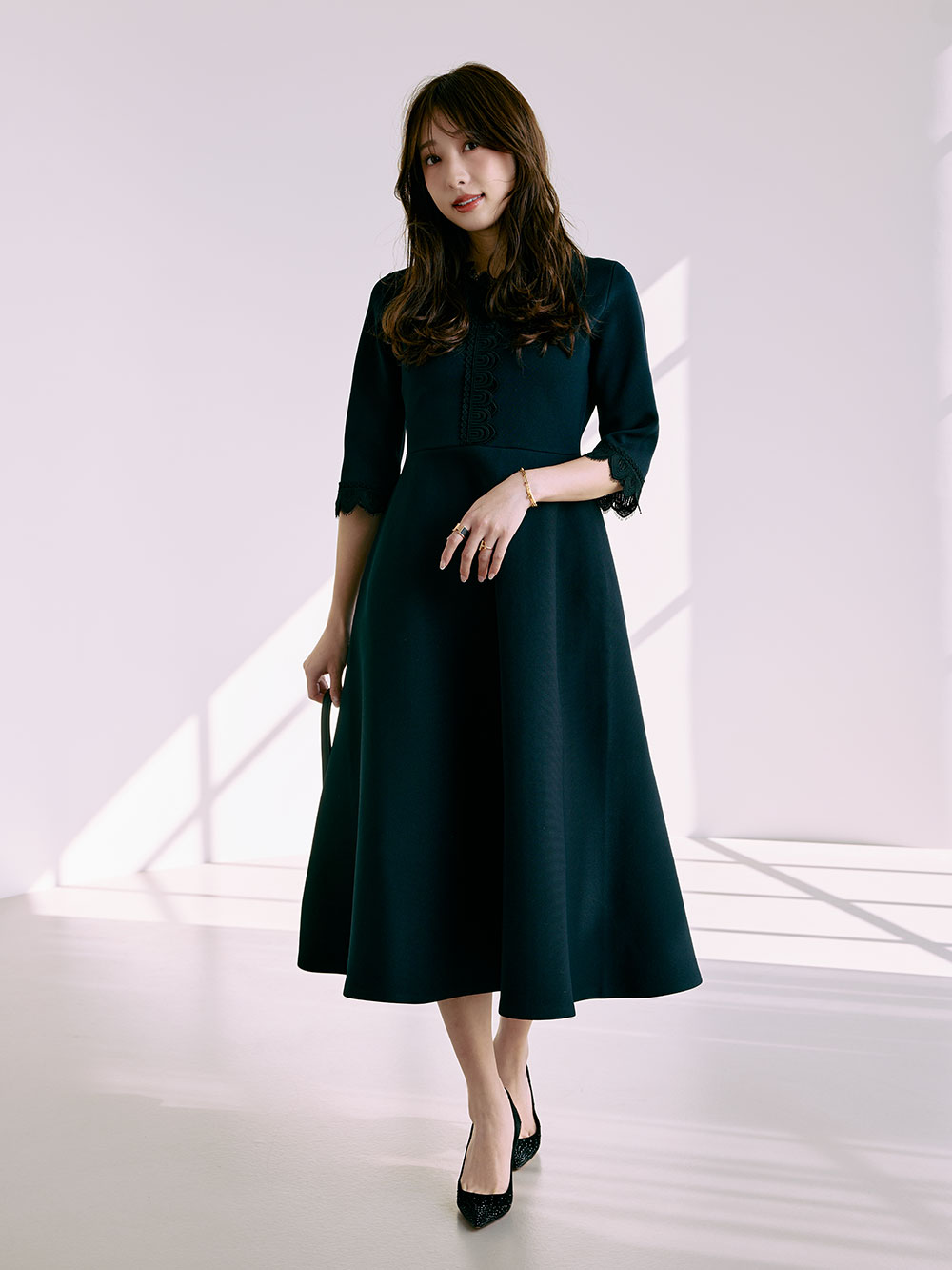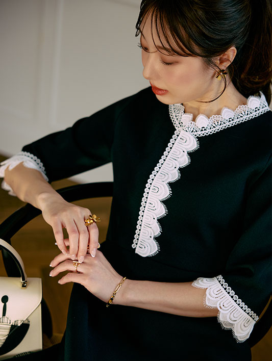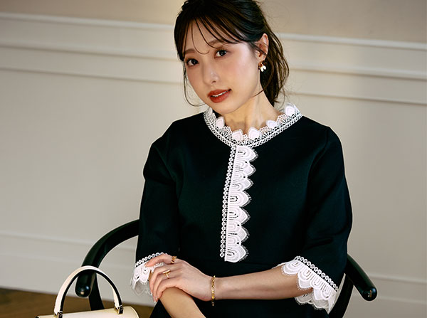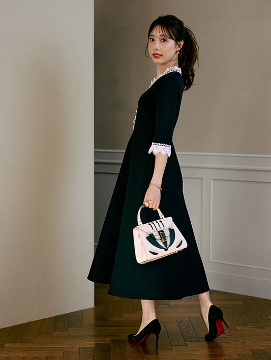 冨張さん一押しのカラー。ブラック×ホワイトレースのコントラストが、装いをぐっと華やかに。異なる3種類のレースを贅沢に重ね合わせた、こだわりの仕様。繊細さと奥行きを感じさせるレイヤードが、上品で印象的な存在感を演出します。さらに、ウエスト位置を高めに設定することで自然なスタイルアップを実現。たっぷりと分量を取ったフレアが優雅に広がり、女性らしさを引き立てる美しいフィット&フレアシルエットに仕上げました。