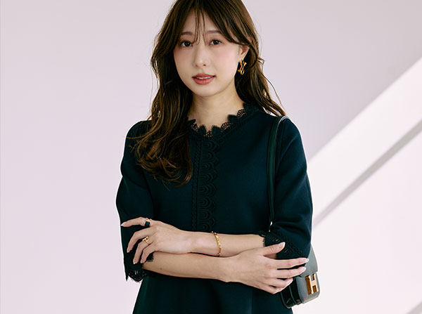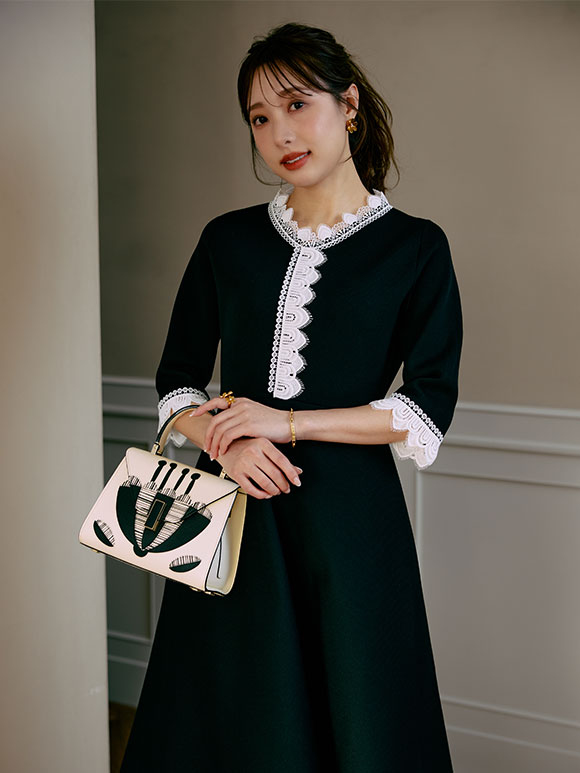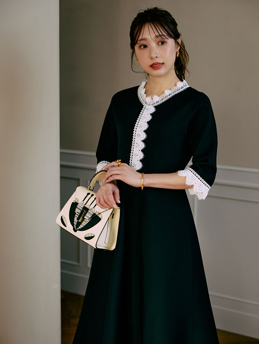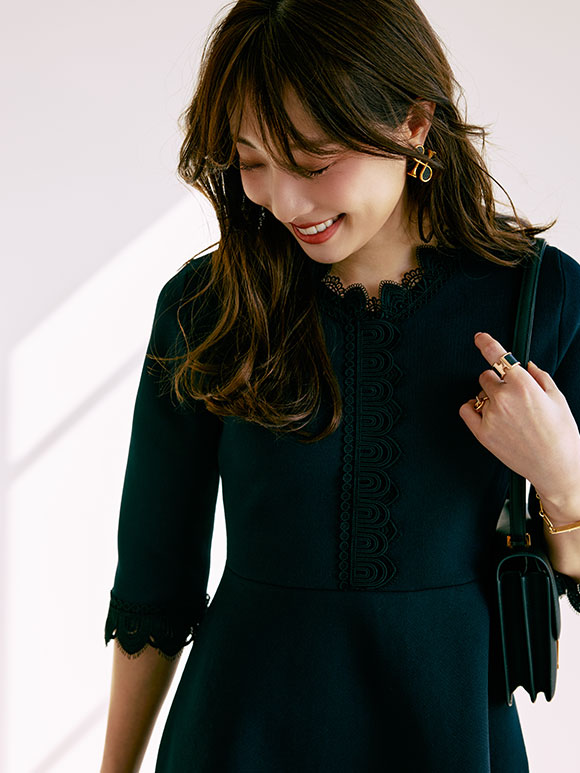 ネイビーカラーは、セレモニーやお食事会でも活躍する一枚です。ネイビーベースにブラックレースをさりげなくあしらい、上品な華やかさを演出。小物は黒でシックにまとめ、大人のモード感を引き立てます。こだわりのレースと、360°どこから見てもきれいなシルエットのワンピースは、着るだけで好印象です。きちんと感がありながらも着映える一着を、ぜひ手に取ってみてください。