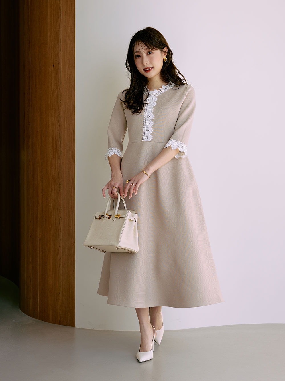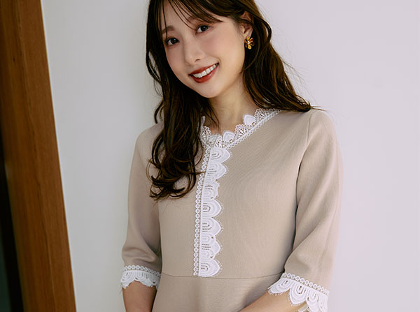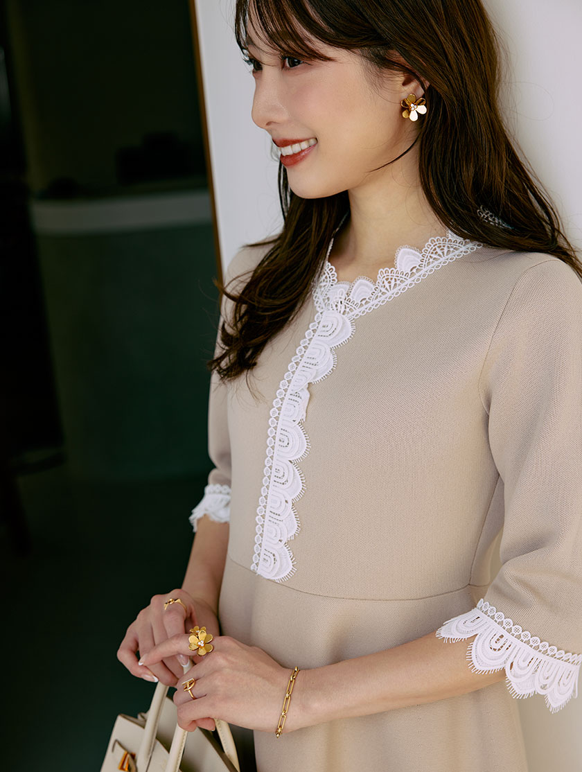 暗くなりすぎない、肌映りの良いミルクベージュをセレクト。久しぶりに選んだベージュのワンピースは、春の訪れを感じさせる新鮮なカラーです。ベージュ×ホワイトレースの組み合わせで、上品なフェミニンさをプラスします。スポンディッシュ素材ならではの伸縮性があり、着心地も抜群。小物を明るいカラーで揃えたワントーンコーデで、女子会にもぴったりの一枚です。