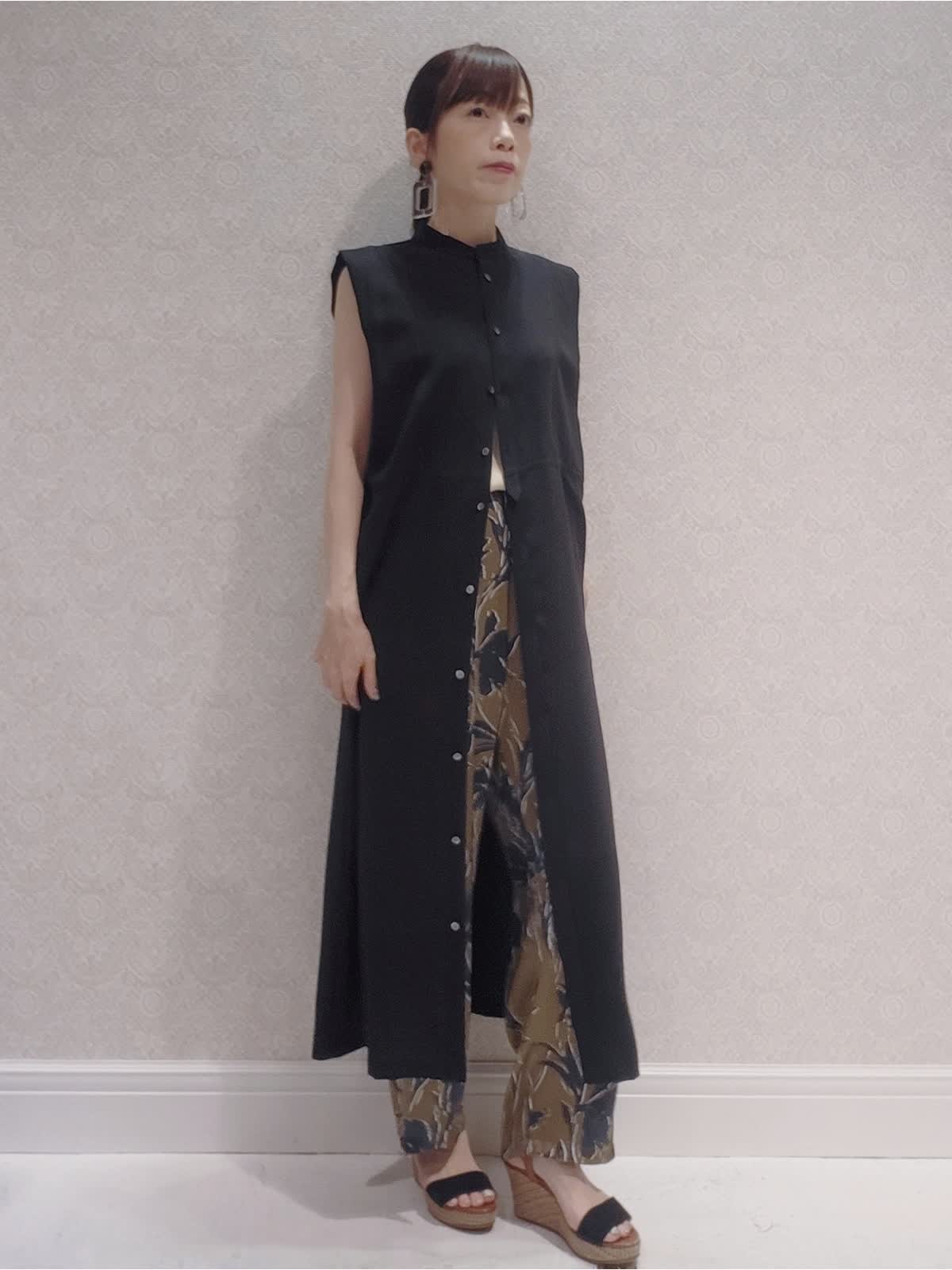 【着用サイズ】ワンピース:9号 パンツ:7号 【着用カラー】ブラウス:ブラック パンツ:モカチャ お出かけスタイル ワンピースはさらっとした着心地でシワになりにくく、前を開けてジレスタイルやボタンの留め方で色々な着まわしができお勧めです。 フラワー柄のパンツはウエストゴム、とても軽い履き心地でコーディネートのポイントになります。