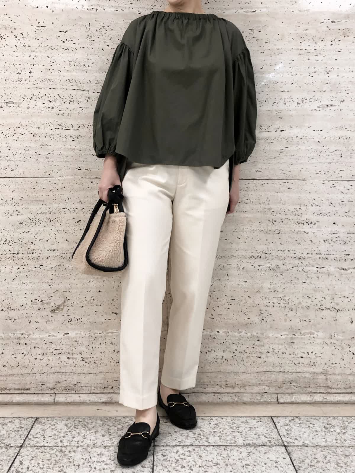 【着用カラー/サイズ】ブラウス:カーキ/フリー パンツ:ホワイト/11号 時短オシャレコーデ。大人可愛いゆるシルエットのブラウスは、着るだけでオシャレ上級者。バックリボンで首元の開き具合も調整できデコルテを綺麗に見せられます。オンオフ問わず万能なパンツは足を通せば納得の穿き心地で2.3枚は色違いで押さえておきたい逸品です。
